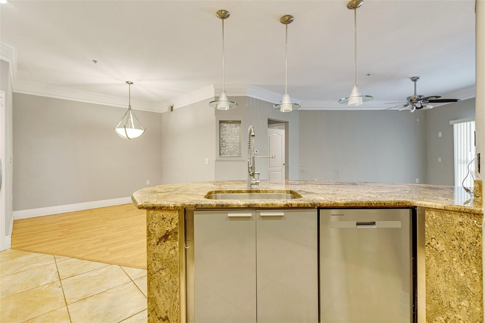 One or more photo(s) has been virtually staged. This first-floor condo offers three bedrooms and two bathrooms with a functional split-bedroom layout and comfortable living spaces throughout. The open living and dining area features crown molding, neutral paint, and a mix of laminate and tile flooring. The kitchen includes granite countertops, stainless steel appliances, ample cabinetry, a tile backsplash, and a curved island that provides additional prep and seating space. The primary bedroom features a walk-in closet and an en-suite bathroom with a walk-in shower. A screened-in lanai overlooks tropical landscaping and provides a relaxing outdoor space. Additional features include in-unit laundry and two exterior storage closets for added convenience. The monthly HOA fee covers water, sewer, trash, pest control, and exterior maintenance. Located in the gated community of Serenade at Palmer Ranch, residents have access to amenities such as two heated pools, a spa, fitness center, tennis courts, clubhouse, and playground. Conveniently located near shopping, dining, I-75, and Siesta Key Beach.