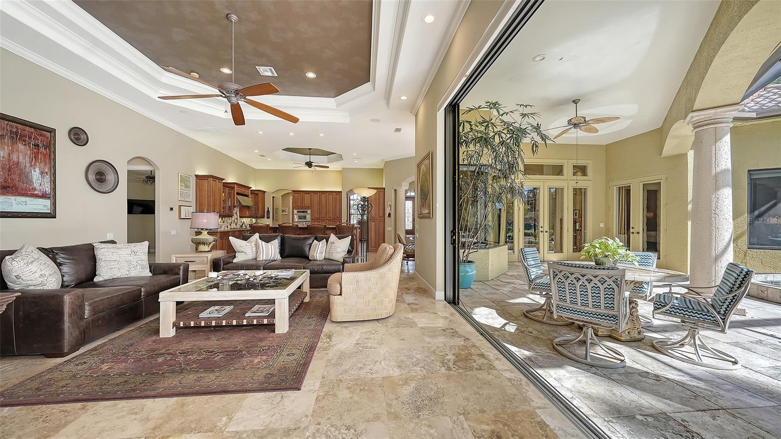 Stately custom residence located on a premier lakefront lot within The Enclave at Silver Oak, one of Palmer Ranch's popular communities. Originally built as a former model by Special Edition Custom Homes, the grand home reflects the highest quality of construction and architectural detail throughout. Welcoming covered entry with solid wood double doors and wrought iron open into soaring ceilings adorned with crown molding, rich trim work and tray and coffered ceiling designs. Large-format travertine stone flooring, 8-ft wood interior doors, custom-built closets in every bedroom, Hunter Douglas shades, and a surround sound system. Impressive open floor plan seamlessly connects elegant interior spaces with expansive outdoor living. Inviting living room with striking stone fireplace and built-ins and large French doors opening directly to the outdoor area. Entertaining is enhanced by a stylish wet bar, complete with beverage refrigerator, ice maker and custom wine cellar. A dedicated dining room is conveniently located adjacent to the living room and wet bar. Chef's gourmet kitchen showcases rich custom wood cabinetry with under-cabinet lighting, pull-out shelving/drawers, granite countertops, mosaic tile backsplash, and professional-grade KitchenAid appliances, including a six-burner gas range. Built-in planning center/desk, plus a breakfast nook with expansive aquarium window overlooking the pool and lake. The adjoining family room features floor-to-ceiling multi-panel sliding glass doors on 2 walls that open fully to the outdoors. Dedicated office with built-in desk system and powder bath for guests. The primary suite is a luxurious retreat with separate his-and-her custom closets and a spa-inspired bathroom with dual split vanities, ample granite counters and storage space, oversized soaking tub, large walk-in shower, and a private water closet with both a standard toilet and a standalone bidet. The split-bedroom floor plan ensures privacy, with two bedrooms sharing a Jack-and-Jill bathroom, along with two additional bedrooms (the 5th could be a flex/game room or 2nd office) and a full bath. A spacious laundry room provides direct access to the three-car side-entry garage with built-in storage. Outdoor living is exceptional, highlighted by a vanishing-edge pool with integrated spa and natural stone overflow, surrounded by expansive travertine decking. The fully equipped outdoor kitchen includes a gas grill, sink, and beverage refrigerator, while a large covered lounge area with custom-built stone fireplace creates the perfect setting for entertaining. Fully enclosed with a bronze screen and framed by lush Florida landscaping and serene lake views. Silver Oak is a 24-hour guard-gated community with no CDD fees and includes lawn maintenance. Ideally located in the heart of Palmer Ranch, just steps from the Legacy Trail and minutes from shopping, dining, golf, entertainment, and world-famous Siesta Key Beach. Please note, the structure is not in a flood zone, see notes from county and insurance company.