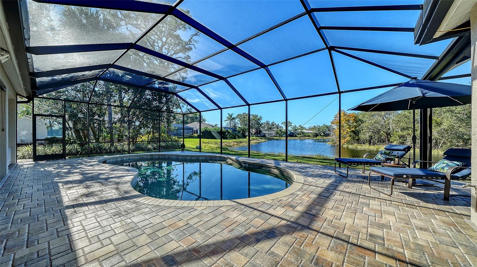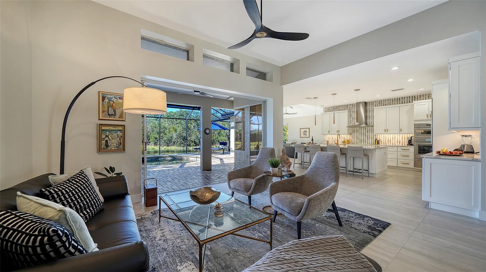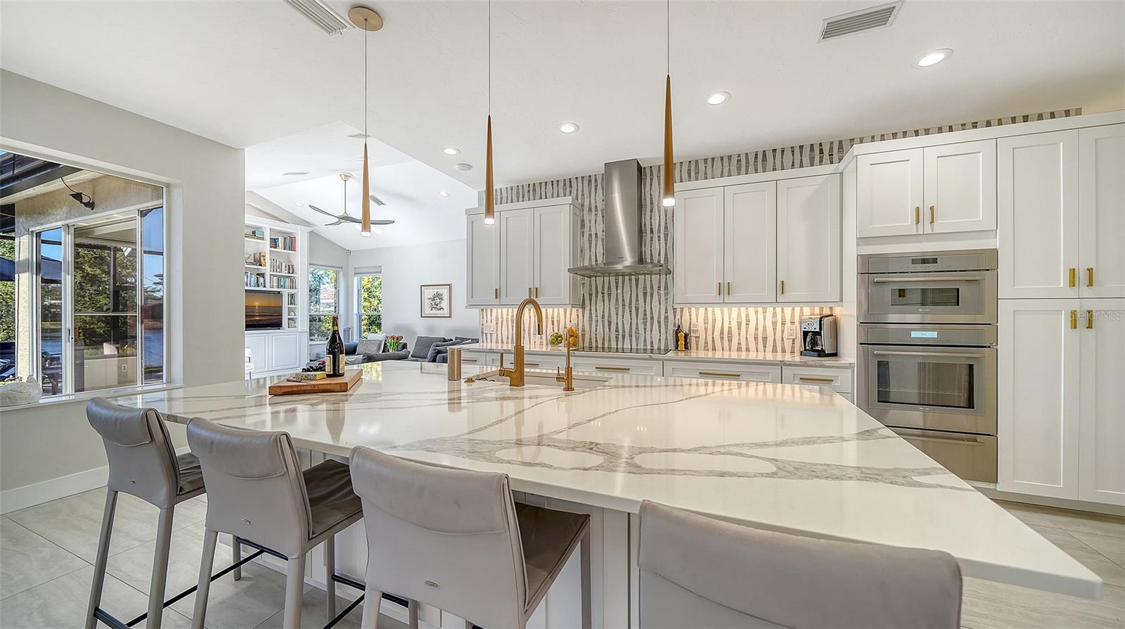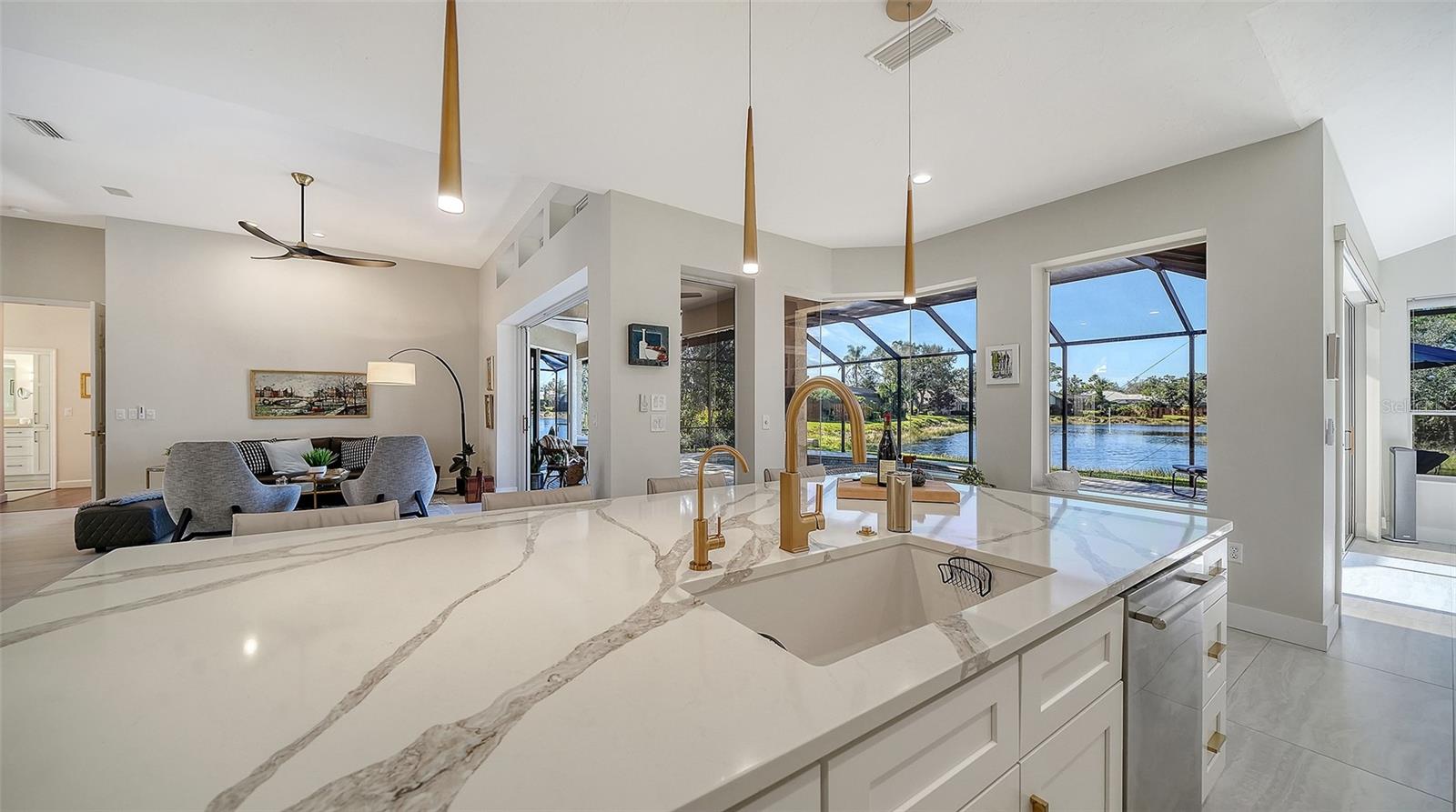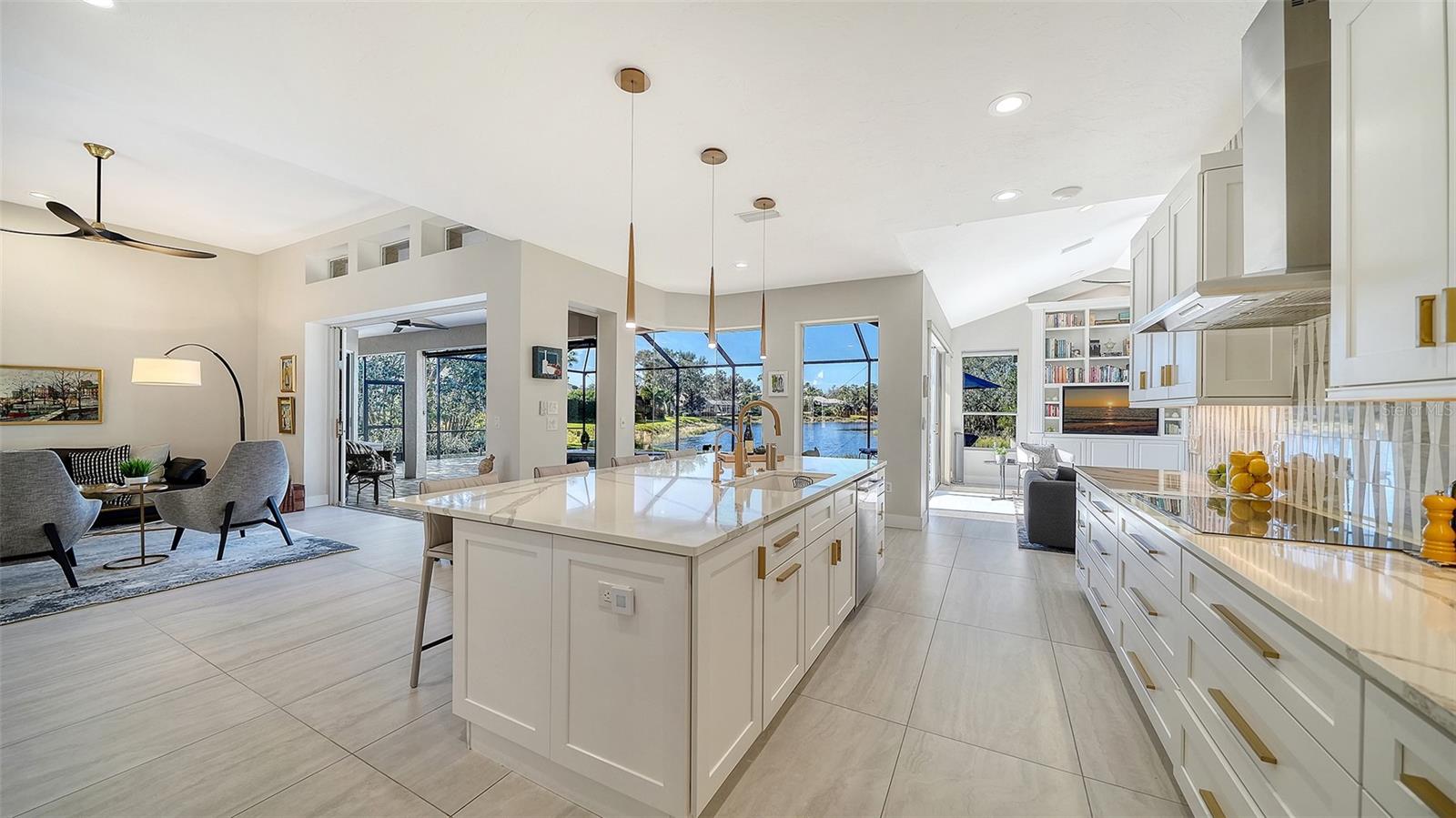 Under contract, (multiple offers) accepting backup offers. Experience refined Sarasota living in this updated four-bedroom, two-bath residence in the Deer Creek community. Italian tile flooring throughout the main living areas enhances the open design while complementing abundant natural light. The owners restructured the floor plan by removing select interior walls to create expanded gathering spaces designed for entertaining and to maximize panoramic water views. The enhanced layout improves sightlines and flow throughout the main living areas. A gourmet kitchen features a designer Italian marble backsplash, quartz countertops and an expansive center island, complemented by premium Thermador appliances including an induction cooktop. The open configuration supports both everyday living and easy entertaining. The luxurious quartz continues into the family room bar and rises along the wall for a beautiful seamless finish. A custom built-in bookcase and television unit anchors the family room with integrated storage. Quartz countertops are also featured in the laundry room, creating consistency across the living spaces. Positioned to capture expansive open-water views, the residence offers privacy and a tranquil setting from multiple vantage points. Major system updates include a tile roof in 2018, AC in 2019 and water heater in 2022. Additional interior enhancements include all new interior door hardware, updated lighting fixtures and ceiling fans throughout the residence, contributing to a cohesive fresh interior aesthetic. Outdoor living areas have been upgraded with pavers throughout the entire pool deck and the pool cage has been repainted and rescreened. The outdoor area offers covered space for dining, entertaining or relaxing with premium water views. Located in the Deer Creek community of Sarasota, this residence combines upgraded finishes, privacy and seamless indoor-outdoor living. The fourth bedroom is currently utilized as an office.