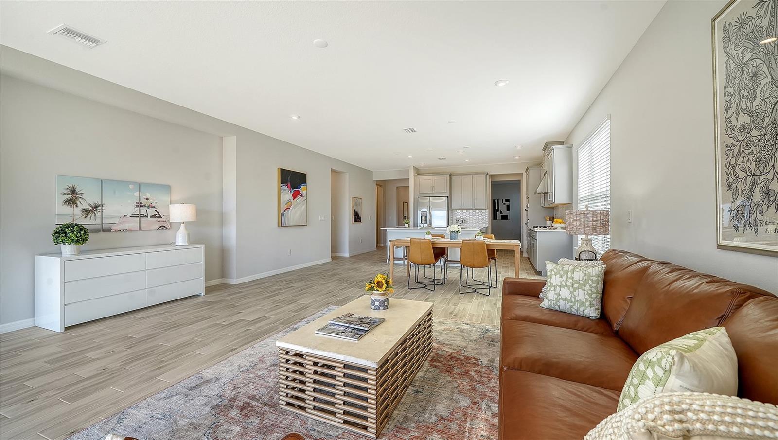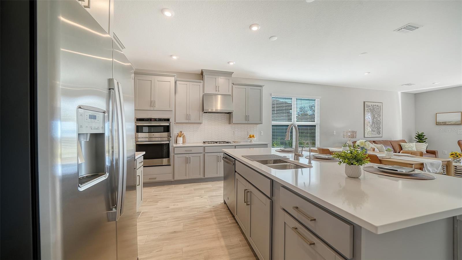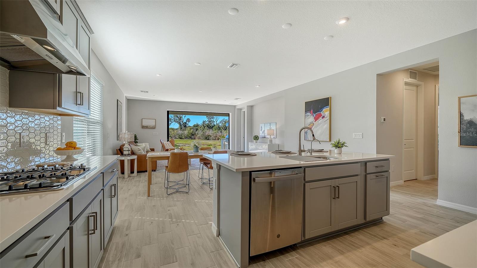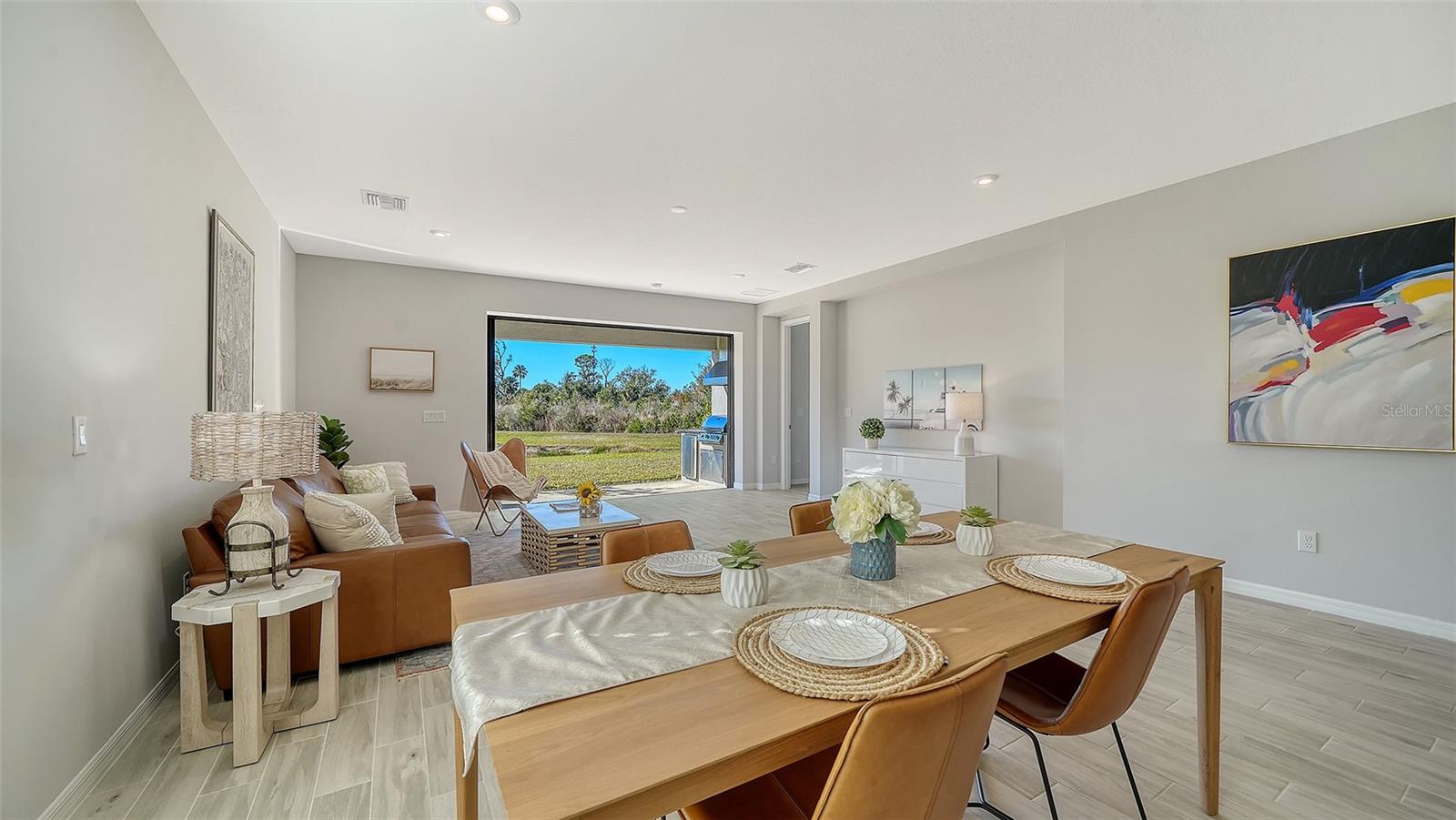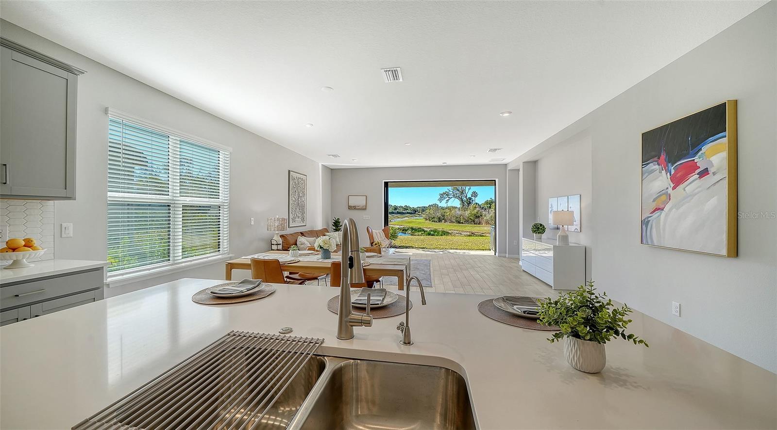 Welcome to the largest single-story floor plan in Palmero, offering modern design, thoughtful upgrades, and exceptional privacy. This beautifully maintained 4-bedroom, 3-bath home is move-in ready and shows like new, having been used only two winters as a seasonal residence. The property has been routinely monitored and cared for, including a new refrigerator and dryer, and features smart upgrades such as a garage door opener with keypad and smart thermostat.Situated on a private lakefront homesite with no homes in front or behind, this premium lot offers peaceful water views and rare privacy. The spacious backyard allows room for a future pool and expanded outdoor living. An upgraded outdoor kitchen with vented hood, gas grill connection, refrigerator, and sink is already in place. Pocket sliding glass doors open to the lanai for seamless indoor-outdoor living, and fencing is permitted. Flood insurance is not required.Inside, high ceilings, an open-concept one-story layout, and upgraded tile flooring throughout the main living areas create a bright and welcoming environment. LED lighting enhances the living room, while the kitchen, dining, and living spaces flow effortlessly--ideal for both entertaining and everyday living. The gourmet kitchen features quartz countertops, stainless steel appliances, a designer backsplash, soft-close cabinets and drawers, upgraded fixtures, a large center island, walk-in pantry, and an exterior-vented range.A flexible bonus room provides options for a home office, formal dining room, or additional living space. The primary suite offers lake views, a tray ceiling, oversized walk-in closets, a soaking tub, and a separate walk-in shower. A centrally located laundry room and a linen closet in the second bathroom add everyday convenience.Located in Palmero, a gated community with resort-style amenities including a heated pool and spa, dog park, fire pits, basketball and sand volleyball courts, and a 1.34-mile nature trail. Low HOA fees and no CDD.Ideally positioned between Sarasota and Venice, just 3.4 miles to Nokomis Beach, and close to parks, the Legacy Trail, shopping, medical facilities, and major roadways including US-41 and I-75.Stylish, low-maintenance, and well-appointed--this home delivers the best of Florida living.