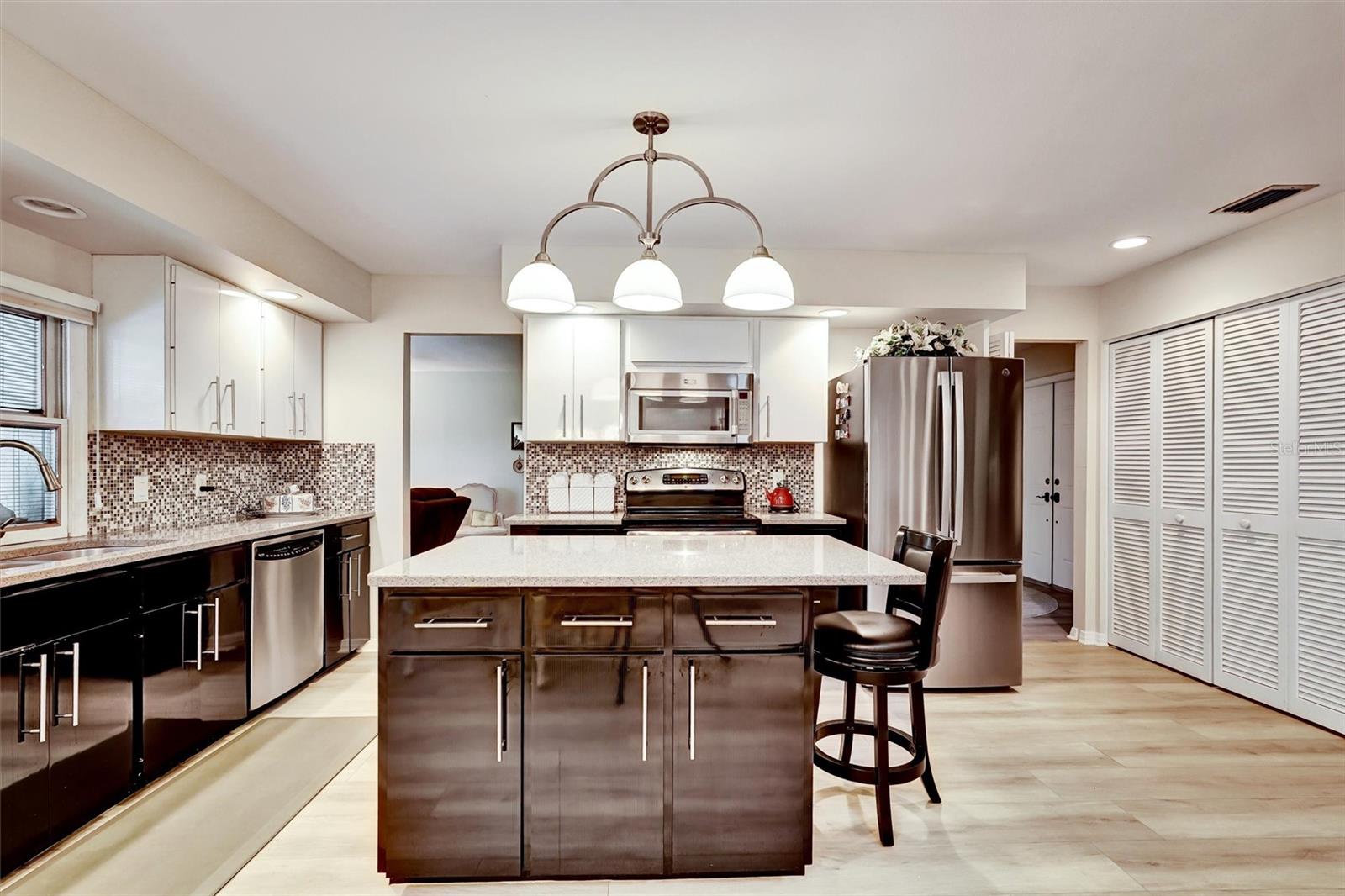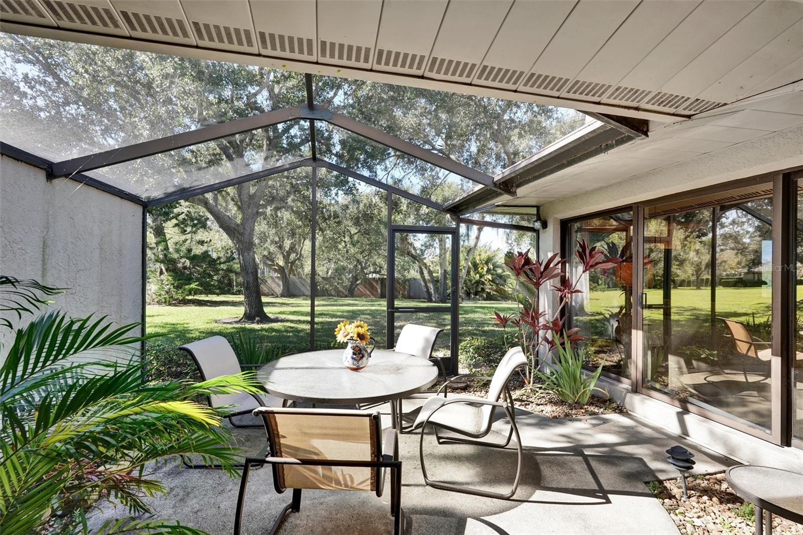 Lovely 2 bedroom, 2 bath villa conveniently located in Lakeshore Village, a 55+ pet friendly community. This home enjoys a unique, very private setting with a large "backyard" overlooking Mirror Lake. This villa has been repiped and offers an updated kitchen and bathrooms, a new air conditioner, hot water heater, refrigerator, newer flooring, pella windows, and a brand new roof. Cooks will love the oversized kitchen with quartz countertops, a wet bar, desk, tubular skylight, and a breakfast nook overlooking one of the two private lanais where you can sip your morning coffee while enjoying nature and the wildlife in the lake. From the light and bright filled living room you can access the other lanai where you can unwind after a long day with a cold beverage and watch the sun set over the lake. The master bedroom has a large walk in closet with built ins, and offers access to the covered lanai overlooking Mirror Lake also features a barn door that allows for separation and privacy from the updated ensuite bathroom. The two car garage features an epoxy floor and extra storage cabinets. For $200.00 per year, residents of Lakeshore Village South can access the amenities at Lakeshore Village which includes an active social calendar, community pool, clubhouse, tennis courts and pickleball courts. Seller has never used the fireplace. Some furniture is available under separate agreement. Exclude master bedroom and living room window treatments and washer and dryer.