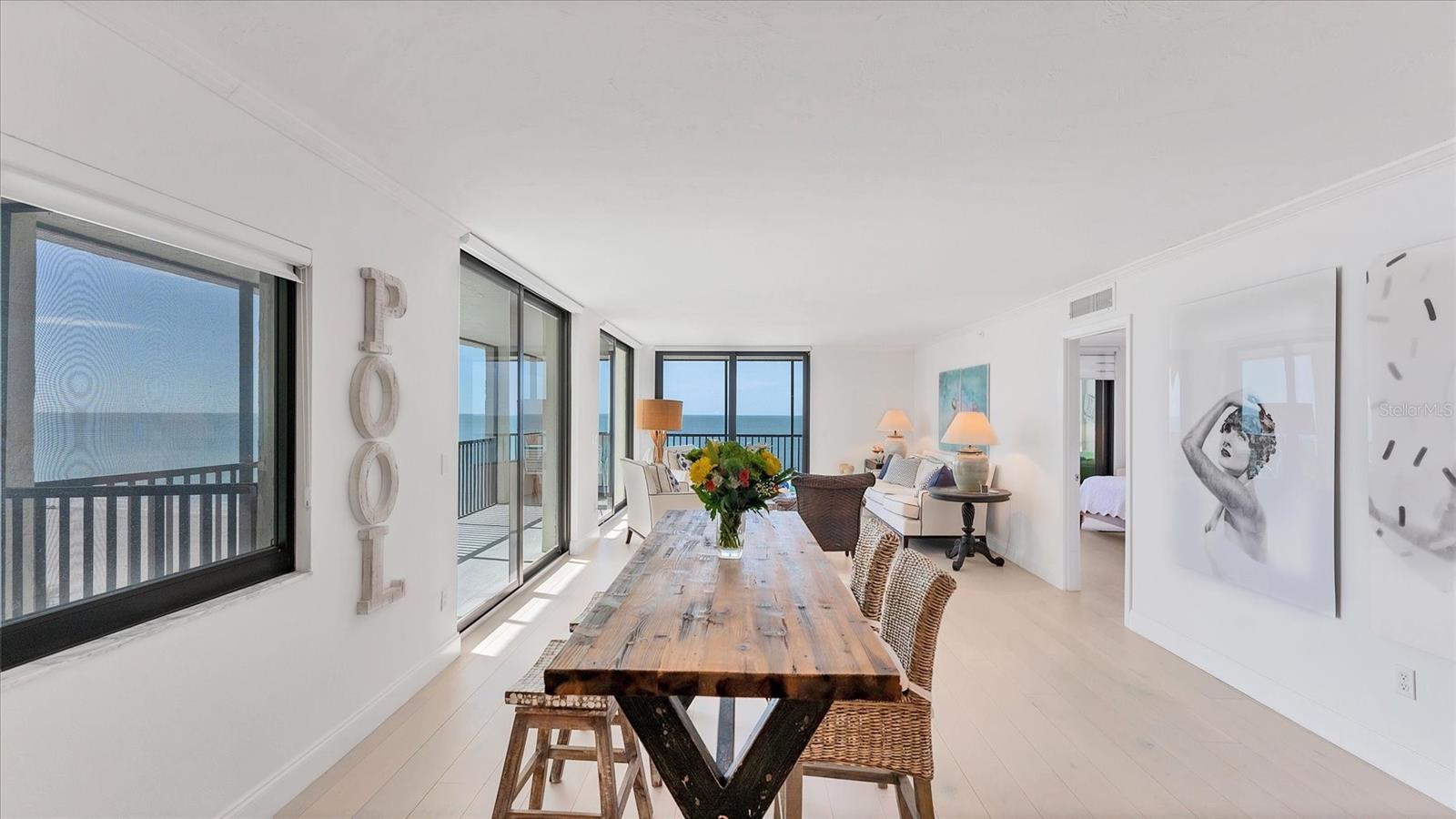 BREATHTAKING, SWEEPING DIRECT GULF VIEWS set the stage for this spectacular corner, beachfront residence at the highly coveted Lido Surf & Sand. Perched on the 6th floor with a prized southwest exposure, this immaculate condo offers a front-row seat to Sarasota's iconic turquoise waters and unforgettable sunsets--all you need to bring is your swimsuit.From the moment you enter, your eyes are drawn to the Gulf, visible from nearly every room through floor-to-ceiling, high-impact sliding glass doors that bathe the home in natural light. This European-inspired residence features 2 bedrooms, 2 baths, and 1,494 square feet of thoughtfully designed living space, ideal for relaxed coastal living and effortless entertaining.The pass-through kitchen enhances the open layout, allowing you to prepare meals and gather with guests while never losing sight of the water. The spacious great room is accented by white oak wood floors and elegant crown molding, beautifully framing the endless Gulf backdrop. The en-suite primary suite offers a walk-in closet and direct access to the expansive nearly 400-square-foot wraparound balcony, recently resurfaced with modern oversized tile--an idyllic setting for year-round sunset views. The inviting guest suite is also en-suite and includes its own walk-in closet.Lido Surf & Sand delivers true resort-style living with a newly built Gulf-front heated pool and spa, poolside BBQ area, fitness center, shuffleboard, and a soon-to-be-completed social room. Additional conveniences include in-unit laundry, assigned covered parking, and a private storage unit. Enjoy direct access to the recently refurbished white-sand beach--perfect for morning walks, dolphin watching, and evening strolls. Just steps away, the nearby Rosewood Residences and adjacent protected nature preserve offer kayaking, paddleboarding, fishing, and scenic nature trails.Located minutes from walkable distance to St. Armands Circle's upscale boutiques and acclaimed dining, and a short drive to downtown Sarasota's vibrant arts, culture, and world-class restaurants, this is beachfront living at its finest--effortless, elegant, and unmistakably Florida.