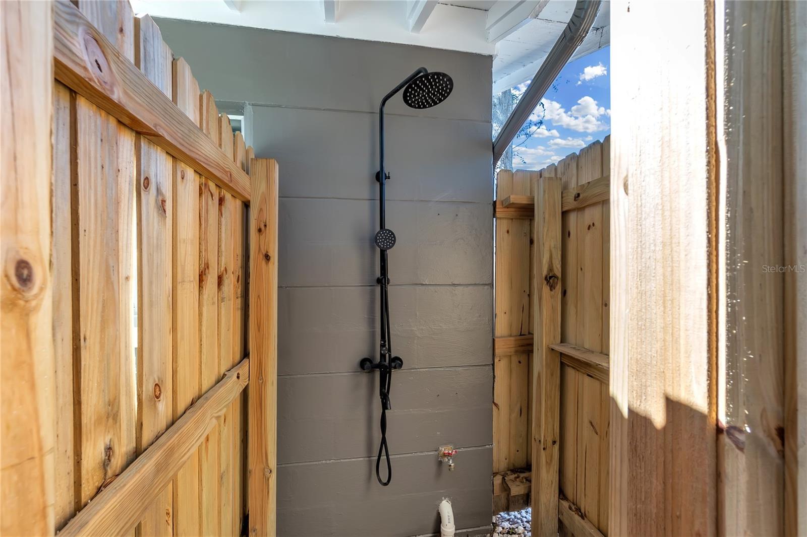 Exterior: Fire Pit, Outdoor Shower, Rain Gutters, Sidewalk, Sliding Doors, Storage