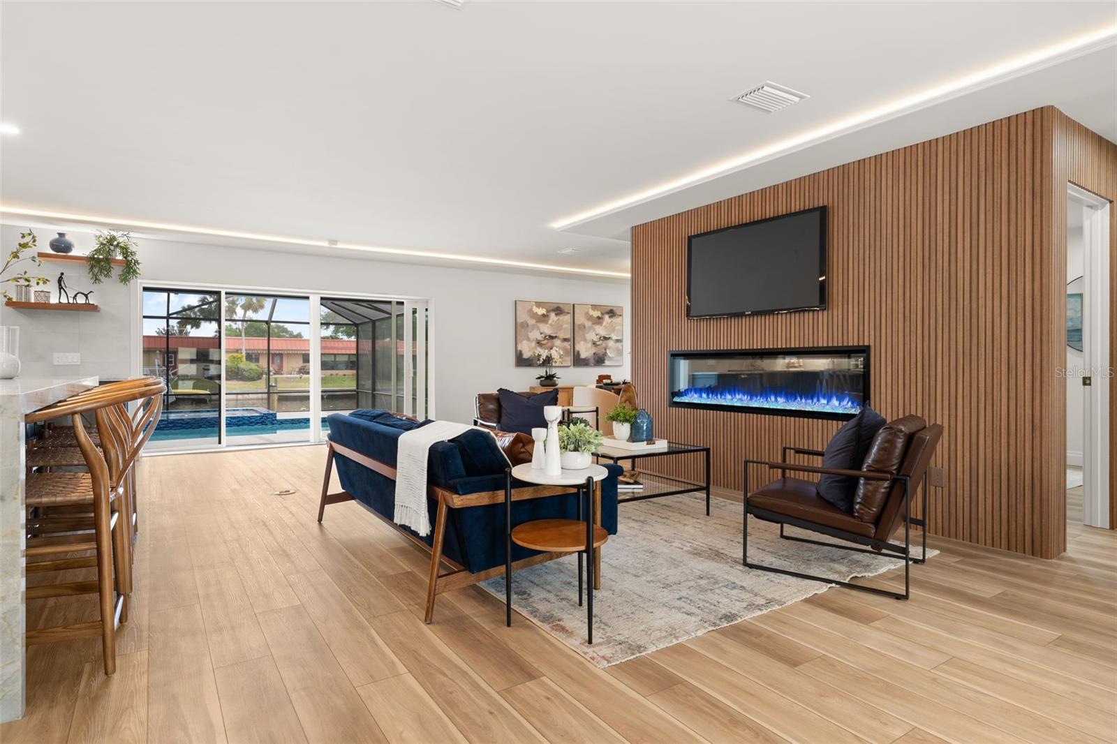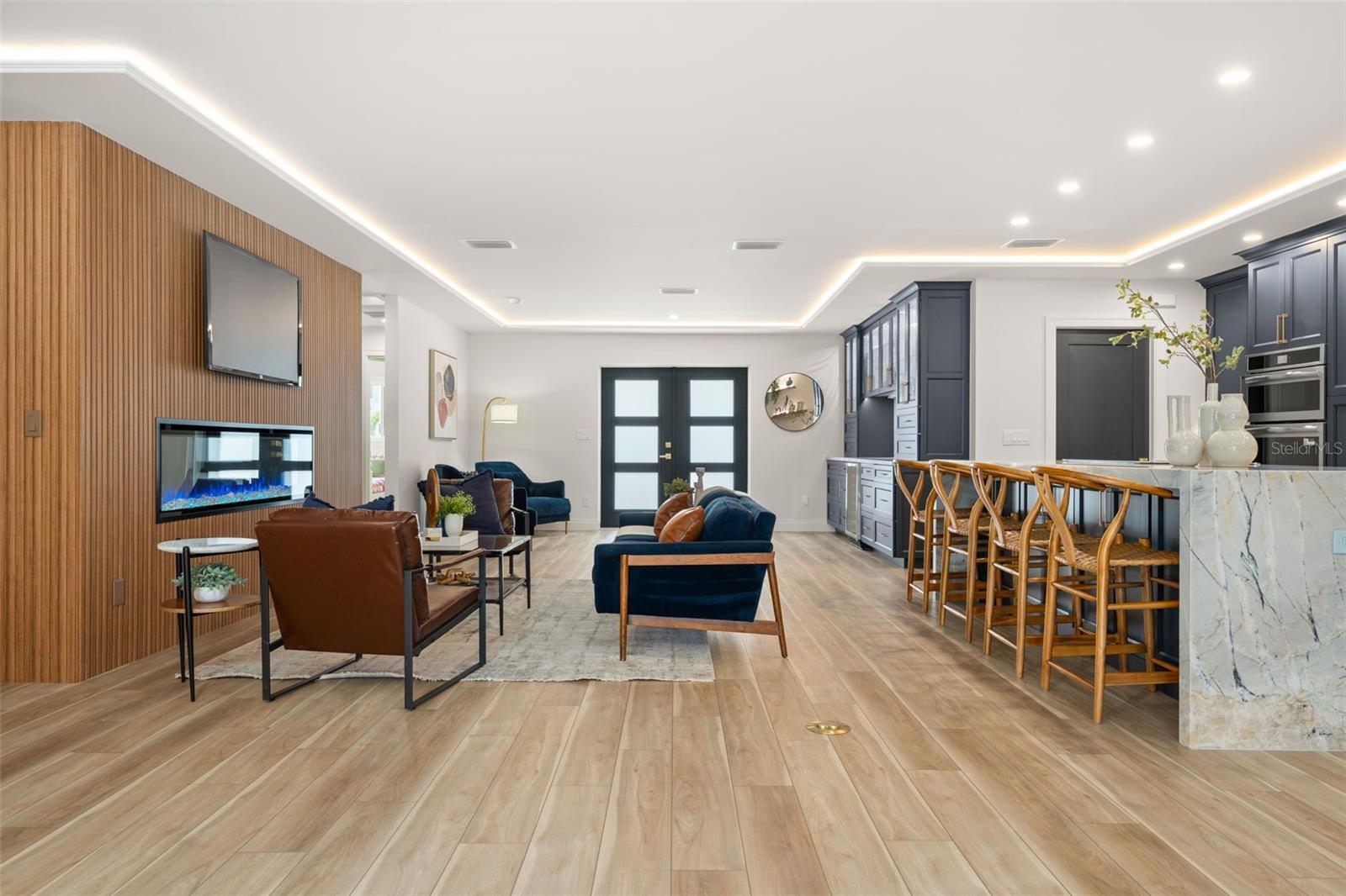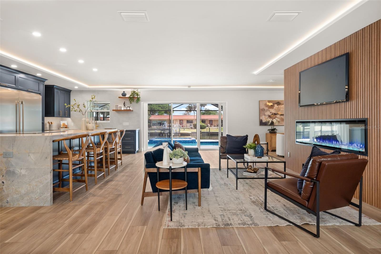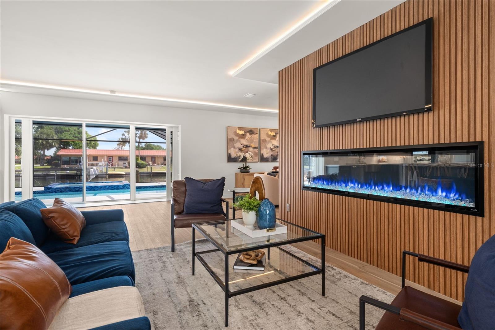 Luxury waterfront oasis on the vibrant waters of Palma Sola Bay, just minutes to the Gulf, pristine beaches, and sandbars. Located in highly sought-after San Remo Shores, this fully renovated canal-front residence offers deep-water access--ideal for larger vessels and true boating enthusiasts--with no CDD, HOA, or deed restrictions. Reimagined in 2025, this move-in ready home blends modern luxury with effortless coastal living. The open-concept design showcases Level 5 finishes, over $200,000 in custom cabinetry, wide-plank LVP flooring, and illuminated tray ceilings. The chef's kitchen features a natural quartzite waterfall island, dual-sided cabinetry, and top-of-the-line appliances, seamlessly connecting to the living and dining spaces anchored by a 72-inch electric fireplace. The primary suite is a private retreat with a custom walk-in closet and spa-inspired bath, complete with a Bluetooth steam shower, dual rainfall heads, and a freestanding soaking tub. Outdoor living is exceptional, featuring a remodeled pool, new 8-person spa, and a renovated dock with TREX decking and boat lift--perfect for enjoying the ultimate waterfront lifestyle. Extensive upgrades include a new roof, impact windows and doors, updated plumbing and electrical, generator disconnect, new lanai with covered entertaining space, Florida room, and epoxy-finished garage. Ideally positioned near IMG Academy and the world-renowned beaches of Anna Maria Island, this home delivers a rare opportunity to experience luxury waterfront living at its finest. *Investor friendly with no rental restrictions.*