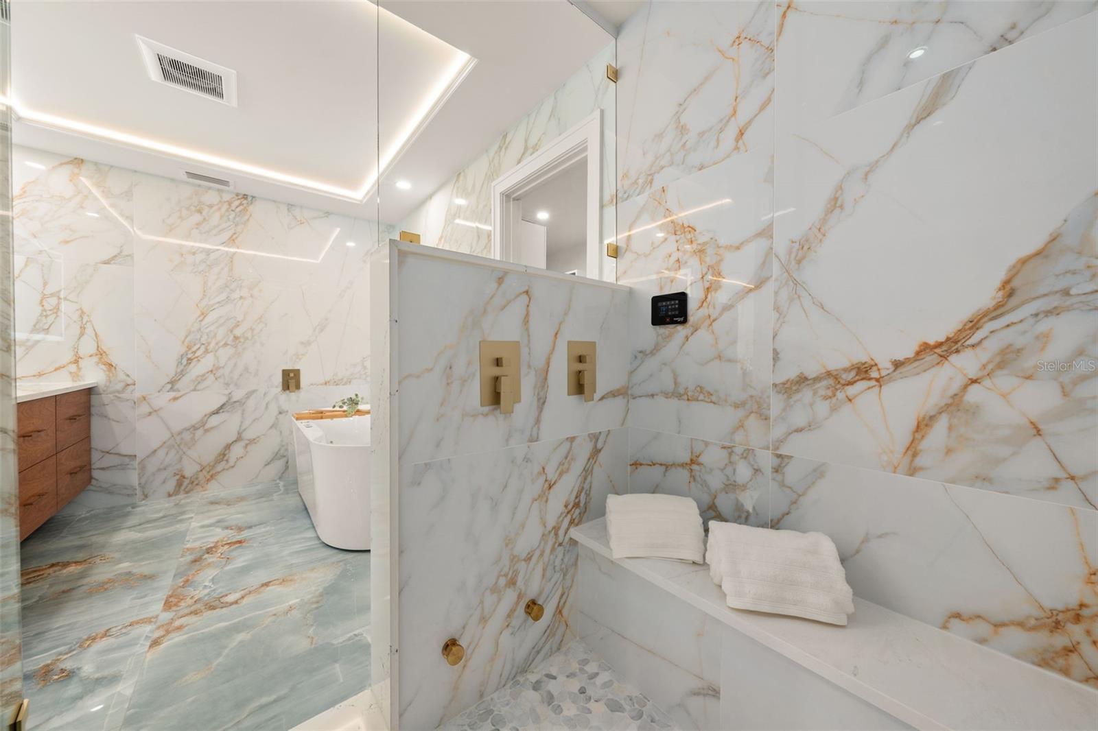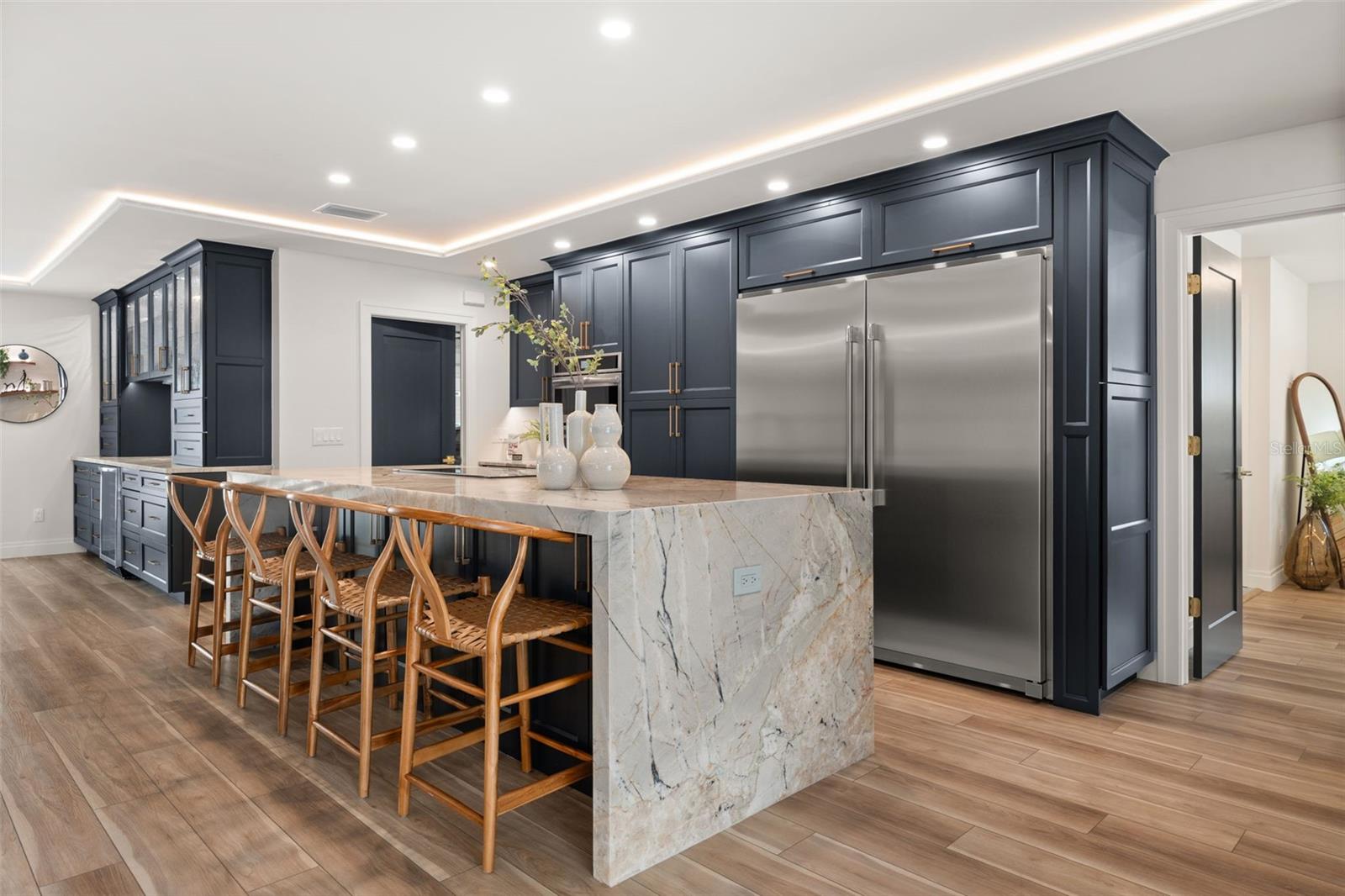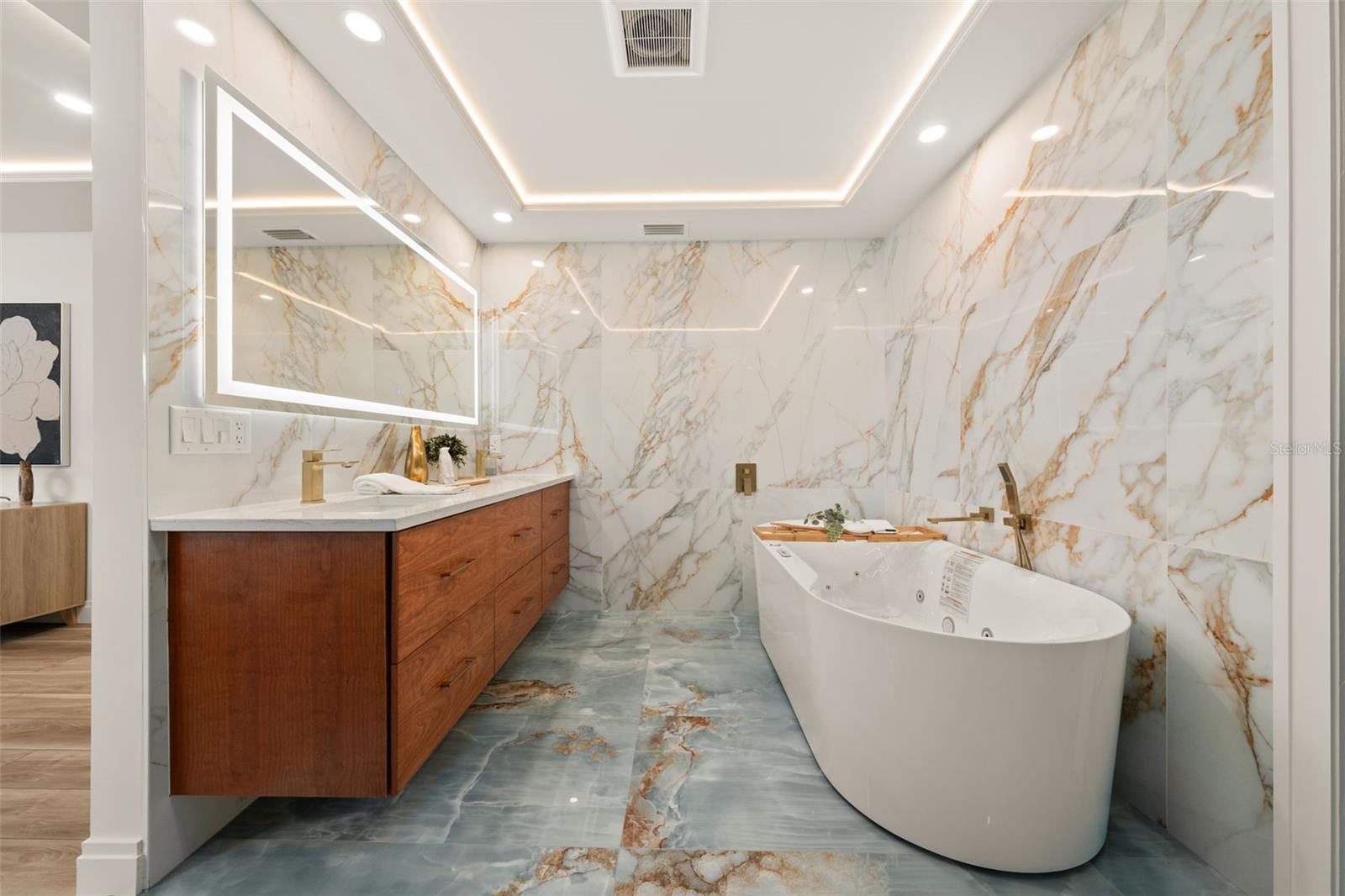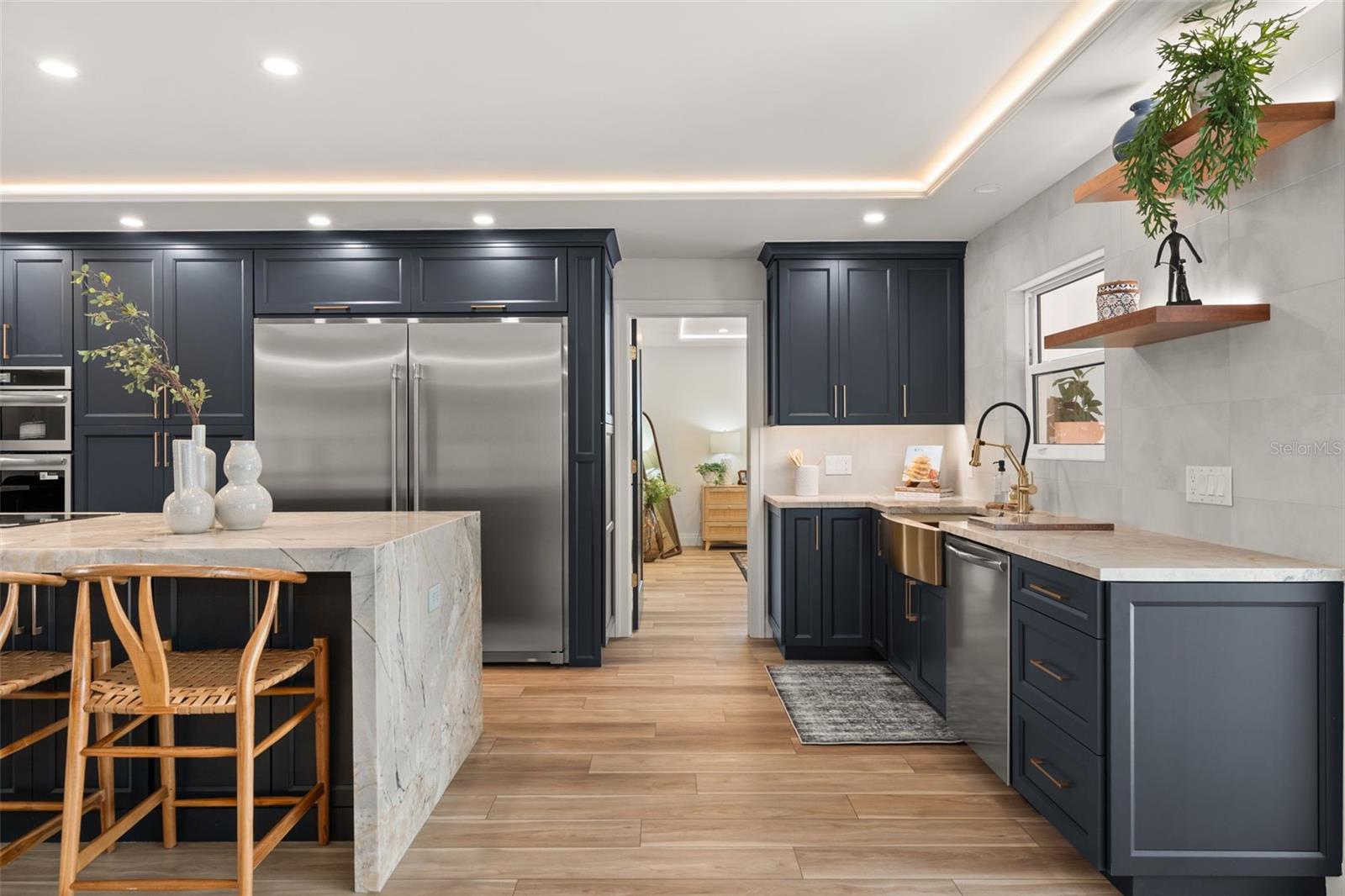 Luxury waterfront oasis on the vibrant waters of Palma Sola Bay, just minutes to the Gulf, pristine beaches, and sandbars. Located in highly sought-after San Remo Shores, this fully renovated canal-front residence offers deep-water access--ideal for larger vessels and true boating enthusiasts--with no CDD, HOA, or deed restrictions. Reimagined in 2025, this move-in ready home blends modern luxury with effortless coastal living. The open-concept design showcases Level 5 finishes, over $200,000 in custom cabinetry, wide-plank LVP flooring, and illuminated tray ceilings. The chef's kitchen features a natural quartzite waterfall island, dual-sided cabinetry, and top-of-the-line appliances, seamlessly connecting to the living and dining spaces anchored by a 72-inch electric fireplace. The primary suite is a private retreat with a custom walk-in closet and spa-inspired bath, complete with a Bluetooth steam shower, dual rainfall heads, and a freestanding soaking tub. Outdoor living is exceptional, featuring a remodeled pool, new 8-person spa, and a renovated dock with TREX decking and boat lift--perfect for enjoying the ultimate waterfront lifestyle. Extensive upgrades include a new roof, impact windows and doors, updated plumbing and electrical, generator disconnect, new lanai with covered entertaining space, Florida room, and epoxy-finished garage. Ideally positioned near IMG Academy and the world-renowned beaches of Anna Maria Island, this home delivers a rare opportunity to experience luxury waterfront living at its finest. *Investor friendly with no rental restrictions.*