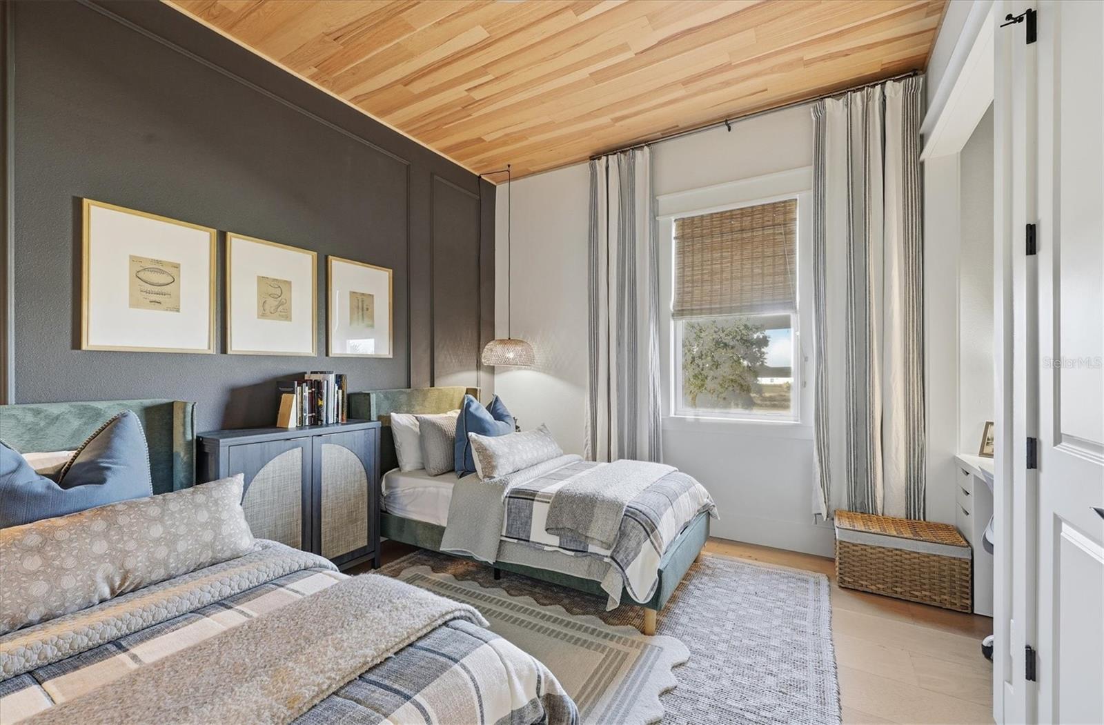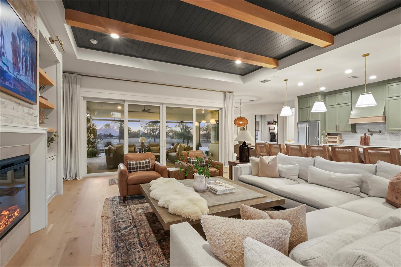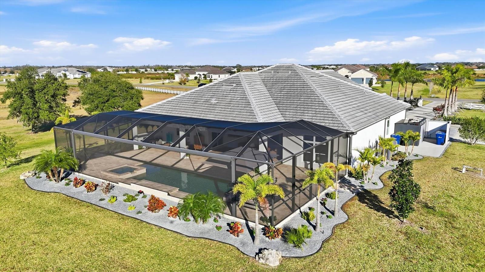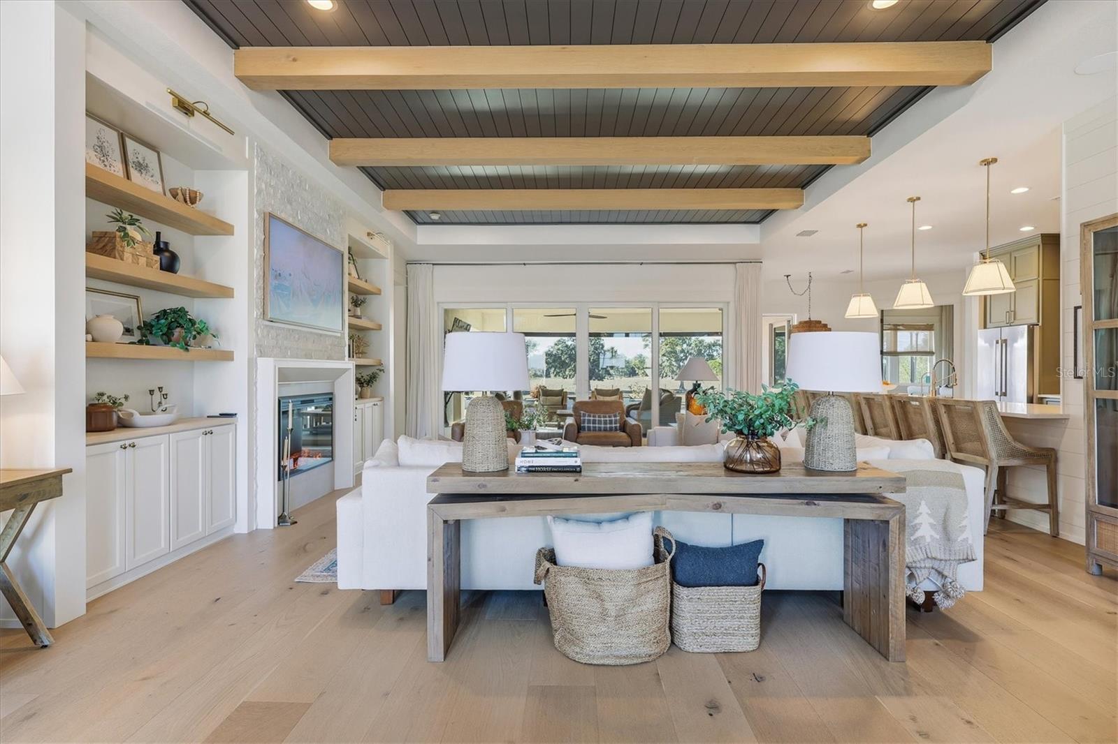Welcome to a fairytale farmhouse where impeccable attention to detail defines this exquisitely crafted residence, set on a breathtaking about 5.28-acre homesite within the sought-after, gated community of Hampton Lakes. Designed for everyday living and entertaining, the split-bedroom open floor plan blends warmth, sophistication, and modern comfort. From the moment you enter through the grand double front doors, dramatic ceiling treatments, an architectural theme carried throughout every room, pair beautifully with newly completed custom paint and stunning millwork. The foyer features a striking herringbone European white oak ceiling, setting the tone for the layered ceiling details found throughout the home, including tongue-and-groove wood ceilings, custom beams and tray ceilings. The expansive eat-in kitchen offers quartz countertops, an oversized breakfast bar, stainless steel appliances, built-in oven, custom vent hood, pot filler, pantry and a charming dining nook. French doors open to a versatile bonus den or media room, while the oversized living room showcases about 11-foot tray ceilings, custom wood beams, built-in shelving and a statement electric fireplace. The resort-inspired owner's suite is a serene retreat with a beautifully detailed ceiling, dual walk-in closets with custom organizers, dual vanities, a soaking tub and a walk-in shower with frameless glass. Oversized picture windows capture peaceful views of the pool and pastures, with direct access to the lanai. Guest suites feature custom built-in closets and bunk spaces, while the guest bath is finished with grass-cloth wallpaper and a marble vanity. A spacious office with custom built-ins offers flexibility as a potential fourth bedroom. Throughout the home, 10-inch-wide European white oak floors, shiplap walls, elegant wainscoting and thoughtfully designed ceiling details reflect exceptional craftsmanship. Shadowbox sliders open to an extended screened lanai overlooking the custom saltwater pool and spa with spillover feature, heater, and panoramic enclosure, creating a private outdoor oasis. Notable upgrades include a Generac whole-home generator, a newly installed, underground 500-gallon propane system, and a Culligan whole-home water filtration system with reverse osmosis, along with dual HVAC systems, central vacuum plumbing, surround-sound prewiring and an interior utility room with built-ins. The exterior impresses with updated landscaping, exterior track lighting, a palm-tree-lined driveway with extension, a covered front porch with brick pavers, and a three-car garage with epoxy flooring and overhead storage. The expansive grounds include a citrus grove, a tranquil pond with fish, an extended concrete parking pad and a storage shed. Meticulously maintained and thoughtfully enhanced, this exceptional Fairytale farmhouse offers sweeping westerly sunset views while remaining just minutes from Waterside, Lakewood Ranch Main Street, downtown Sarasota, the interstate, the airport and world-class beaches.