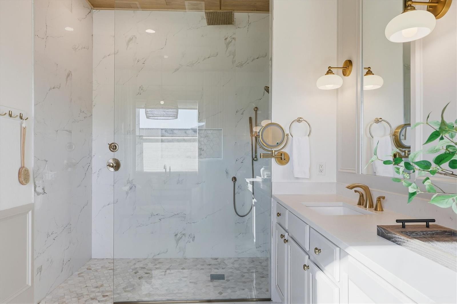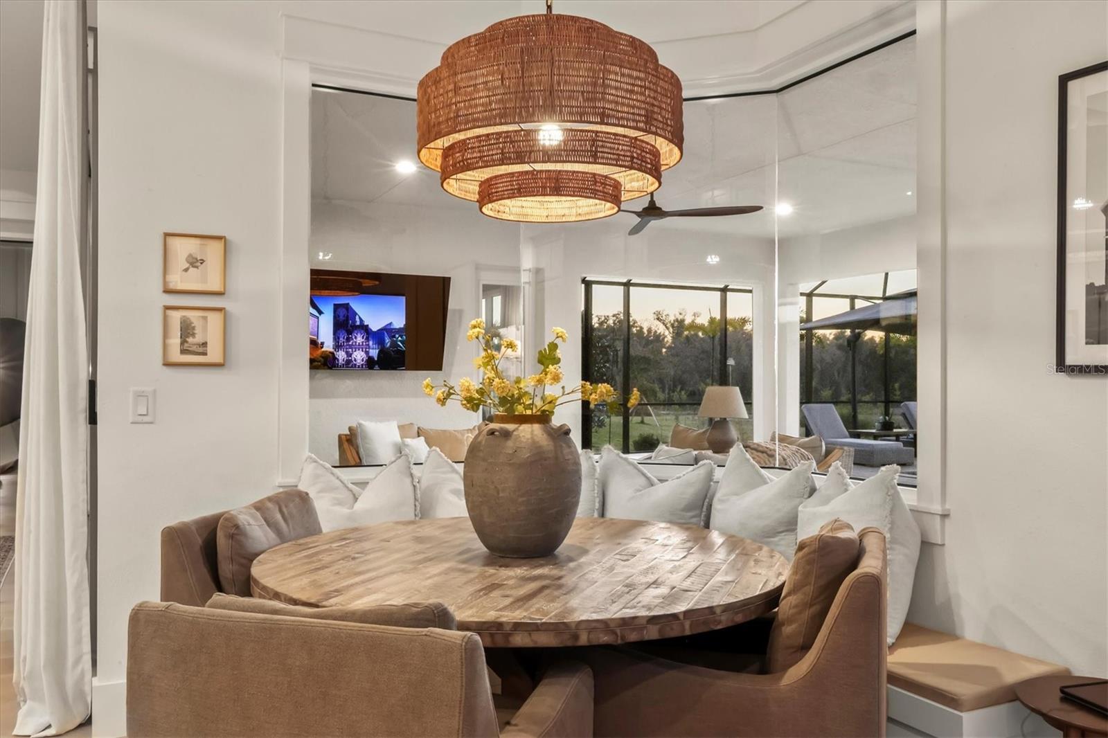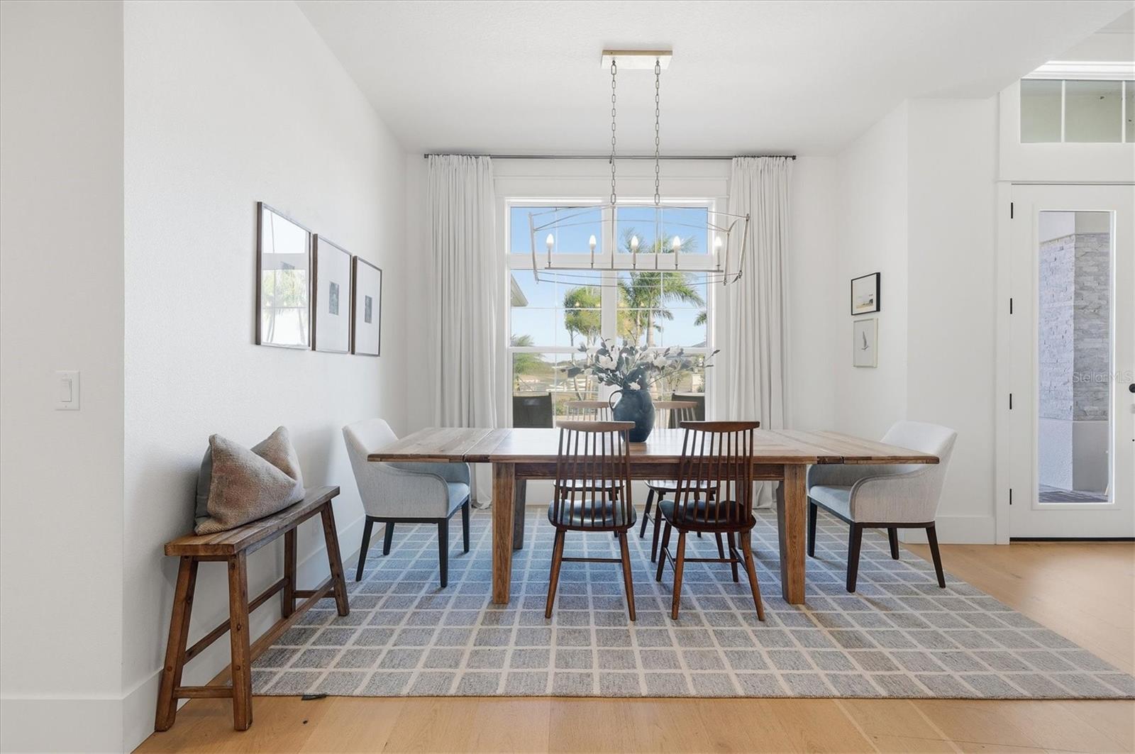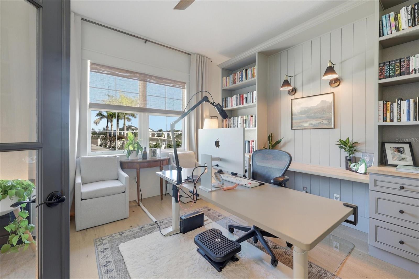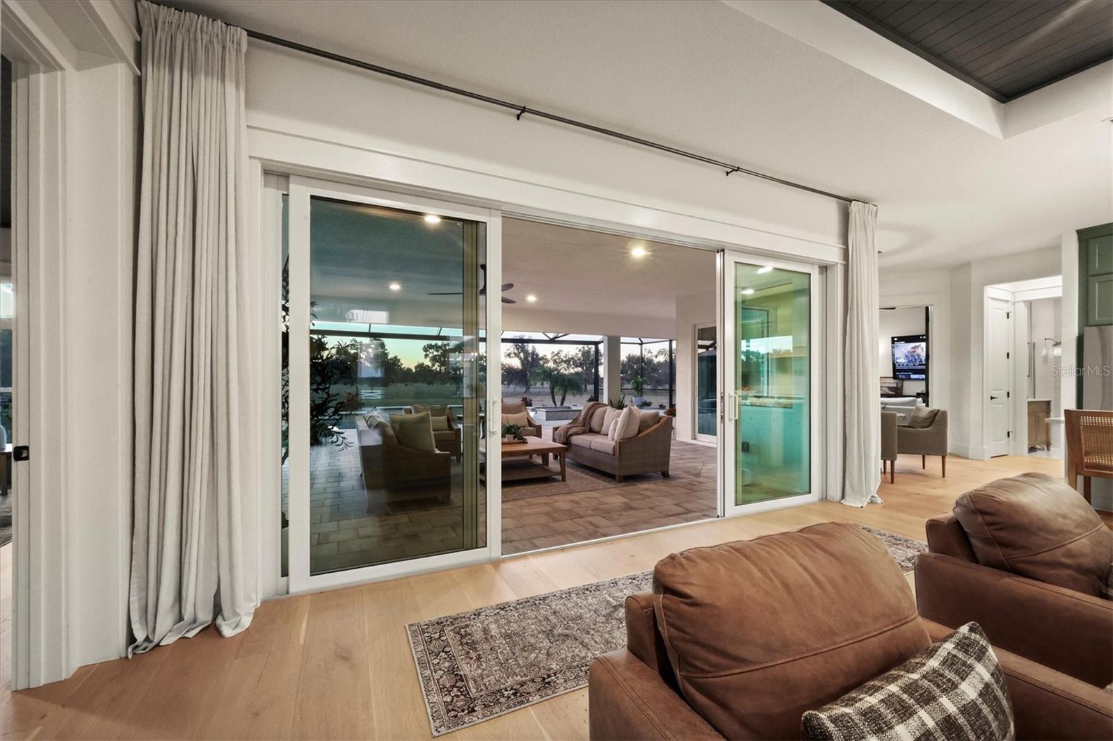 Welcome to a fairytale farmhouse where impeccable attention to detail defines this exquisitely crafted residence, set on a breathtaking about 5.28-acre homesite within the sought-after, gated community of Hampton Lakes. Designed for everyday living and entertaining, the split-bedroom open floor plan blends warmth, sophistication, and modern comfort. From the moment you enter through the grand double front doors, dramatic ceiling treatments, an architectural theme carried throughout every room, pair beautifully with newly completed custom paint and stunning millwork. The foyer features a striking herringbone European white oak ceiling, setting the tone for the layered ceiling details found throughout the home, including tongue-and-groove wood ceilings, custom beams and tray ceilings. The expansive eat-in kitchen offers quartz countertops, an oversized breakfast bar, stainless steel appliances, built-in oven, custom vent hood, pot filler, pantry and a charming dining nook. French doors open to a versatile bonus den or media room, while the oversized living room showcases about 11-foot tray ceilings, custom wood beams, built-in shelving and a statement electric fireplace. The resort-inspired owner's suite is a serene retreat with a beautifully detailed ceiling, dual walk-in closets with custom organizers, dual vanities, a soaking tub and a walk-in shower with frameless glass. Oversized picture windows capture peaceful views of the pool and pastures, with direct access to the lanai. Guest suites feature custom built-in closets and bunk spaces, while the guest bath is finished with grass-cloth wallpaper and a marble vanity. A spacious office with custom built-ins offers flexibility as a potential fourth bedroom. Throughout the home, 10-inch-wide European white oak floors, shiplap walls, elegant wainscoting and thoughtfully designed ceiling details reflect exceptional craftsmanship. Shadowbox sliders open to an extended screened lanai overlooking the custom saltwater pool and spa with spillover feature, heater, and panoramic enclosure, creating a private outdoor oasis. Notable upgrades include a Generac whole-home generator, a newly installed, underground 500-gallon propane system, and a Culligan whole-home water filtration system with reverse osmosis, along with dual HVAC systems, central vacuum plumbing, surround-sound prewiring and an interior utility room with built-ins. The exterior impresses with updated landscaping, exterior track lighting, a palm-tree-lined driveway with extension, a covered front porch with brick pavers, and a three-car garage with epoxy flooring and overhead storage. The expansive grounds include a citrus grove, a tranquil pond with fish, an extended concrete parking pad and a storage shed. Meticulously maintained and thoughtfully enhanced, this exceptional Fairytale farmhouse offers sweeping westerly sunset views while remaining just minutes from Waterside, Lakewood Ranch Main Street, downtown Sarasota, the interstate, the airport and world-class beaches.