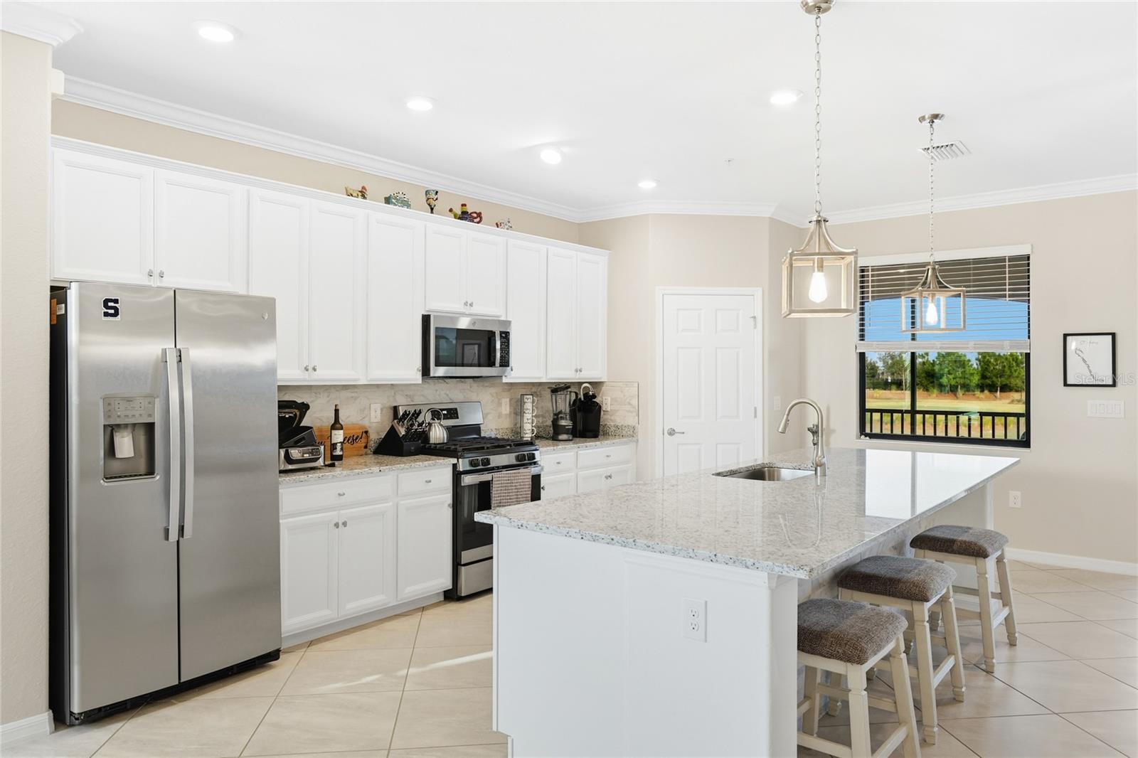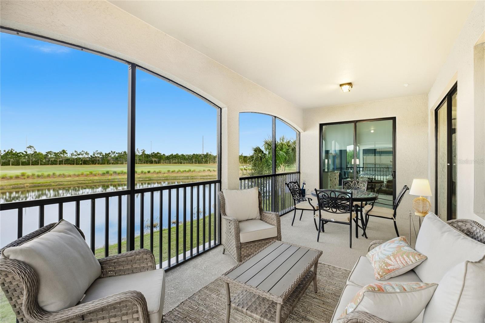Deeded with a full golf membership for year-round enjoyment, this second floor 3 bedroom, 2 bathroom coach home is located within the highly sought-after Lakewood National Golf and Country Club and offers elevated views, privacy, and a refined resort-style lifestyle. With a private entry and attached garage below, the residence provides the space and feel of a single-family home paired with the ease of maintenance-free living. The interior opens to a bright, open-concept layout thoughtfully enhanced with modern updates that extend well beyond builder grade. The kitchen is both stylish and functional, featuring white cabinetry, stone countertops, stainless steel appliances, a large center island with seating, and ample storage. Just off the main living area, a custom dry bar with a built-in beverage fridge adds a sophisticated touch and creates an ideal space for entertaining or everyday enjoyment. The living and dining areas flow seamlessly together and are filled with natural light, creating a welcoming and comfortable environment. Sliding glass doors lead to the covered, screened lanai where tranquil lake and golf course views take center stage. Positioned on the second floor, this outdoor space offers enhanced privacy and peaceful sightlines, making it a perfect setting for morning coffee or relaxing at the end of the day. The primary suite serves as a calm retreat with generous proportions, dual walk-in closets, and an en-suite bathroom featuring dual vanities and a spacious walk-in shower. Two additional bedrooms provide flexibility for guests, a home office, or family use and share a well-appointed secondary bathroom. Residents of Lakewood National enjoy an impressive array of amenities including two championship golf courses, a driving range, pitching and putting practice areas, resort style pools with tiki bar, clubhouse with restaurant, Full equipped fitness center and spa, pickleball, tennis, bocce ball, and beautifully maintained grounds ideal for walking and biking. Whether you are searching for a full time residence, seasonal retreat, or lock and leave lifestyle, this exceptional coach home delivers modern comfort, prime location, and unmatched amenities in one of Bradenton's most desirable golf communities. Conveniently located near shopping, dining, major roadways, and with easy access to I-75 and the Gulf Coast beaches, this residence offers a seamless blend of luxury, lifestyle, and location.