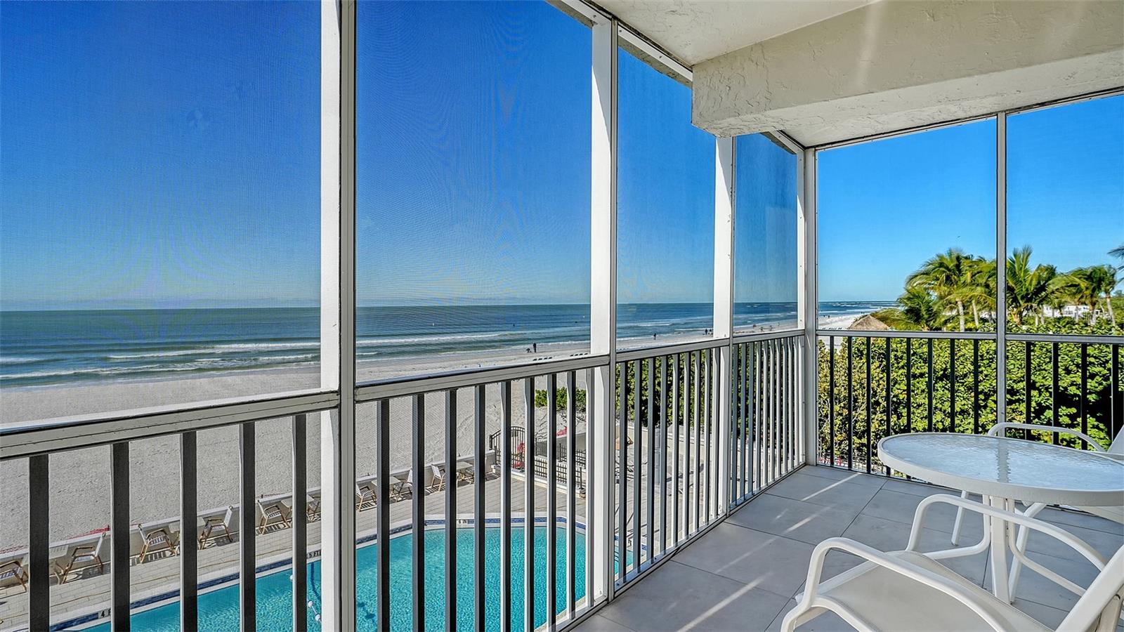 Experience beachfront living in this rarely available northwest corner residence at Lido Ambassador. This 3rd floor end-unit offers unparalleled panoramic views of the Gulf and beach, creating an extraordinary backdrop from every main living space. The residence features two bedrooms and two bathrooms encompassing 1,350 sq. ft. of interior living space complemented by a wraparound screened balcony that seamlessly blends indoor and outdoor living. Natural light fills the home, showcasing an open-concept layout that transitions from the entry area into the spacious great room overlooking the beachfront balcony. This thoughtful design is perfect for both entertaining guests and enjoying peaceful evenings at home, with endless beach views. The kitchen features Corian countertops, light colored cabinetry, generous storage all anchored by a trey ceiling. The primary suite offers a walk-in closet and an updated en-suite bath, while the guest bedroom and bath provide a private retreat for visitors. Lido Ambassador is a well-managed community known for its maintained grounds and attentive upkeep. Residents enjoy access to a Gulf-front pool and sun deck, which is currently undergoing a full renovation, to create a refreshed, resort-style atmosphere. And for added peace of mind, the roof of the building is brand new. Additional amenities include a fitness center, catering kitchen, outdoor grills, private storage, and one assigned covered parking space. The location is simply phenomenal. Nestled on the exclusive south end of Lido Key, the residence is steps from the Lido Beach Resort Tiki Bar and short distance from St. Armands Circle, Longboat Key, and with easy access to downtown Sarasota's arts and culture scene including the weekly farmer's market. Whether you are seeking a coastal getaway, investment opportunity, or full-time residence, this unit delivers exceptional location, and breathtaking views.