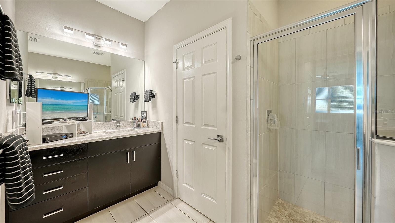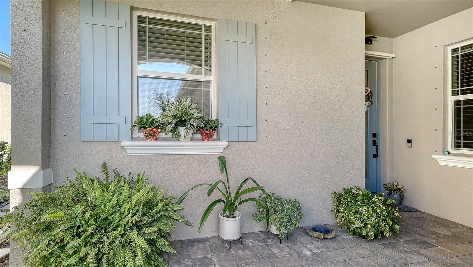 Exterior: Hurricane Shutters, Rain Gutters, Sidewalk, Sliding Doors