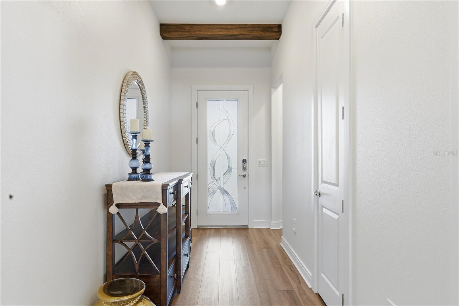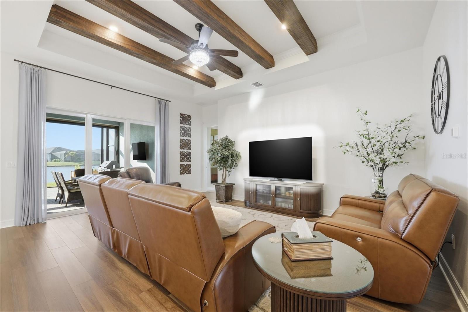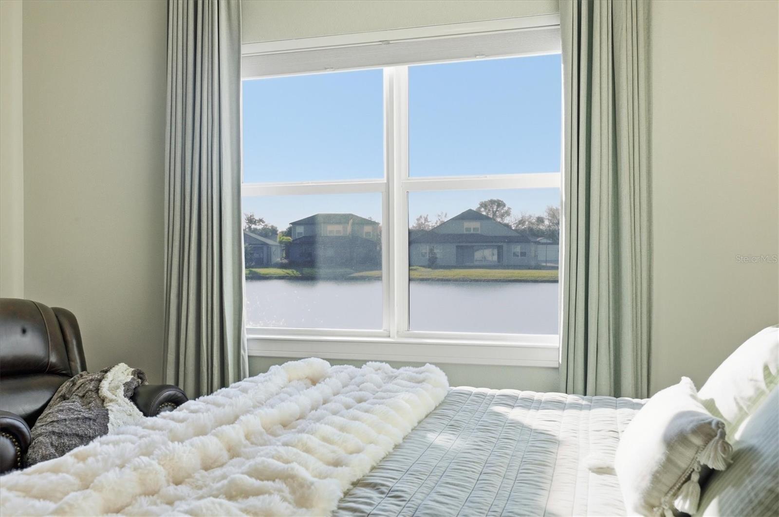 The PRESTIGE floorplan offers all the bells and whistles. Soaring 11ft ceilings! A half bath for guests. A primary bedroom featuring two walk-in closets; a walk-in Super shower with a bench in the primary bath that provides for aging in place. An additional oversized walk-in storage closet- just across from the kitchen. Ensuite guest bedroom with walk- in shower and large closet. IMPACT WINDOWS AND DOORS provide safety and soundproofing. The wow continues as the sellers added wood-look beams in the foyer and gathering room, and a perfectly placed drop zone just inside the garage. Speaking of the garage, there are solidly built storage units. Outback, the extended covered lanai and screened patio, offers everything anyone could want in a Florida home. The remote-controlled storm screens serve a dual purpose- safety, but also keep the cooled or warmed air inside for an additional year-round entertaining space. A big, beautiful southerly pond view is visible from the Cafe, Gathering Room, and Primary bedroom. Located in the very active and competitive Del Webb Bay View where you can be as busy as you want to be! Pickleball, Tennis, Bocce, Table tennis, shuffleboard, etc. A heated resort-style pool, resistance pool and lap pool, hot tub, community garden, fitness center, clubs galore, and with a restaurant on site (Sailfish Grille). Bay View is golf cart-friendly. Not to be forgotten- Two dog parks for our furry friends. Located 1.5 miles from I-75 and 275. HOA includes tree and yard maintenance and TV and internet. Do note the CDD fee is included in the taxes