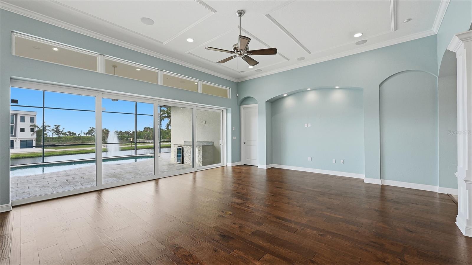 Step into this stunning custom residence in the highly sought after Legends Bay community, where quality construction and thoughtful design come together beautifully. Built by Gibraltar, this home enjoys showcases refined craftsmanship at every turn.Expansive 12-foot ceilings, elegant tray accents, impact pocketing sliders, and transom windows fill the main living spaces with soft, natural light. Overlooking a peaceful lake, the home offers 3 bedrooms plus a den and a seamless blend of indoor comfort and outdoor enjoyment. Wide plank hardwood flooring, detailed millwork, crown molding, and designer LED fixtures elevate the home's timeless style.The chef's kitchen is both functional and impressive, featuring premium appliances, natural stone countertops, and an oversized island ideal for gatherings. A floor to ceiling walk in pantry adds exceptional storage.The owner's suite is a private retreat with serene water views, a spa inspired bath with a soaking tub and walk in shower, and an expansive custom closet. The den provides flexible space for an office, media room, OR quiet lounge.Outdoors, enjoy a heated pool and spa with smart controls, a covered lanai, and a convenient pool bath--perfect for year round Florida living. The home also includes impact-rated windows and doors and is elevated well above sea level for added peace of mind.Additional upgrades include oversized garage storage cabinets, automated ceiling mounted storage racks, and an expanded paver driveway accommodating a third vehicle.Residents of Legends Bay enjoy a lakeside community pool, clubhouse, walking trail, and fishing pier. The HOA includes lawn care and cable/internet. With IMG Golf & Country Club (golf cart friendly), IMG Academy, and the beaches of Anna Maria Island and Longboat Key just minutes away, this home offers an exceptional lifestyle in an unbeatable location.
