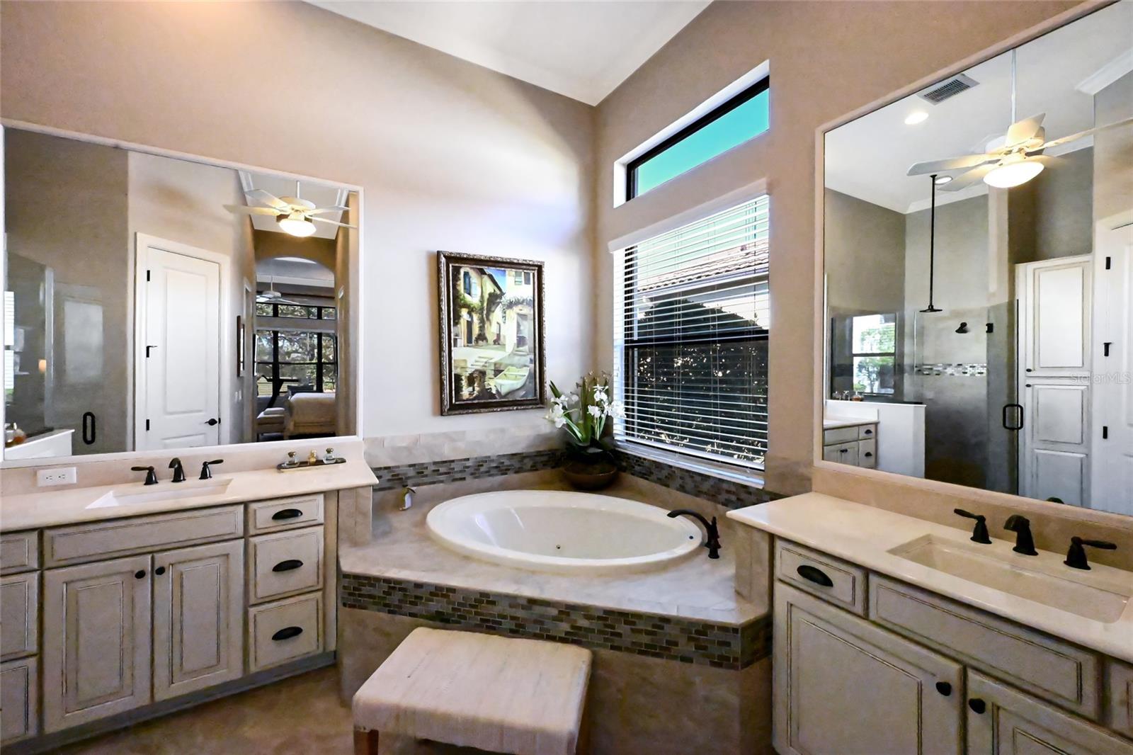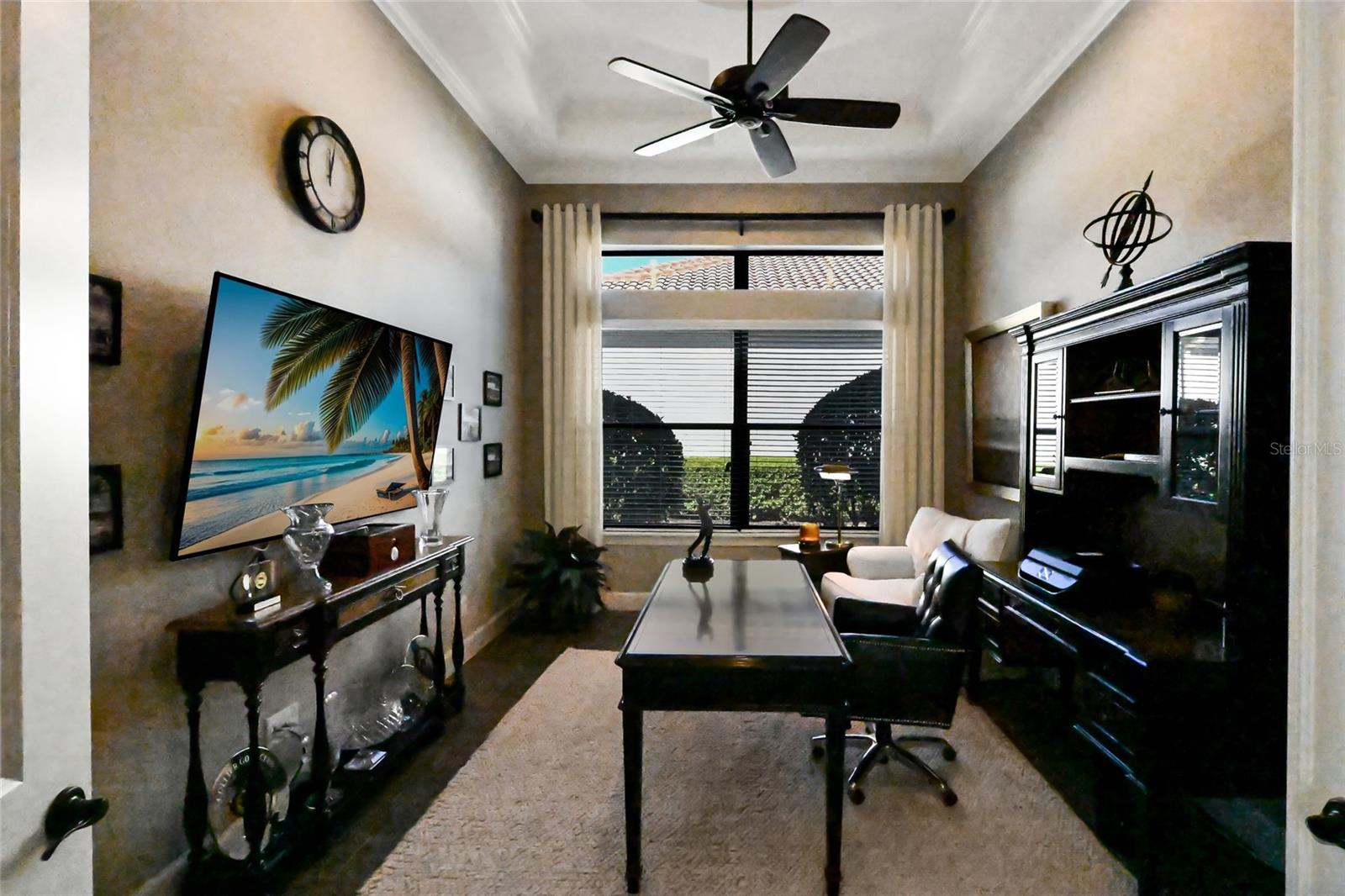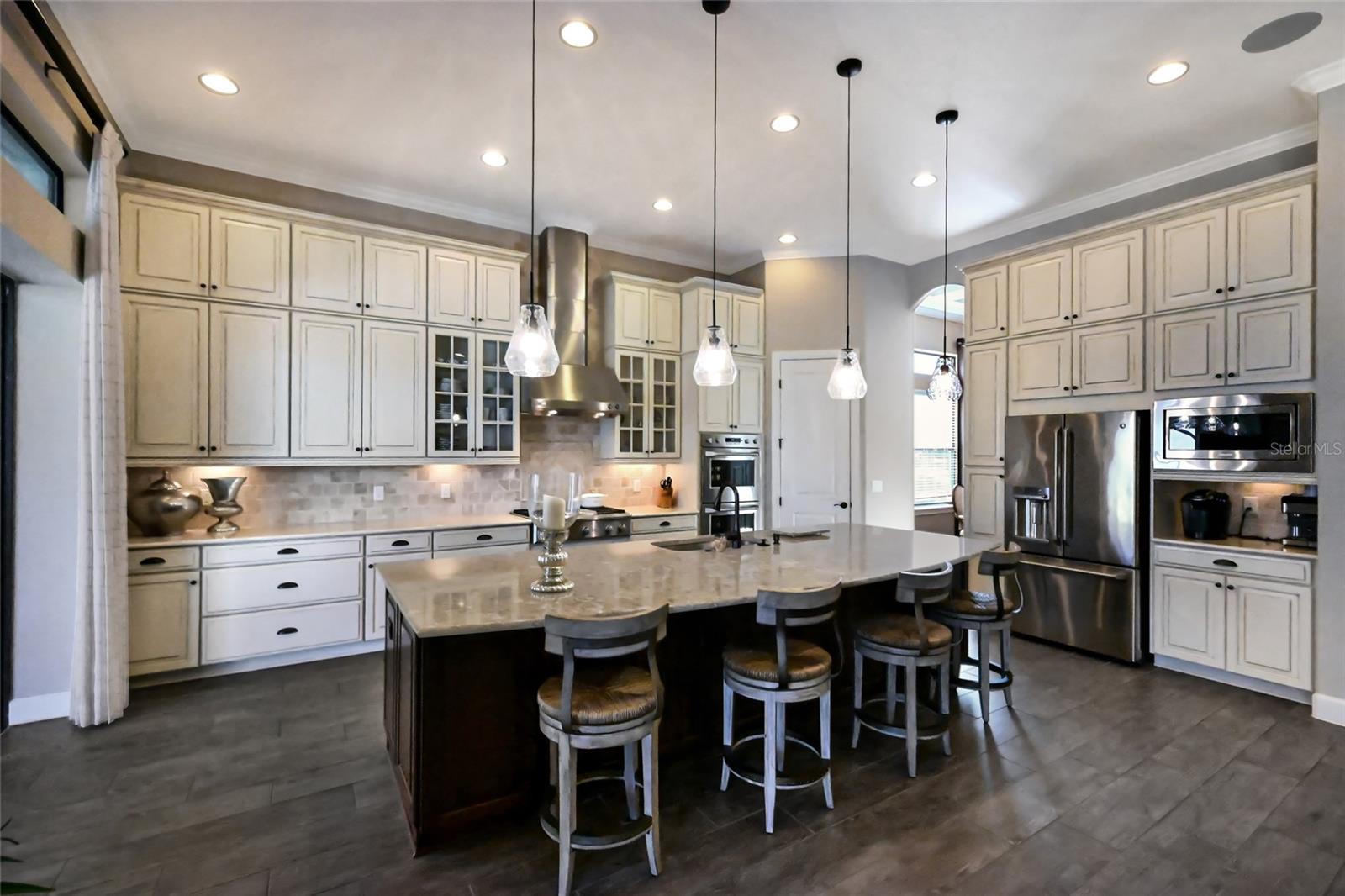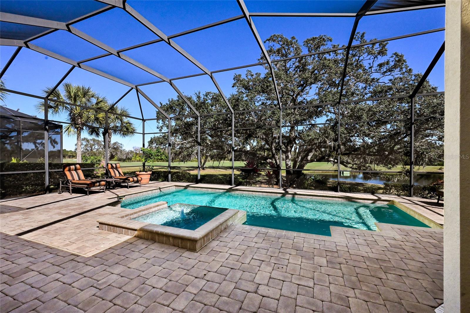 On one of the most stunning golf front settings in Esplanade at Lakewood Ranch, this refined and elegant Francesco residence boasts a trifecta of long expansive views of the golf course, a large lake, and breathtaking oaks all with the added bonus of GOLF MEMBERSHIP INCLUDED.Altered from Taylor Morrison's original plan to deliver the largest Francesco lanai in the community, this three bedroom ensuite plus den plan boasts 2,862 square feet of one-story open living, plank style porcelain flooring, soaring coffered ceilings, and a breathtaking outdoor living area with abundant open and under cover spaces, a pavered deck, Summer kitchen, a gas fireplace seating area, PebbleTec heated saltwater pool/spa, all while engulfed by an unmatched premium private vista. Seamlessly connecting this outdoor oasis to the oversized great room, kitchen, wet bar and dining areas are disappearing glass doors, where chefs will delight in the well-appointed gourmet kitchen with high-performance GE Monogram appliances, sprawling granite counters, oversized island with cabinetry all-around, double stack of wood cabinetry, dovetail soft-close drawers, pull-outs, and a walk-in pantry. Unwind in the owner's retreat offering tray ceiling, crown moldings, two walk-in closets, and a luxuriously appointed spa-like bath with separate vanities, inviting soaking tub, and invigorating shower. Guests will be right at home in this split bedroom layout with two additional guest ensuites, each on a separate wing adorned with crown molding, and both with their own private full bath. Additionally, the residence offers a a conveniently located powder room and an oversized den with double French entry doors, coffered ceiling, and crown molding. Other notable highlights of this all-encompassing 3,980 square foot maintenance-included residence includes a wet bar with wine fridge, sink and wood cabinetry, a large laundry room with cabinetry and sink, speakers inside and out, 5 distinctive coffered ceiling areas, 8' interior doors, tankless water heater, gutters all around, and an oversized 2+ car garage with the upgraded 4' foot expansion. Catering to discerning expectations, live a life well deserved in the area's preeminent golf and lifestyle community to enjoy golf, tennis, pickleball, bocce ball, and fitness center, along with resort-style pools, private cabanas, spa services, upscale restaurant and bar in the Culinary Center, a poolside full-service Tiki Bar restaurant and even two dog parks. Esplanade has something for everyone, all near dining, shopping, polo, community events and entertainment in the vibrant Lakewood Ranch, Waterside Place, Centerpointe and UTC area, surrounded by the enriching culture and the beaches of Sarasota.
