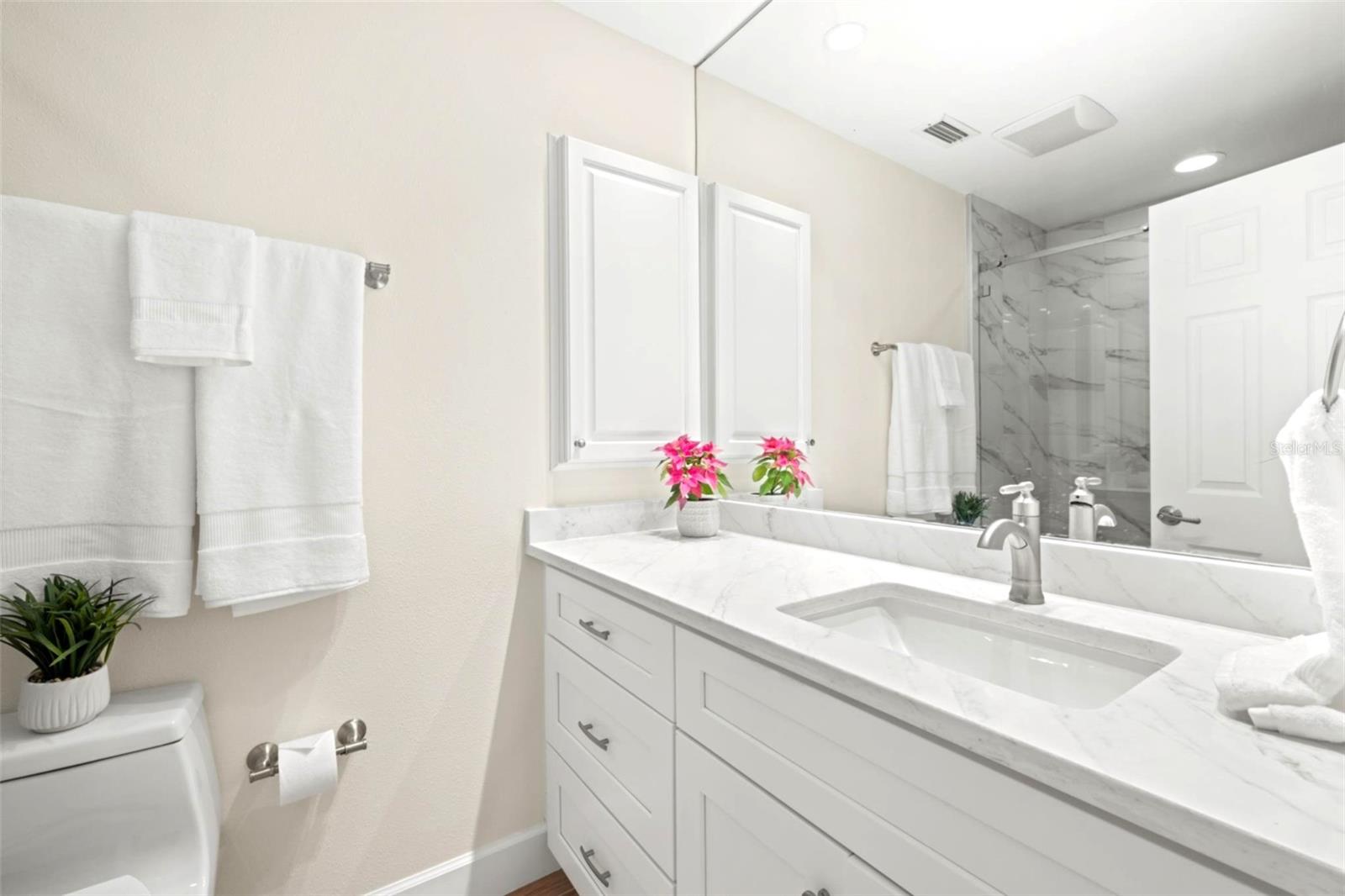 Welcome to refined coastal living in this beautiful freestanding villa with a one-car garage, located in the premier Gulf-front community of Whispering Sands on Siesta Key Beach. Thoughtfully updated throughout in 2025, this light-filled residence offers three bedrooms and two bathrooms within approximately 1,400 square feet of refined living space, blending modern coastal style with everyday comfort.The brand-new kitchen is both stylish and functional, featuring quartz countertops, soft-close white cabinetry with pull-out drawers, a mosaic tile backsplash, Frigidaire stainless steel appliances, and a pantry for additional storage. The fully updated bathrooms showcase quartz countertops, soft-close white cabinetry, updated lighting, and glass-enclosed walk-in showers.Additional upgrades include fresh interior and exterior paint, new crown molding and baseboards, textured ceilings, recessed lighting, ceramic tile flooring throughout, and built-in closet organizers. All three bedrooms are generously sized, offering flexible space for seating or a workspace.The spacious living room accommodates multiple seating areas and features large glass sliders that flood the home with natural light and create seamless indoor-outdoor living. Sliding glass doors from the kitchen and dining area open to a large brick paver patio, ideal for relaxing or entertaining, with fencing between villas for added privacy.Further highlights include a new roof (2025), new AC unit, new hot water heater, new landscaping, a new full-size washer and dryer.Whispering Sands is a 55+ Gulf-front community offering resort-style amenities, including 800 feet of private deeded beach access, two clubhouses for social gatherings, two heated swimming pools, a fitness center, library, tiki hut picnic area with gas BBQ grills, shuffleboard courts, kayak and canoe storage, an active social calendar, and onsite rental management. The community is just steps from dining, shopping, and the vibrant atmosphere of Siesta Key Village.This move-in-ready villa offers resort-style, low-maintenance island living at its finest.