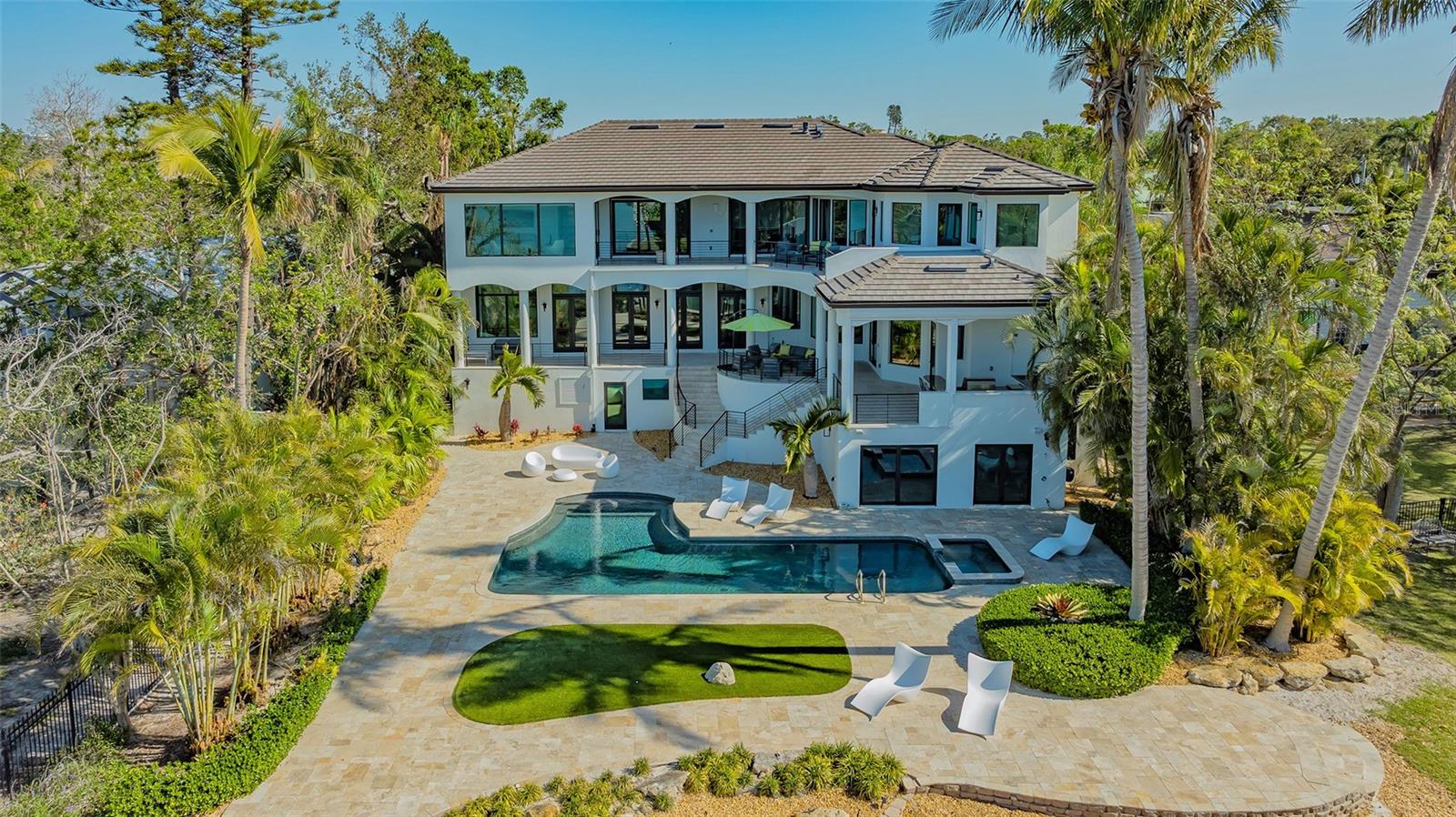 This exceptional 4-bedroom, completely renovated in 2020, highlights this waterfront estate in prestigious Harbour Acres offering 100 feet of prime Sarasota Bay frontage with private dock and lift. This masterpiece features 7074 Sq ft of living space with sweeping Bay views, a light filled open floor plan, and exceptional indoor-outdoor flow.A grand entry with dramatic staircase, opens to expansive living and dining areas, framed by floor to ceiling windows overlooking the water. The Italian modern gourmet kitchen offers premium Miele appliances, generous island seating, and a striking double sided gas fireplace shared with the living room - ideal for entertaining. This home provides rare flexibility with primary suites on both the main and upper-level levels, each with en suite baths and walk-in closet, along with additional guest suites, private office, sophisticated wine room, elevator, and dedicated fitness room. Outdoor living is a highlight, featuring a saltwater pool and spa, multiple terraces, outdoor kitchen, and professionally landscaped grounds leading to a concrete seawall and boat dock with a 30,000 pound boat lift, electric, water and fish cleaning station.Southwest exposure delivers stunning sunsets and quick access to Sarasota Bay.Spacious four-car garage complete with an electric charging station - this estate seamlessly blends opulence with modern convenience.Perfectly situated near Sarasota's renowned beaches, fine dining, vibrant arts scene, and top-tier medical facilities, this residence offers an unparalleled living experience in one of the most coveted waterfront communities.