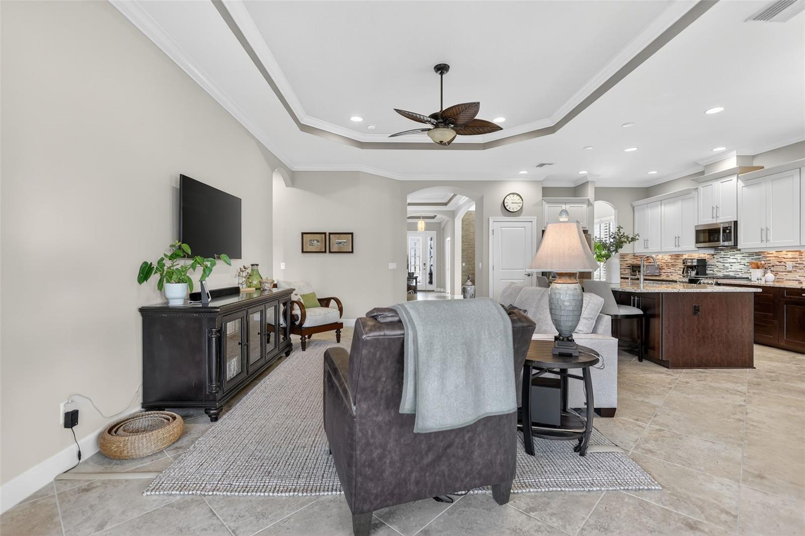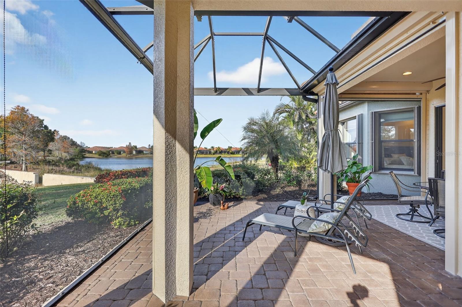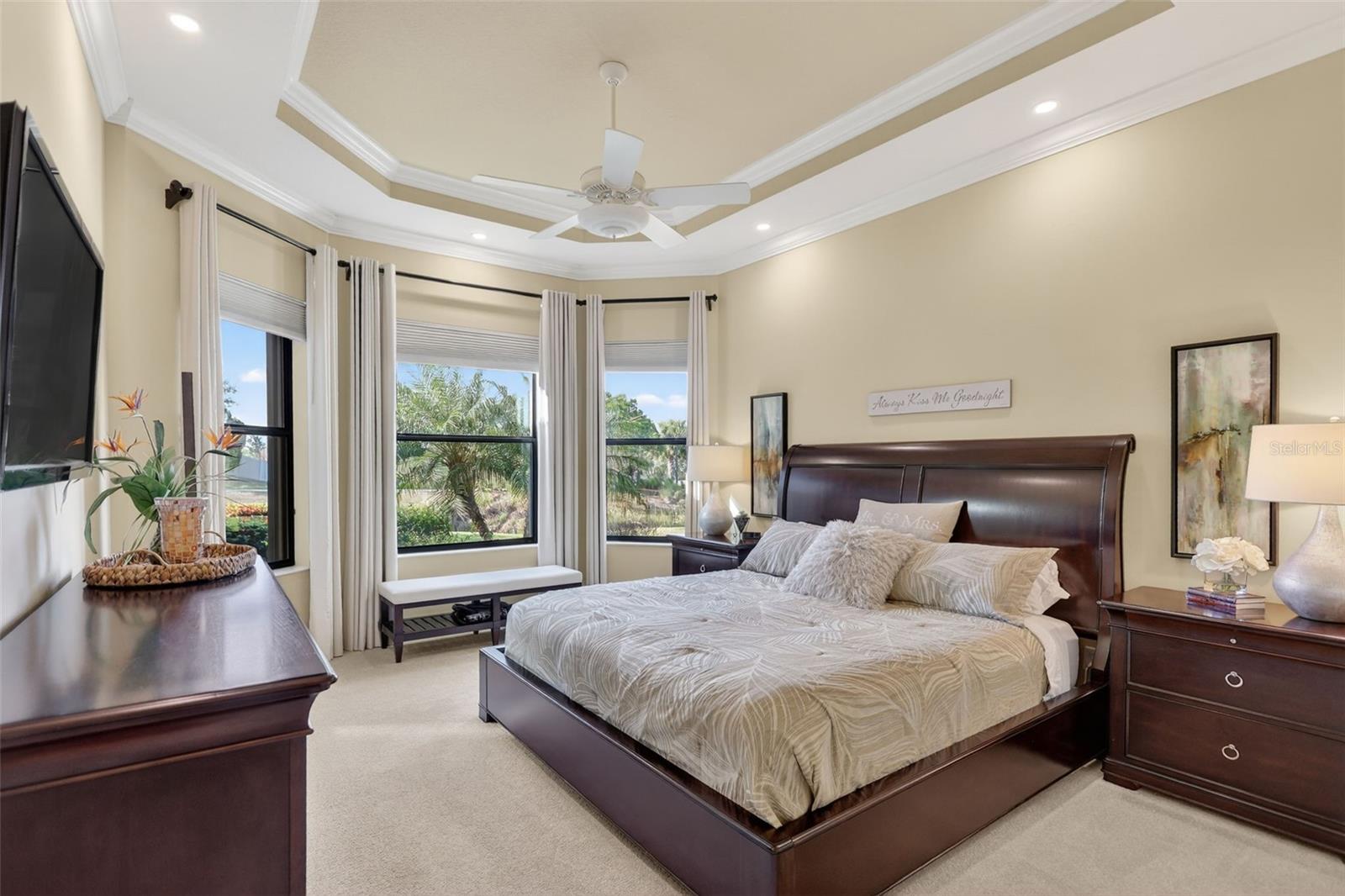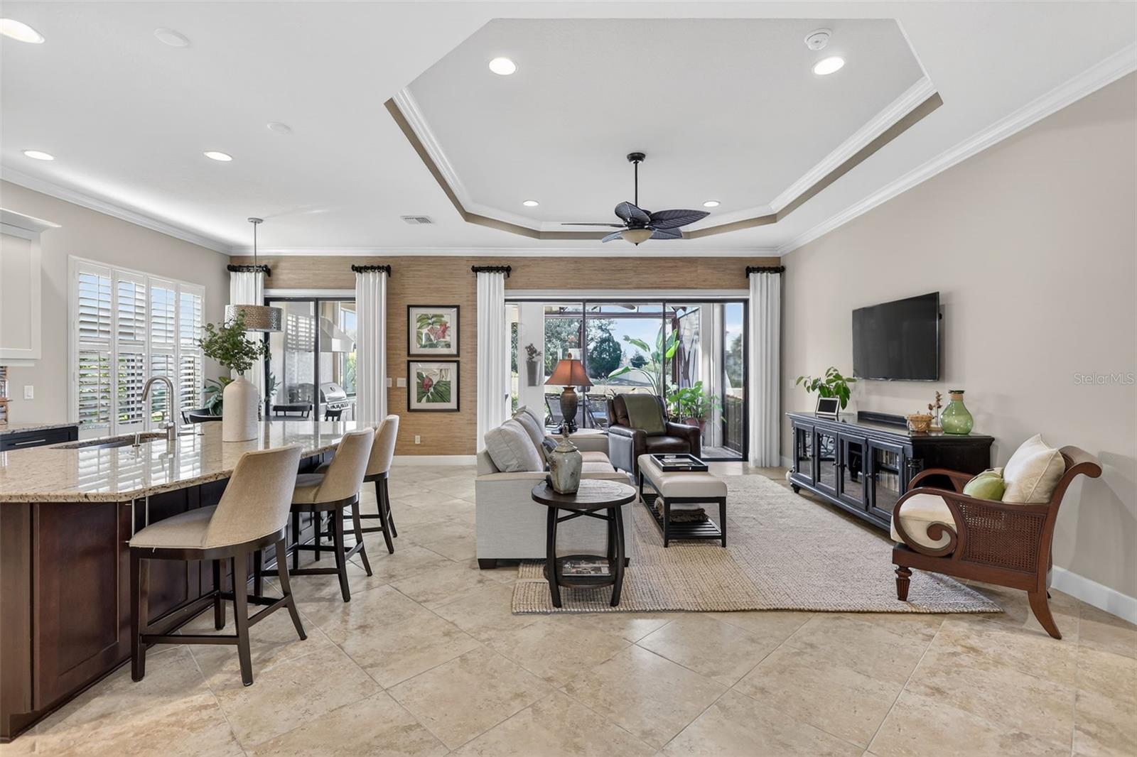 Experience elevated Florida living in this elegantly upgraded light and bright Farnese model, perfectly nestled in the prestigious Esplanade Golf and Country Club at Lakewood Ranch. This stunning 2-bedroom, 2.5-bathroom home with a versatile den offers an open-concept layout and luxurious finishes throughout. From the moment you enter, you'll appreciate the crown molding in every room--including the closets--tray ceilings, and diagonally laid tile in the main living area that adds a touch of sophistication. The gourmet kitchen features soft-close cabinetry, a newer faucet, and a premium 2023 Caf range, dishwasher, and microwave. The spacious primary suite includes a new shower floor, comfort-height toilets, and custom closet systems for maximum organization. The laundry room is enhanced with extra cabinet space and impact glass for added peace of mind. Step outside to a private lanai designed for true Florida living. Enjoy tranquil panoramic views of the pond and walking trail, complete with nebula lighting, a fully equipped summer kitchen, and Storm Smart shutters for hurricane protection. Accordion shutters and additional impact windows at the front door and laundry room provide further security. The extended garage offers epoxy floors, built-in cabinetry, attic stairs, and overhead storage--ideal for both convenience and function. Plantation shutters in the main living area, newer HVAC installed in 2023, and one of the longest driveways in the community complete this meticulously maintained home. Situated in one of Lakewood Ranch's premier lifestyle communities, residents enjoy access to championship golf, tennis, resort pools, fitness centers, dining, and endless social events. With the CDD partially paid off you will have savings of around $900/annually. This home is a rare opportunity for luxury, location, and long-term value. No golf dues pay to play. The drapes in the dinette and great room and the shelves in the office DO NOT CONVEY.