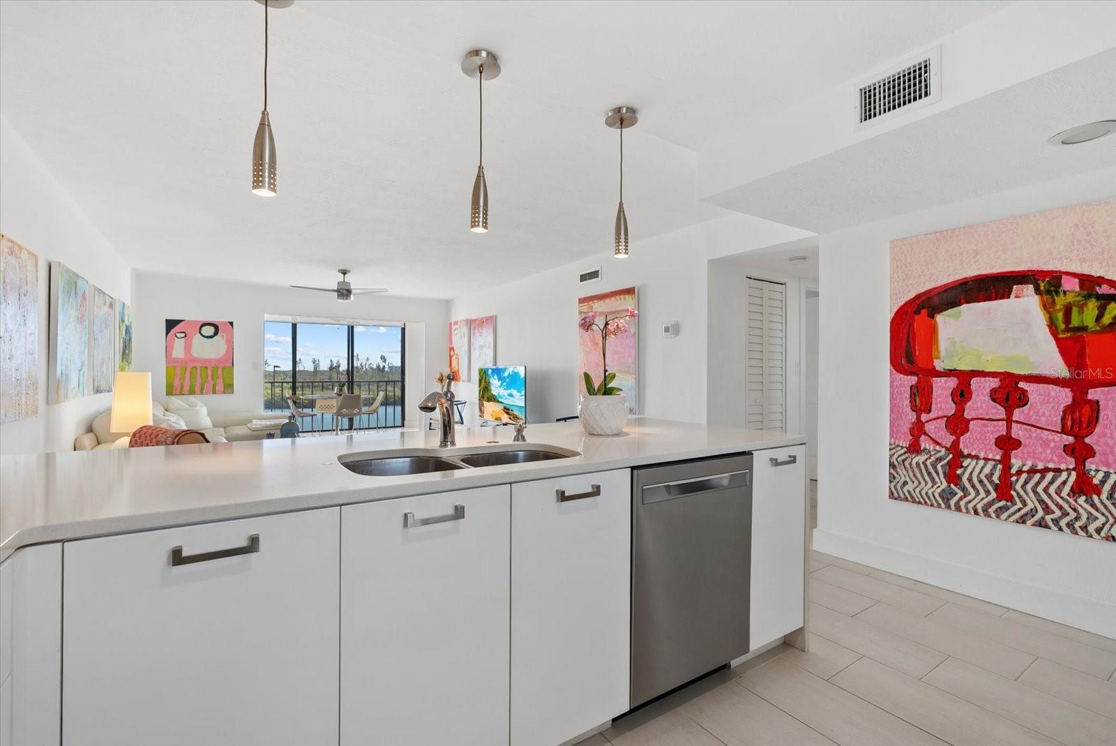 Live your dream in this light and bright 6th-floor 2-bedroom, 2-bath condo with spectacular views of both the Gulf and the Bay! This unit is the perfect place to watch a sunrise or a sunset and soak in the beauty of Neville Preserve, Little Sarasota Bay, and the Gulf! Gorgeous bay views are showcased along the back of the unit through floor-to-ceiling sliders that span the entire space. The open kitchen features quartz countertops, white cabinetry, stainless steel appliances, and full Gulf views. The large master bedroom overlooks the Bay and features abundant closet space and an en-suite bath. A second bedroom and hall bath are ideal for family and/or guests. Additional conveniences include a washer/dryer in a closeted utility area and a ground level storage unit--perfect for beach and golf gear. An assigned covered parking space is conveniently located near the building entrance. Furnished and move-in ready!. The Pointe, a unique community located at the southernmost end of Siesta Key, is surrounded by water on three sides. Just south of The Pointe, recently reopened Midnight Pass connects the Bay and Intracoastal Waterway to the Gulf - enhancing boating, estuaries, marine life, and real estate values! A gated property, The Pointe is beautifully landscaped and features every amenity: a heated pool and spa, lighted tennis and pickle ball courts, private boat docks, kayak and paddleboard racks and launch, exercise rooms, men's and women's saunas, a beautiful club house with a fireplace and a full kitchen, a private island with gazebo and grills, and on site management and maintenance. This five plus acre property is conveniently located just a few minute's walk from Turtle Beach and three restaurants. Come live at the less traveled, more tranquil end of the Key and enjoy the walking and bike paths under tree-lined Midnight Pass Road. Boat docks are available!!