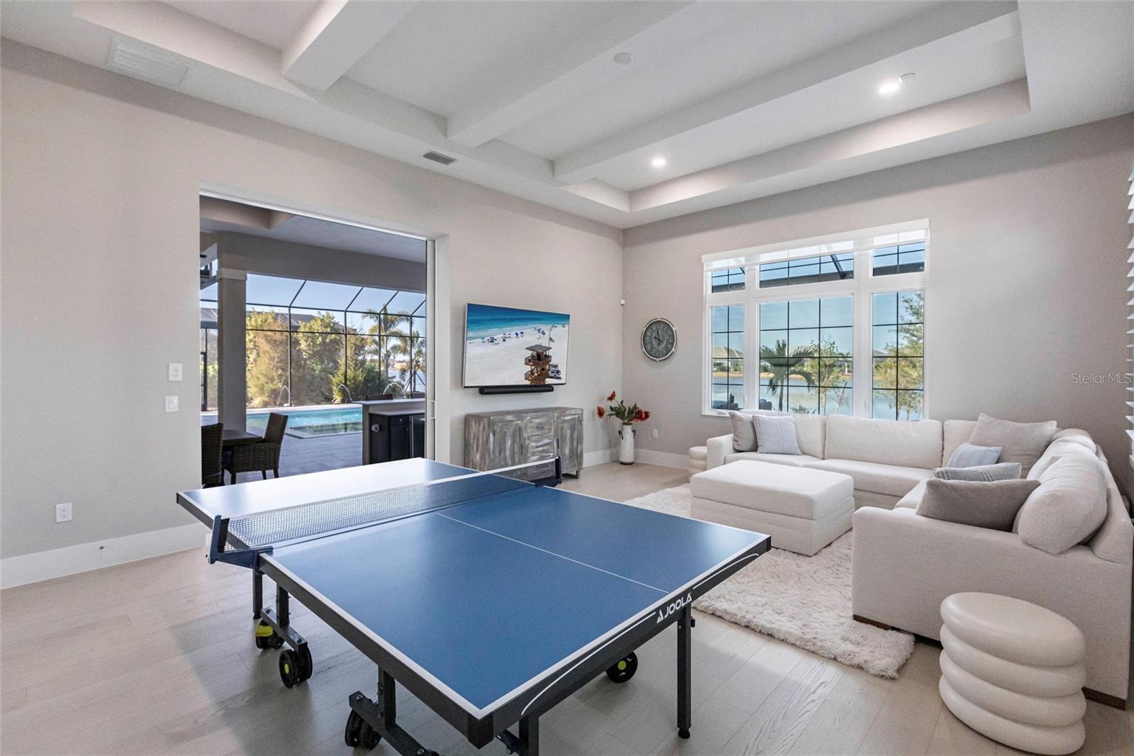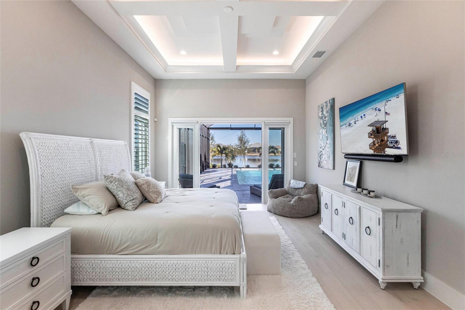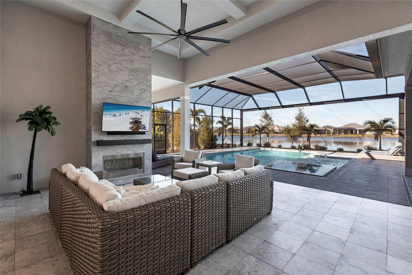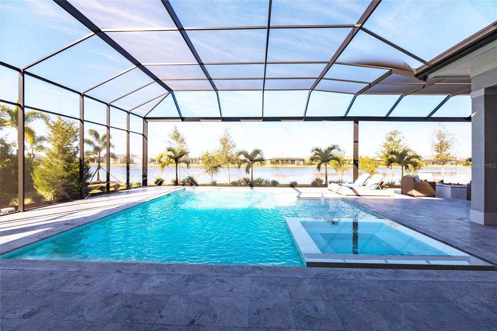 Experience refined Florida living in this nearly brand-new 2024 Stock Home, beautifully positioned to capture stunning full lake views and designed for effortless indoor-outdoor living. This exceptional residence offers an open split-floor plan, soaring ceilings, and designer finishes throughout, creating a bright, elegant, and inviting atmosphere from the moment you enter. Spanning 3,936 sq. ft. of living space (over 5,800 sq. ft. total), the home features 3 bedrooms, 4.5 baths, a private den, formal dining room, and an expansive bonus room--ideal as a media lounge, game room, home gym, or guest retreat. The heart of the home is a chef-inspired kitchen with an oversized island, premium appliances, abundant cabinetry, and seamless flow into the spectacular great room, where 15-foot coffered ceilings and 10-foot pocket sliding doors frame sweeping water views. The primary suite is a serene retreat with direct lanai access, a spa-style bath with soaking tub and walk-in shower, and dual custom walk-in closets. Two additional guest suites each offer private ensuite baths and generous closet space. Show-Stopping Outdoor Living: The oversized, resort-style lanai with gorgeous sunset views is truly one of the home's standout features--one of the largest in the community--complete with heated saltwater pool & spa, glass fireplace for year-round ambiance, fully equipped summer kitchen, firepit with panoramic lake views, ample covered seating and entertainment space for unforgettable gatherings. Other Premium Upgrades & Comfort Features: * impact windows * Hunter-Douglas powered shades * engineered hardwood flooring * water softener * hot water recirculation system * whole-house surge protection * plantation shutters * gas water heater * irrigation system * advanced security provide both luxury and peace of mind. Located in one of Lakewood Ranch's most prestigious gated communities, residents enjoy access to a grand clubhouse, spa, fitness center, resort pools, tennis courts, and concierge-style amenities. Furniture is negotiable--move in with ease and start enjoying the Florida lifestyle immediately.