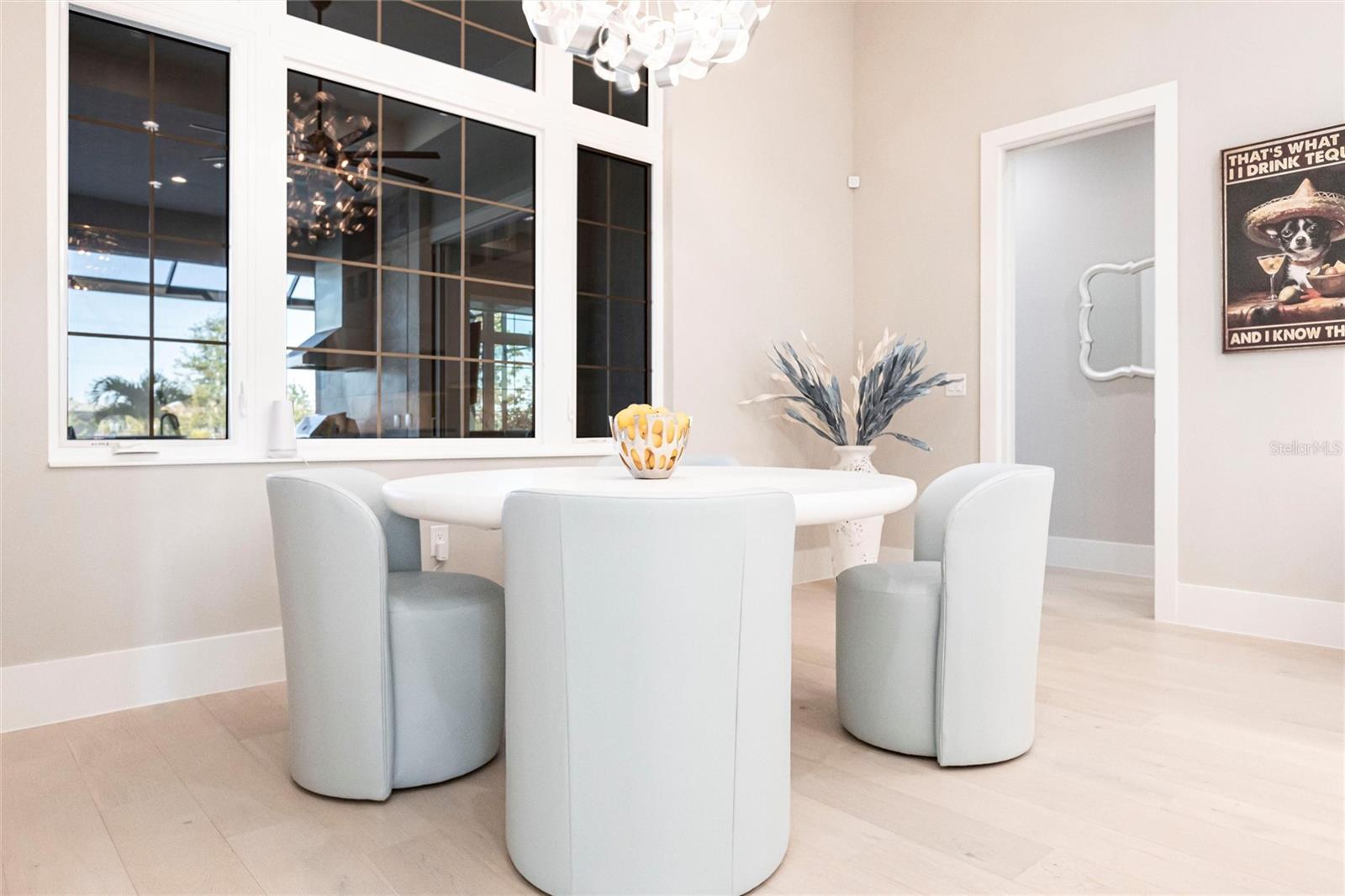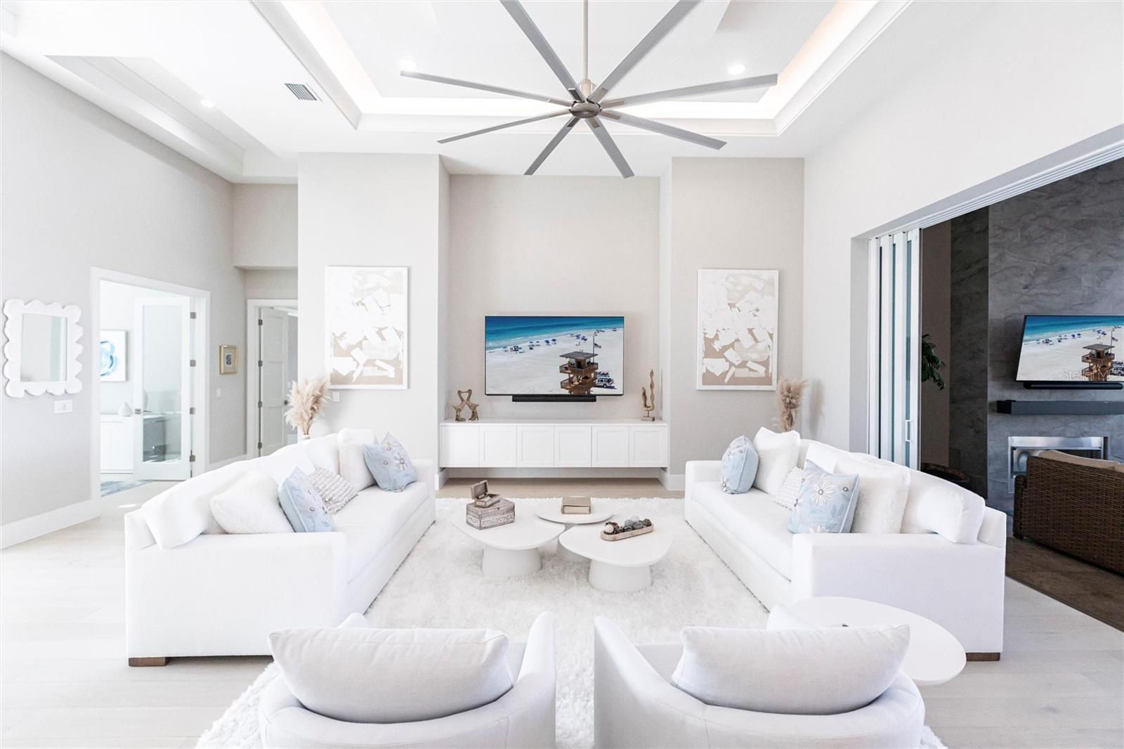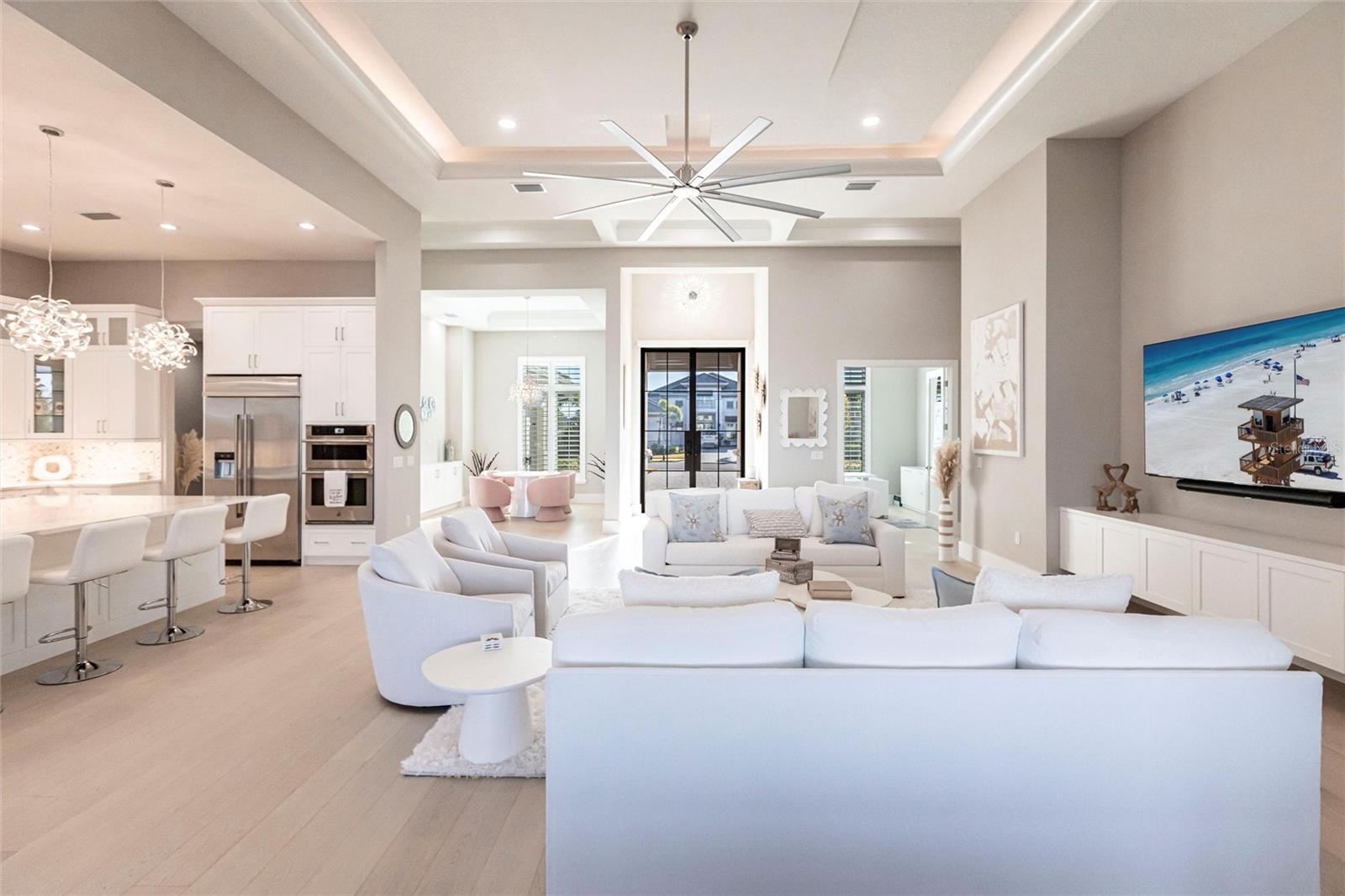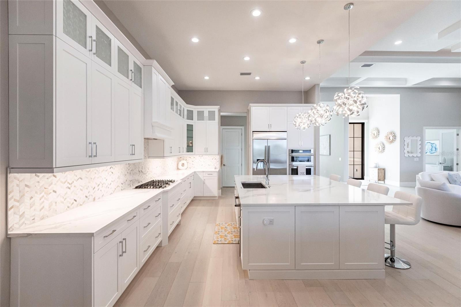 Experience refined Florida living in this nearly brand-new 2024 Stock Home, beautifully positioned to capture stunning full lake views and designed for effortless indoor-outdoor living. This exceptional residence offers an open split-floor plan, soaring ceilings, and designer finishes throughout, creating a bright, elegant, and inviting atmosphere from the moment you enter. Spanning 3,936 sq. ft. of living space (over 5,800 sq. ft. total), the home features 3 bedrooms, 4.5 baths, a private den, formal dining room, and an expansive bonus room--ideal as a media lounge, game room, home gym, or guest retreat. The heart of the home is a chef-inspired kitchen with an oversized island, premium appliances, abundant cabinetry, and seamless flow into the spectacular great room, where 15-foot coffered ceilings and 10-foot pocket sliding doors frame sweeping water views. The primary suite is a serene retreat with direct lanai access, a spa-style bath with soaking tub and walk-in shower, and dual custom walk-in closets. Two additional guest suites each offer private ensuite baths and generous closet space. Show-Stopping Outdoor Living: The oversized, resort-style lanai with gorgeous sunset views is truly one of the home's standout features--one of the largest in the community--complete with heated saltwater pool & spa, glass fireplace for year-round ambiance, fully equipped summer kitchen, firepit with panoramic lake views, ample covered seating and entertainment space for unforgettable gatherings. Other Premium Upgrades & Comfort Features: * impact windows * Hunter-Douglas powered shades * engineered hardwood flooring * water softener * hot water recirculation system * whole-house surge protection * plantation shutters * gas water heater * irrigation system * advanced security provide both luxury and peace of mind. Located in one of Lakewood Ranch's most prestigious gated communities, residents enjoy access to a grand clubhouse, spa, fitness center, resort pools, tennis courts, and concierge-style amenities. Furniture is negotiable--move in with ease and start enjoying the Florida lifestyle immediately.