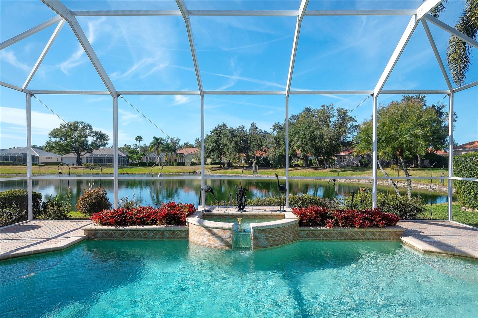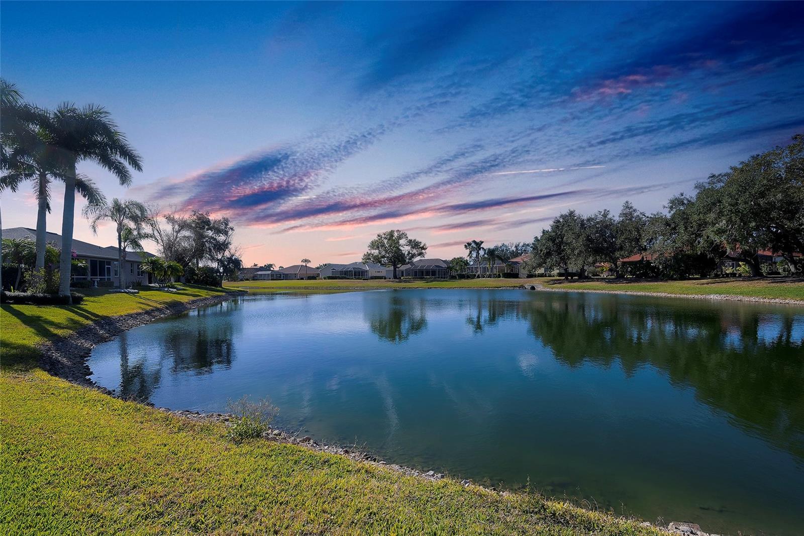 The "Savannah" by Rosecorp Homes-- beautiful "Great Room" floor plan with an oversized garage, tile roof, paver driveway, custom closets, bamboo hardwood floors in office, -- pool and paver lanai overlooks a pond, 3 bedrooms and a den that could also be used as a bedroom. Meticulously maintained with wonderful upgrades--Sunlight retractable lanai awning, new AC one year old, new refrigerator 2024, new hot water heater 2025, new gutters 2024, interior painted 2024, exterior painted 2025. Home is completely ready for it's new owner. River Wilderness Golf and Country Club has two manned guard gates and a community boat ramp on the Manatee River. Golf, tennis, pickle ball, athletic and social memberships are available but are not mandatory. The Ft. Hamer Bridge that connects Parrish to Lakewood Ranch is only minutes from this community.