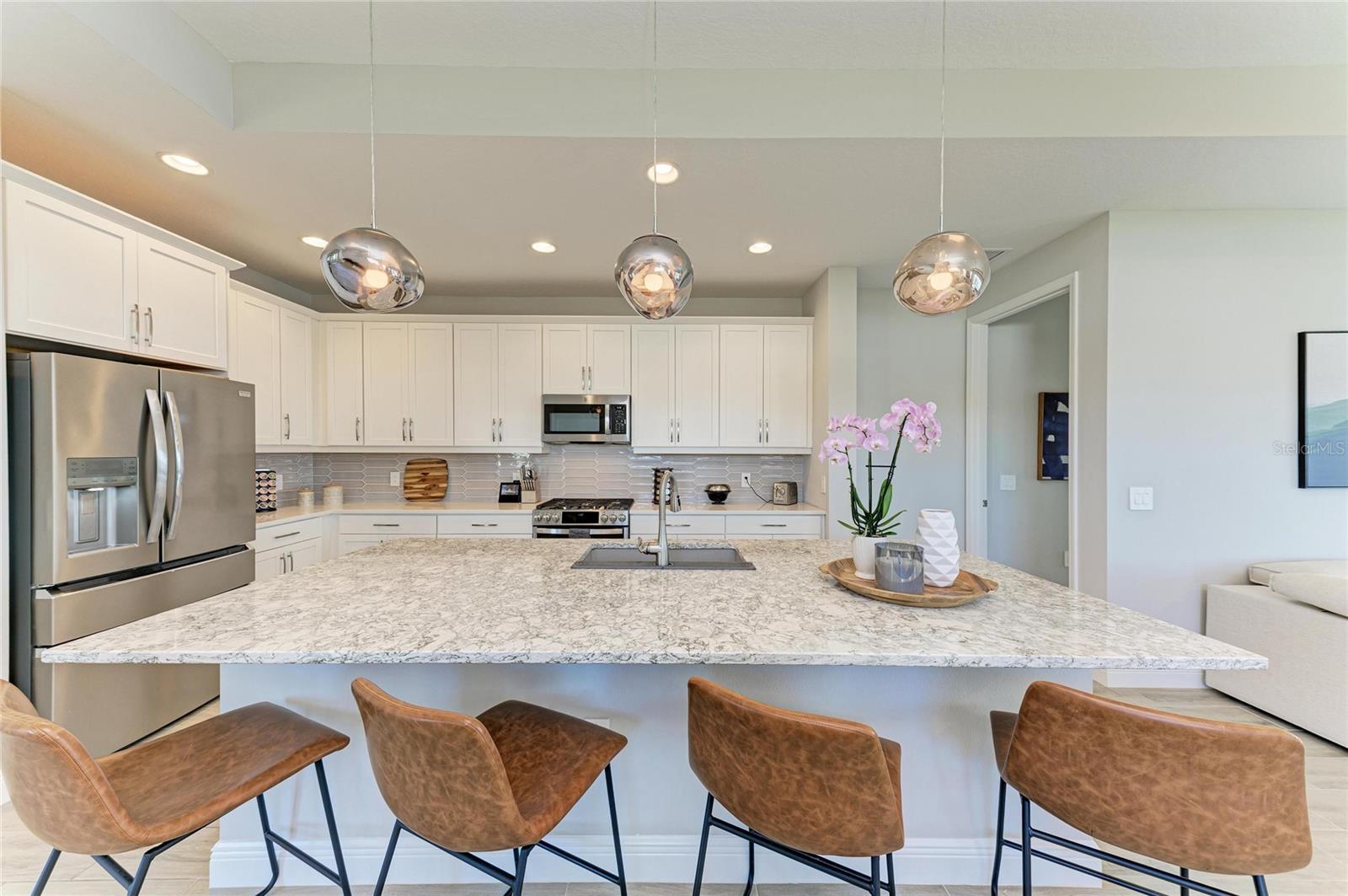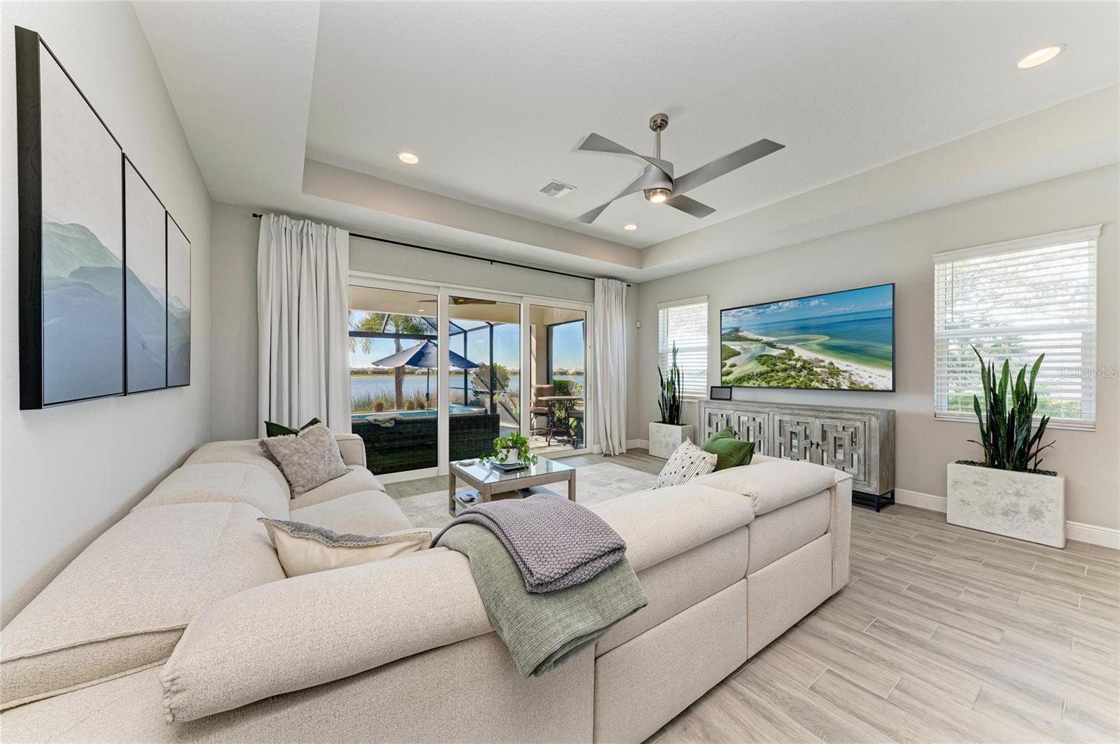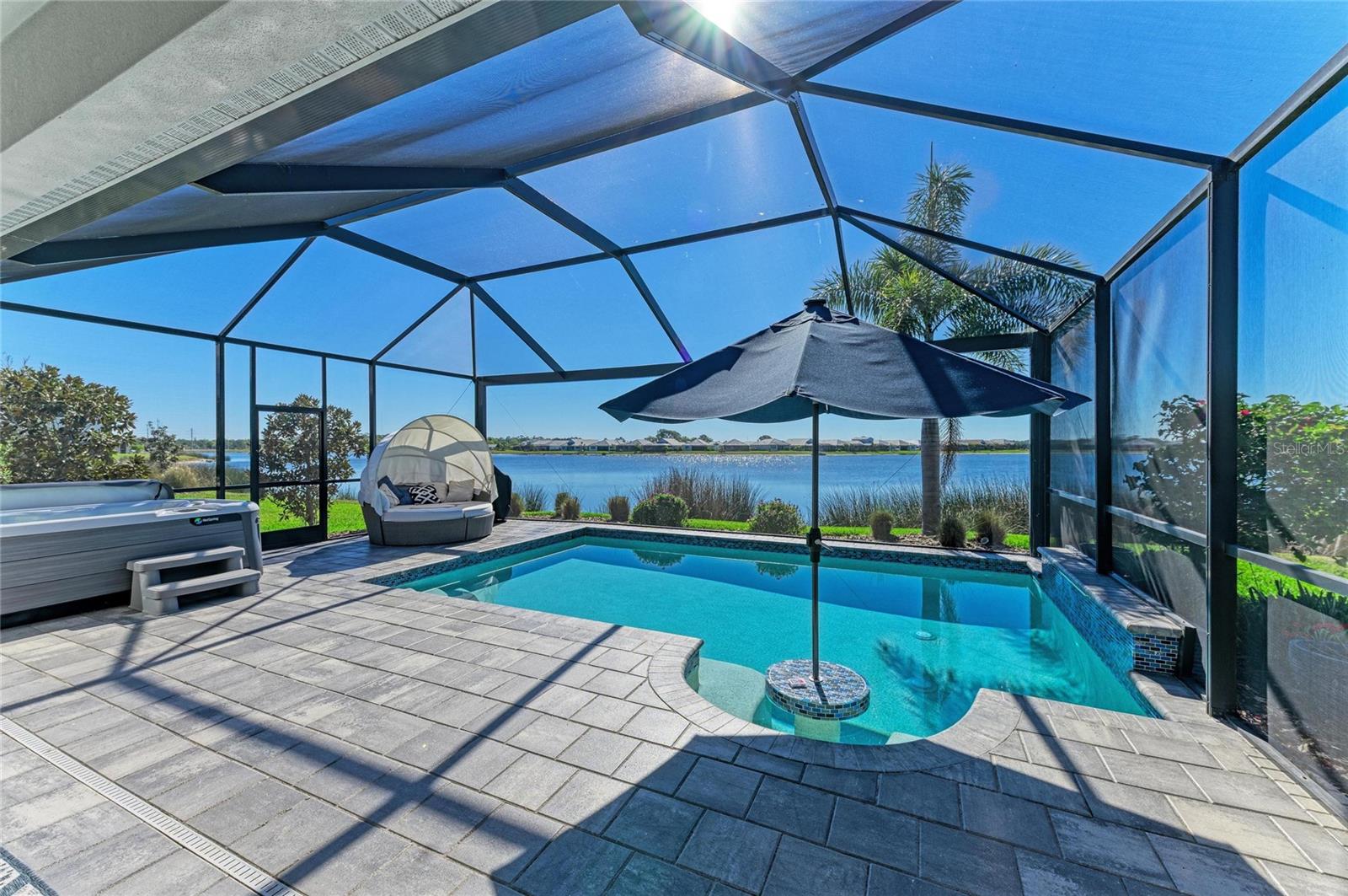 Set along the tranquil shores of Lake Ibis, this exceptional lakefront residence showcases spectacular, long, uninterrupted water views and breathtaking sunset vistasthat define true Florida living. Built in 2022 by Homes by Towne, the Skiff floor plan offers thoughtful design, quality construction, and an enviable waterfront setting. Spanning 2,158 square feet, the home features three bedrooms, two full baths, a dedicated office/den, and an open-concept layout designed to maximize natural light while framing the stunning lake views from multiple living areas. The kitchen is both stylish and functional, featuring quartz countertops, custom cabinetry with soft-close drawers and pull-out shelving, under-cabinet lighting, stylish backsplash, and a layout ideal for everyday living or elaborate entertaining. The great room opens seamlessly to an extended lanai with a full-view screen enclosure, preserving clear sightlines across the water and front-row views of vibrant sunsets. The outdoor living area is a true highlight, offering a pool, separate standalone spa, generous covered seating area, an ideal setting for morning coffee overlooking the lake or evening gatherings as the sun sets aglow with color over the water. The owner's suite is positioned to capture serene water views and glowing sunsets, creating a peaceful retreat complemented by a spa-inspired bath with dual quartz vanities, and upgraded finishes. Two additional bedrooms and full bath on the other side of the home provide private flexibility for guests or family, while a light-filled office offers a quiet space for work or hobbies. Additional features include a large laundry room and a two-car garage with epoxy flooring and storage. Residents of LakeHouse Cove enjoy resort-style amenities, including a pool and spa, state of the art fitness center, clubhouse with catering kitchen, boathouse with kayak launches, pickleball courts, fire pits, dog parks, and a full calendar of social activities. Be as social as you want within this community. Conveniently located just minutes from Waterside Place, Lakewood Ranch Main Street, University Town Center, and downtown Sarasota, this exceptional residence offers effortless access to world-renowned beaches, celebrated cultural attractions, and Sarasota-Bradenton International Airport. A short journey opens the door to Florida's iconic theme parks, adding yet another dimension to the lifestyle. This is a rare opportunity to enjoy spectacular lake views, unforgettable sunset vistas, and the peace of mind that comes with newer construction, all within one of Lakewood Ranch's most sought-after communities.