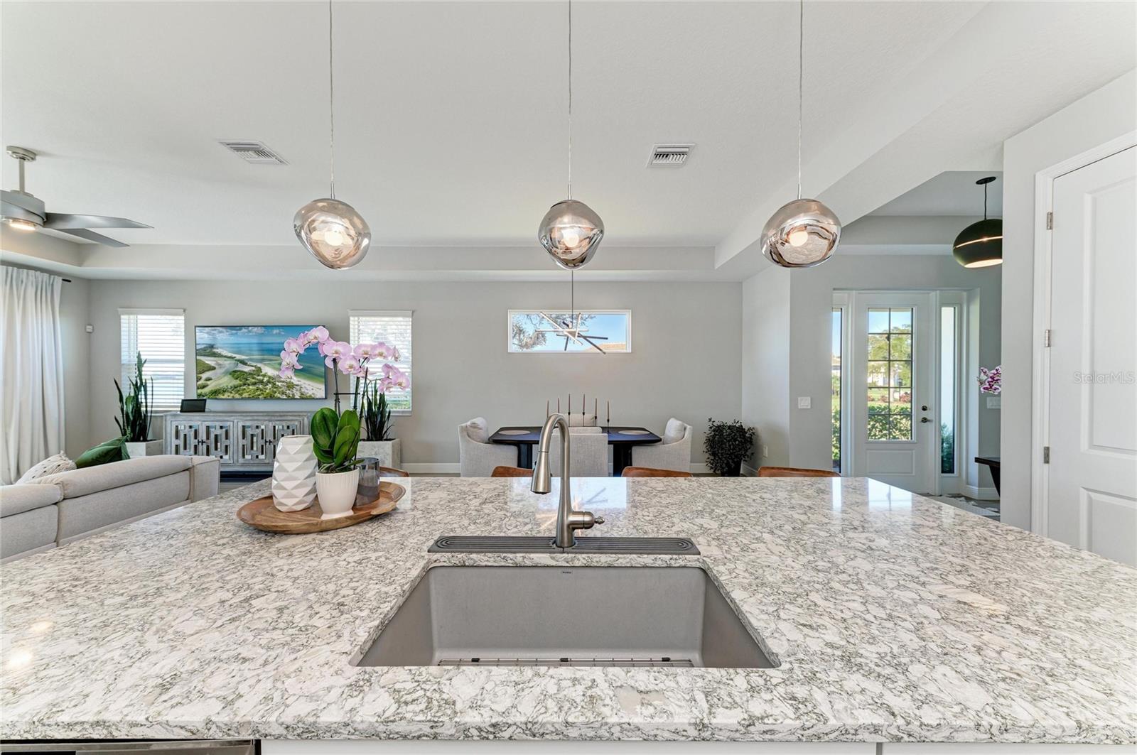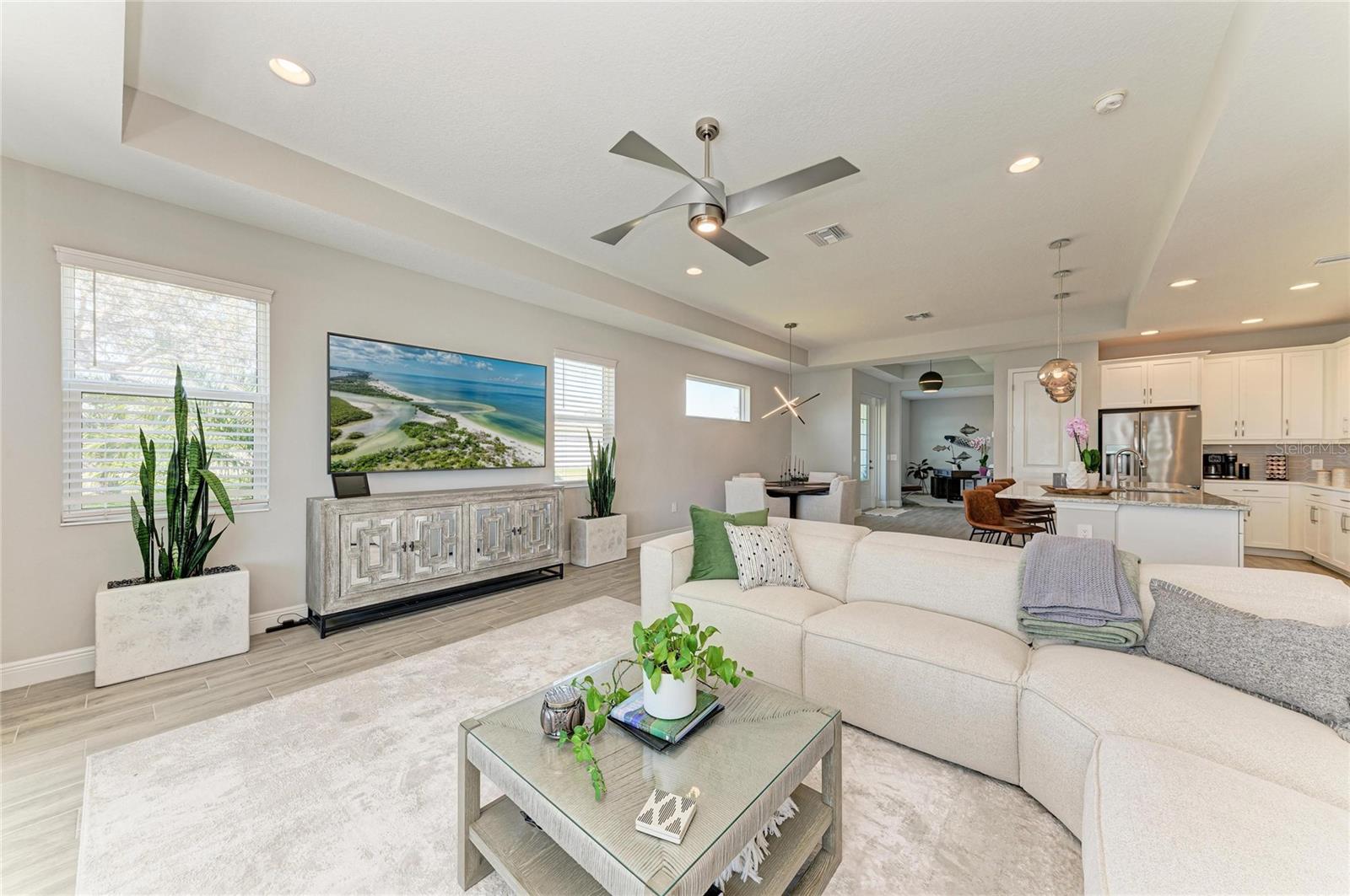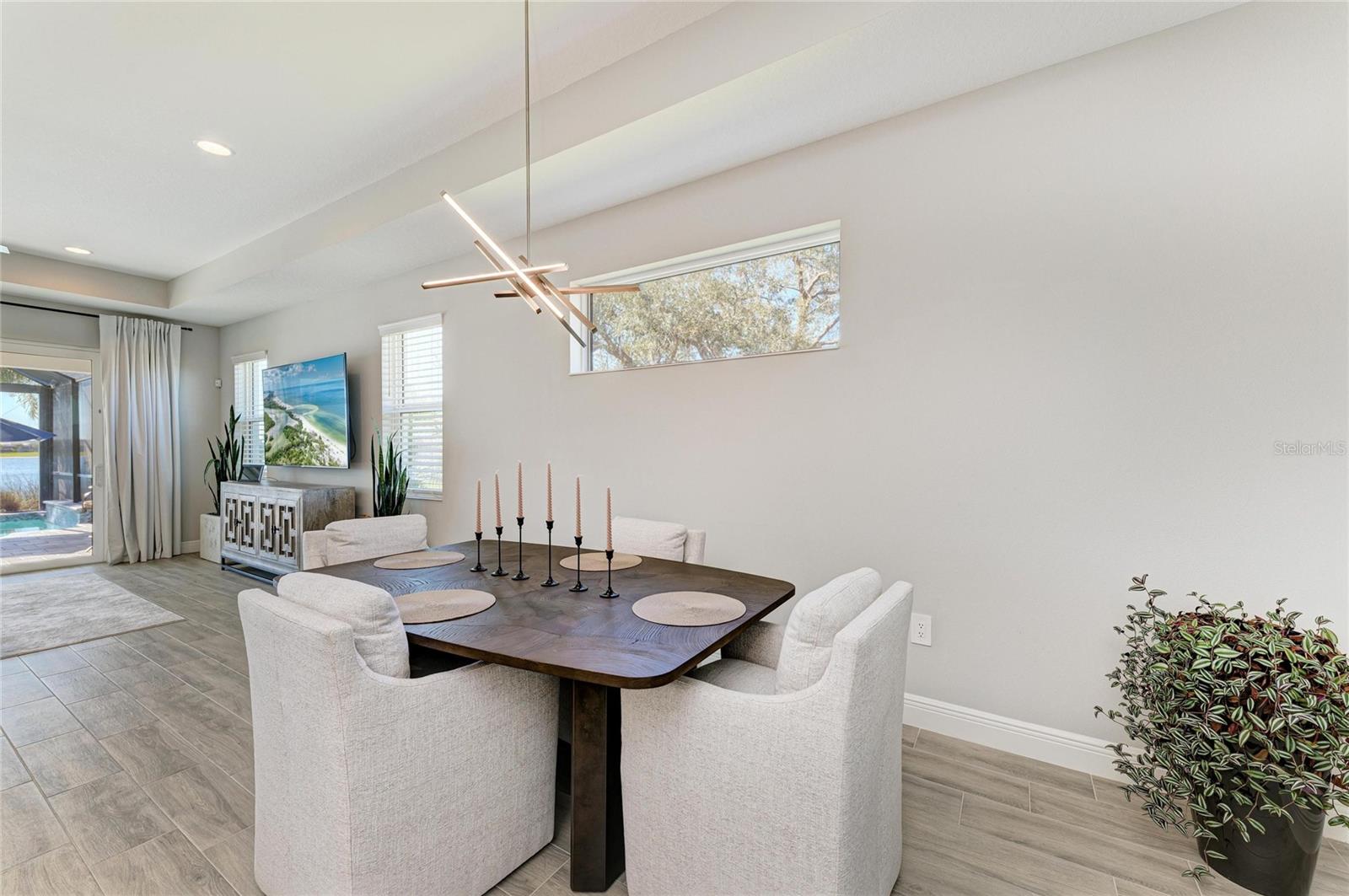 Set along the tranquil shores of Lake Ibis, this exceptional lakefront residence showcases spectacular, long, uninterrupted water views and breathtaking sunset vistasthat define true Florida living. Built in 2022 by Homes by Towne, the Skiff floor plan offers thoughtful design, quality construction, and an enviable waterfront setting. Spanning 2,158 square feet, the home features three bedrooms, two full baths, a dedicated office/den, and an open-concept layout designed to maximize natural light while framing the stunning lake views from multiple living areas. The kitchen is both stylish and functional, featuring quartz countertops, custom cabinetry with soft-close drawers and pull-out shelving, under-cabinet lighting, stylish backsplash, and a layout ideal for everyday living or elaborate entertaining. The great room opens seamlessly to an extended lanai with a full-view screen enclosure, preserving clear sightlines across the water and front-row views of vibrant sunsets. The outdoor living area is a true highlight, offering a pool, separate standalone spa, generous covered seating area, an ideal setting for morning coffee overlooking the lake or evening gatherings as the sun sets aglow with color over the water. The owner's suite is positioned to capture serene water views and glowing sunsets, creating a peaceful retreat complemented by a spa-inspired bath with dual quartz vanities, and upgraded finishes. Two additional bedrooms and full bath on the other side of the home provide private flexibility for guests or family, while a light-filled office offers a quiet space for work or hobbies. Additional features include a large laundry room and a two-car garage with epoxy flooring and storage. Residents of LakeHouse Cove enjoy resort-style amenities, including a pool and spa, state of the art fitness center, clubhouse with catering kitchen, boathouse with kayak launches, pickleball courts, fire pits, dog parks, and a full calendar of social activities. Be as social as you want within this community. Conveniently located just minutes from Waterside Place, Lakewood Ranch Main Street, University Town Center, and downtown Sarasota, this exceptional residence offers effortless access to world-renowned beaches, celebrated cultural attractions, and Sarasota-Bradenton International Airport. A short journey opens the door to Florida's iconic theme parks, adding yet another dimension to the lifestyle. This is a rare opportunity to enjoy spectacular lake views, unforgettable sunset vistas, and the peace of mind that comes with newer construction, all within one of Lakewood Ranch's most sought-after communities.