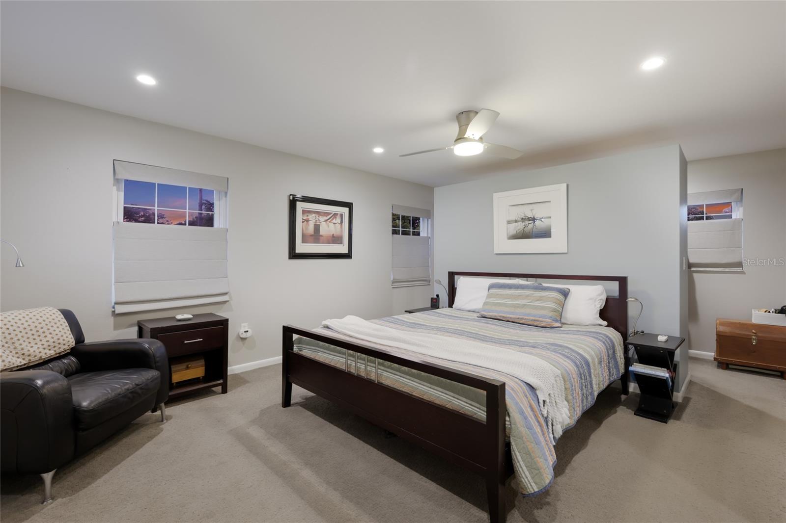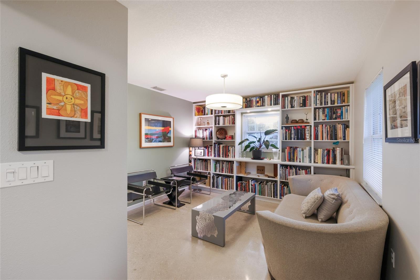 Discover the ultimate coastal retreat at 428 Sapphire Drive, a stunning block-construction residence situated on a rare and expansive double lot in the prestigious Sapphire Shores area. A long driveway and winding sidewalk lead you through a beautifully landscaped front yard to this secluded haven, which is set back from the street for maximum privacy. Inside, the home exudes a modern, industrial-chic aesthetic featuring sleek polished concrete floors, soaring vaulted ceilings, and a fresh interior paint palette.The open-concept gourmet kitchen is a focal point, illuminated by a bright skylight and appointed with premium Quartz countertops, abundant cabinetry, and a high-end stainless appliance suite including a Bosch cooktop and refrigerator alongside a KitchenAid double oven. The thoughtful layout offers exceptional flexibility; the current library, featuring a recently replaced north-facing impact window, was originally a third bedroom and can easily be restored to its original configuration. Seamlessly connecting the interior to the outdoor oasis are sliding pocket glass doors that retreat to open the living area to the lanai, offering both an elegant architectural feature and an added layer of protection for the block-construction core.The master suite serves as a private sanctuary with its own bay-facing impact window, a spacious walk-around closet, and a luxurious ensuite bathroom featuring a deep soaker tub and a separate walk-in shower. Significant structural upgrades provide peace of mind, including a new metal roof installed in 2023 and brand-new hurricane-rated garage doors added in 2025. The epoxy-finished garage also comes equipped with a Tesla charging station, catering to modern efficiency.The outdoor living space is a true oasis, fully enclosed by a vinyl privacy fence. Relax in the heated saltwater pool surrounded by elegant Shellock pavers, or enjoy the convenience of the lanai's solar shower. The sprawling backyard is a nature lover's dream, boasting a dedicated butterfly garden, a cozy fire pit, and an irrigation system powered by well water. A versatile detached storage building, currently utilized as a home gym, is equipped with its own air conditioning unit and dedicated kayak storage. Perfectly positioned just minutes from Downtown Sarasota, this home is also a short stroll from the Ringling Museum and the scenic bayfront paths of Sapphire Shores Park.