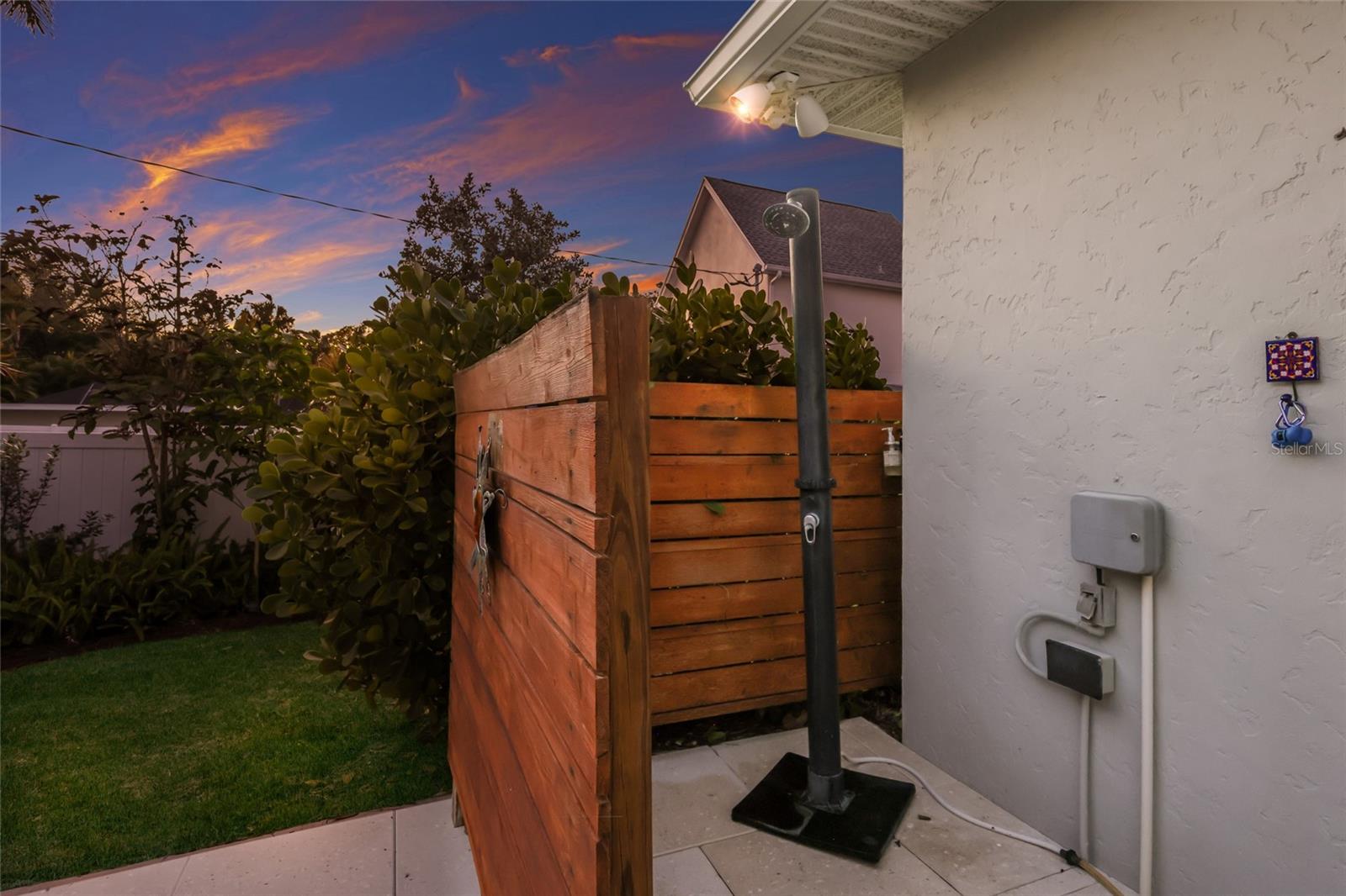 Exterior: Fire Pit, Hurricane Shutters, Outdoor Shower, Sidewalk, Sliding Doors, Storage