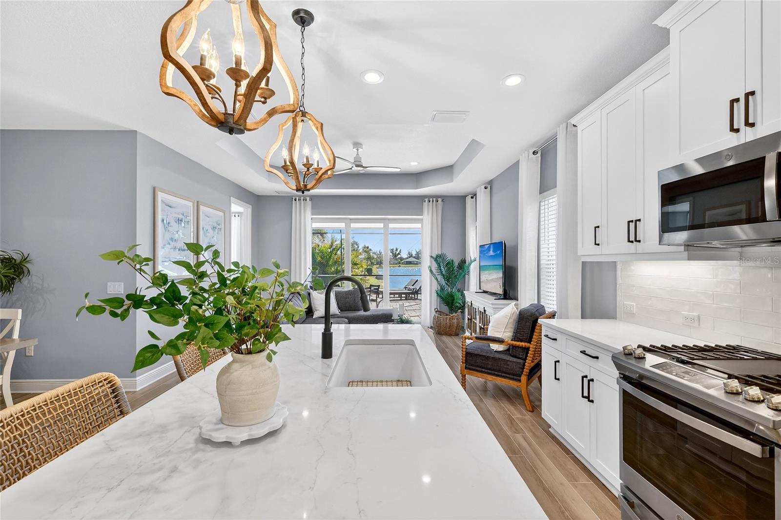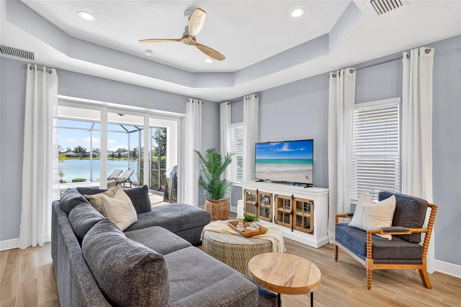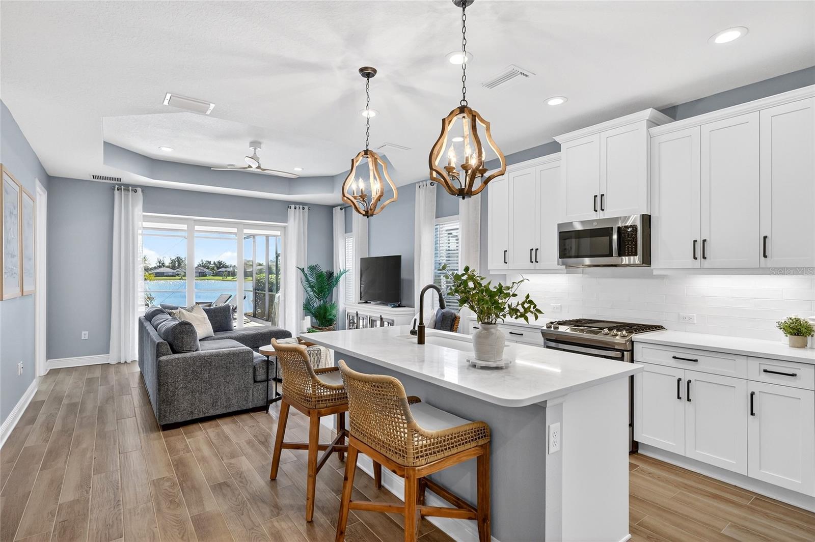 This 3-bedroom, 2-bath home with a den offers a pool, a water view, and standout storm protection with impact windows and doors plus automated hurricane screens on the covered lanai. Enjoy an easy indoor-outdoor layout with a pocket sliding door that opens wide to the lanai and view.The kitchen is finished with quartz countertops, stainless appliances, an island, a single-basin undermount sink, upgraded pendants and chandelier, and a custom pantry. Inside, wood-look tile flooring pairs with tray ceiling detail, quartz countertops throughout, and upgraded carpet in the bedrooms. The primary suite includes a barn door and a custom walk-in closet. Comfort and efficiency upgrades include a smart thermostat, UV light in the furnace, and spray foam insulation. Outdoors, the pavered lanai is set up for an outdoor kitchen with pre-plumb, complemented by the pool and water view, plus a Google Nest doorbell. The laundry room includes added cabinetry, and the garage features epoxy floors.HOA COVERS: Lawn care, Swimming Pool and Spa, Fitness Center, Clubhouse with Catering Kitchen, PickleBall, Bocce Ball, Manager, Onsite Activities Director, Security Gates. LOCATION: Centrally located. Just outside the gates are A+ schools, Gullett Elementary, Lakewood Ranch High School, and Mona Jain Middle School, LECOM, & Manatee Tech East Campus. Minutes to shopping, restaurants, gyms, salons, bars, etc. Minutes to downtown, Sarasota International Airport, the top rated beaches in the country, UTC Shopping.
