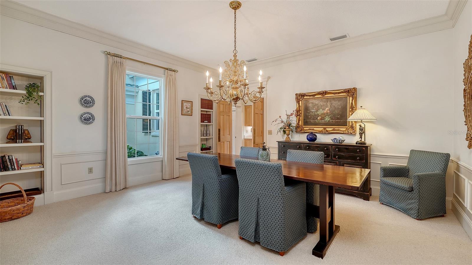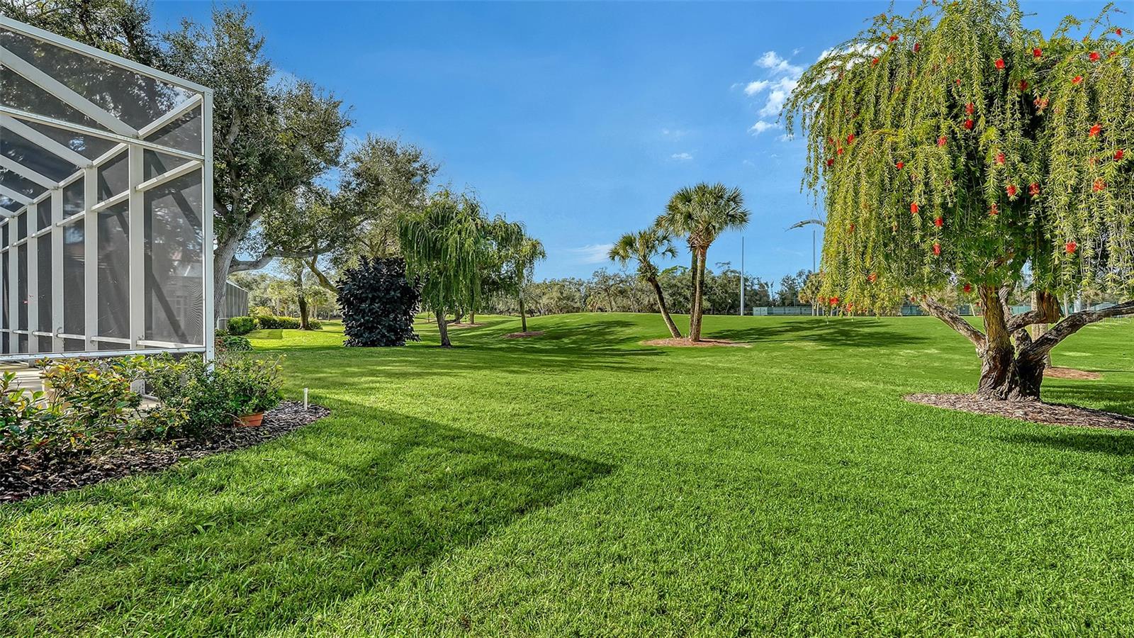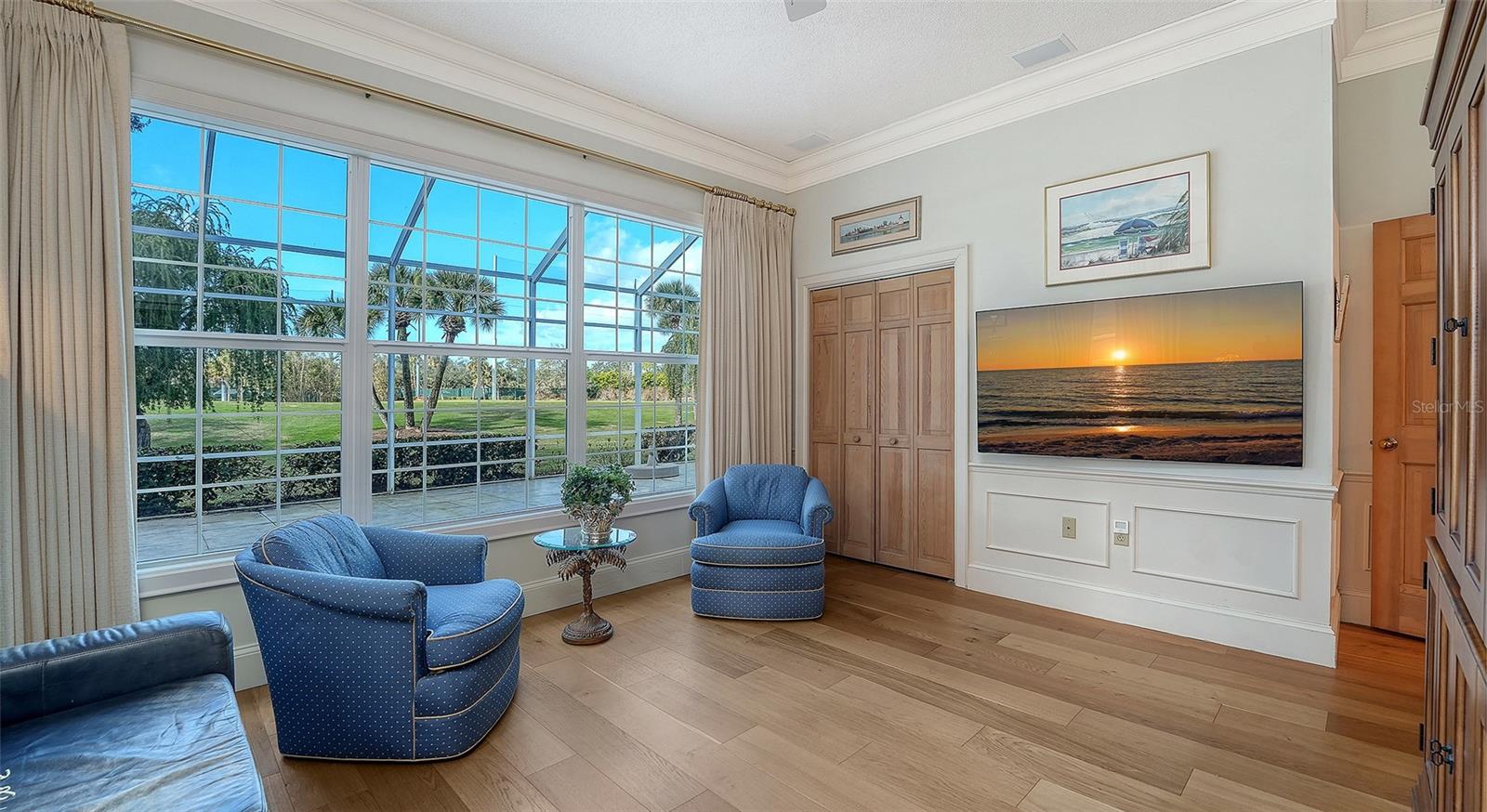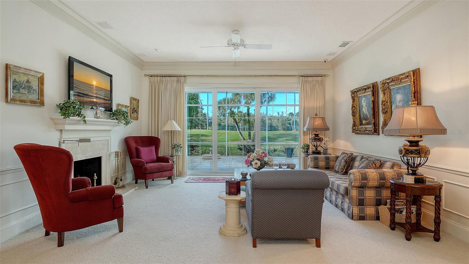 Experience the charm and wonderful location of this golf course home on Saint James Park, the leafy and quiet cul-de-sac where you can walk to tennis, golf, pickleball, croquet, heated pool and state of the art fitness center all within The Oaks Country Club, where the luxury lifestyle awaits! This 2 bedroom, 2 bath traditional home overlooks the first hole of the Eagle Golf course, and is being offered completely furnished, easy to maintain, and is move in ready. The roof is new in 2024, and all windows and sliding doors are newer and hurricane impact. Custom designed by Bo MacEwen, the architect who designed the clubhouse, features include crown molding, wainscoting, built-ins throughout, a wood burning fireplace, split bedrooms, both ensuite with wood floors, and open views from most rooms. The kitchen has a light and bright breakfast area. The expansive screened lanai is 20 feet by 48 feet, and the oversized two car garage has a charging station for your electric car. Saint James Park is the residential area closest to the athletic facilities so residents can easily walk or bike to all facets of the club, including dining as well as a social atmosphere that encourages all to stay engaged in all The Oaks Club has to offer. For those electing golf, the ability to play the two courses is immediate, no waiting period. Also, The Oaks has been designated a Platinum Club of America, and an Emerald Club, signifying it's standing among the finest in Florida, not to mention 20 minutes to the best beaches in Sarasota County! Membership is required, either Social or Golf. Be sure to see this special home and begin enjoying a well rounded lifestyle!