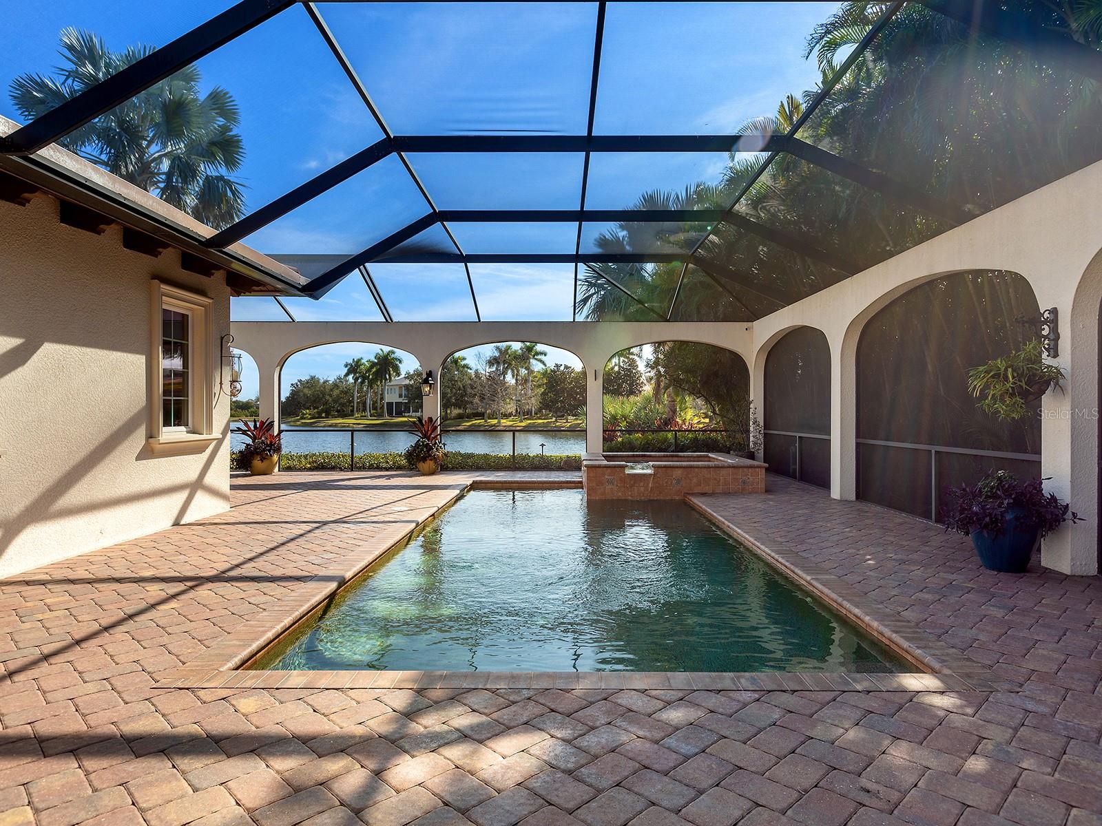 Set within The Lake Club at Lakewood Ranch, this home offers thoughtfully designed indoor-outdoor living, introduced by a gated courtyard entry, paver drive, paver walkways, landscaped grounds, exterior lanterns, and a landscaped front island. Travertine flooring spans the main living areas, with engineered wood floors throughout all bedrooms. A glass front door opens to a foyer with grasscloth wallcovering, while center-pocketing impact-rated sliders connect the great room directly to the lanai. The great room features plaster-textured walls, crown molding, brick archways, soaring 18-foot ceilings with exposed beams, abundant natural light, and motorized shades. The kitchen centers around an oversized island with extended breakfast bar seating and includes a Thermador appliance suite with a paneled refrigerator and freezer, a gas cooktop with griddle, double ovens, a warming drawer, a microwave, a paneled Bosch dishwasher, and a U-Line wine cooler. Additional features include granite countertops, a coffee bar, pot filler, decorative backsplash framed by wood and brick, custom pantries, and upgraded lighting, with the dining area positioned nicely between the kitchen and family room, making it ideal for entertaining. The primary wing features French doors to the lanai and is adorned with walls of windows overlooking the pool, fire pit, and lake. Additionally, this primary suite is appointed with crown molding, designer draperies, and motorized blinds. The luxurious bath offers separate granite vanities, a floor-to-ceiling tiled walk-in shower, a sunken soaking tub framed by windows, and a private water closet. The expansive custom closet includes built-ins, a center island with locking drawers, an integrated hamper, and a chandelier. Both guest bedrooms are en-suite. One guest bedroom is equipped with a double-door entry and a custom Murphy bed, and the other offers a built-in closet, granite vanity, and a walk-in shower with ceiling-height tile and a window. Interior features also include a half bath with a brick archway and linen storage, hallway storage, and a laundry room that includes granite counters, ample cabinetry, a sink, a window, and trim detailing. The lanai features a heated saltwater pool and spa with a Pentair heater, paver decking, exposed ceiling beams, dual ceiling fans with lighting, motorized shades, remote-controlled awnings, and brick archways. A linear electric fireplace finished in Crema Marfil marble with built-in bench seating and a gas fire pit overlooking the lake. The outdoor kitchen includes granite countertops, a sink, hood, and complementary brick and Crema Marfil finishes. FGBC-certified for energy efficiency and comfort, this smart home features Icynene spray-foam insulation, LED lighting, tankless gas water heater, whole-house generator, EV charger, whole-house water filtration with reverse osmosis, and Control4 and Sonos whole-home audio. Smart controls manage security, cameras, thermostat, garage doors, motorized blinds, and water heater, while the epoxy-finished garage includes EV and generator hookups. Located in The Lake Club's maintenance-free section with pool care and landscaping included, residents also enjoy resort-style amenities such as a clubhouse, pool, fitness center, tennis and pickleball courts, dining, social events, and scenic lakes for kayaking and fishing, just minutes from top-rated schools, shopping, dining, and Sarasota's beaches.
