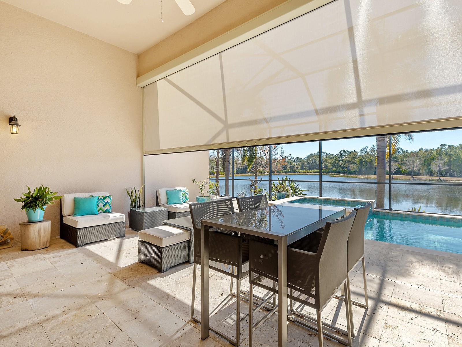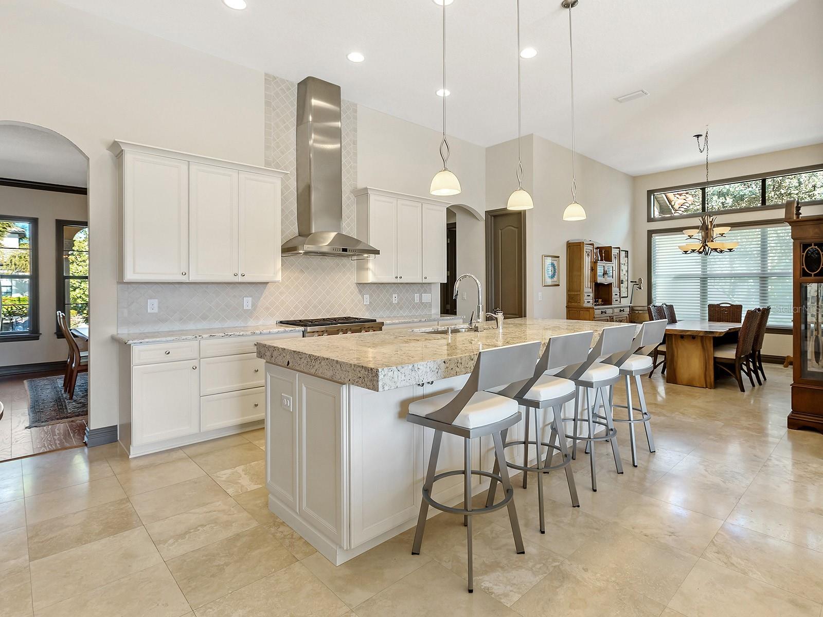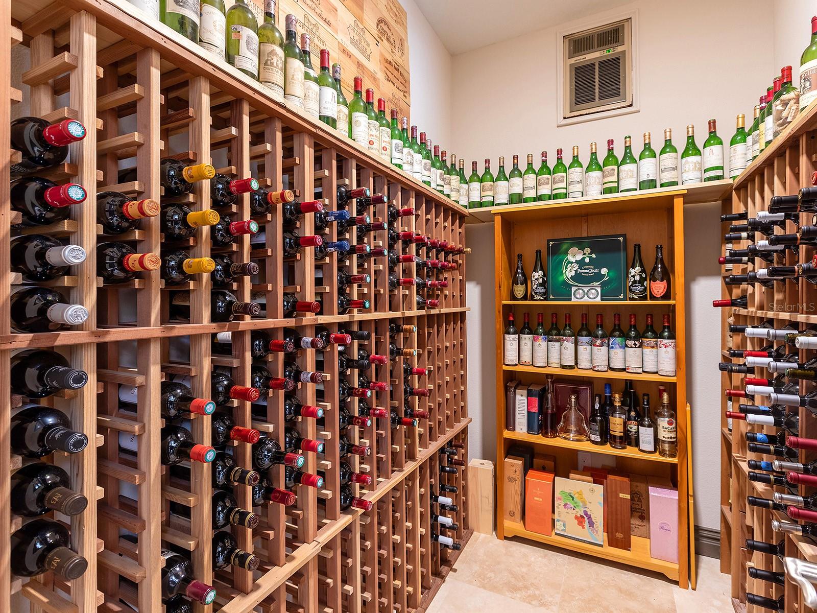 Welcome to 16818 Berwick Terrace, an exceptional Cardel Homes masterpiece tucked away at end of a quiet, sheltered cul-de-sac. Spanning nearly 3,700 square feet, this coastal-inspired residence exemplifies refined elegance and superior craftsmanship within the gated golfing community of Country Club East in Lakewood Ranch. This stunning single-story home showcases uninterrupted panoramic lake views, framed by lush landscaping and abundant wildlife, where waterfowl glide across the water and birds fill the air with song, creating a peaceful, private sanctuary. Glass entry doors open to a thoughtfully curated interior featuring travertine marble flooring and engineered hardwood flooring in all common areas including the primary suite, setting the tone for timeless luxury. At the heart of the home, the gourmet kitchen impresses with high-end appliances including Wolf and Monogram, rich wood cabinetry, and an expansive stone island that doubles as a breakfast bar, seamlessly flowing into the casual dinette and great room. The great room's soaring ceilings and disappearing sliding glass doors blur the lines between indoor and outdoor living, ideal for entertaining or relaxing. Additional living spaces include a bonus room for leisure, a private den or office near the entry, and a climate-controlled custom wine room with capacity for over 700 bottles, a showpiece for the connoisseur. The luxurious primary suite is a private retreat, offering a spacious walk-in closet and a spa-inspired en-suite bath with a soaking tub, glass-enclosed walk-in shower and dual split stone vanities. Two generously appointed guest suites, each with walk-in closets and Jack and Jim bath, provide comfort and privacy for family and visitors. Go outside to a resort-style oasis designed for the ultimate Florida lifestyle. Enjoy a heated saltwater pool and spa, a spacious covered loggia and a full outdoor kitchen, all overlooking serene lake views that complete this exceptional setting. Notable upgrades include a spacious laundry room, extensive custom storage cabinetry from the 3.5-car garage, a whole-house generator, motorized hurricane screens in the lanai, whole-house surge protection, dual HVAC systems with UV lights, tankless water heater, accordion storm shutters, tray ceilings, lush landscaping with accent lighting and elegant crown molding, enhancing beauty and functionality. This is more than a home, it's an elevated living experience. Residents of Country Club East enjoy a resort lifestyle with access to three community pools, including The Retreat, featuring a resort-style pool, fitness center, social spaces, outdoor kitchen and scenic nature trails, all included with HOA fees. Optional memberships are available at the Lakewood Ranch Golf and Country Club, offering golf and social amenities. Ideally near shopping, dining, A-rated schools, cultural venues and world-renowned beaches, this exceptional residence invites you to indulge in the lifestyle you deserve.