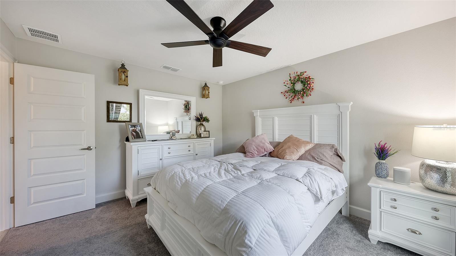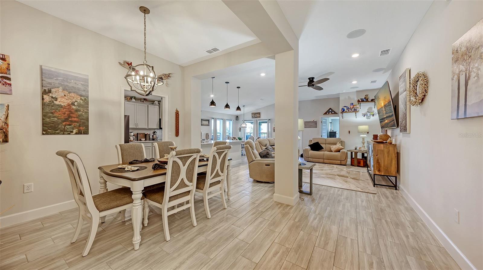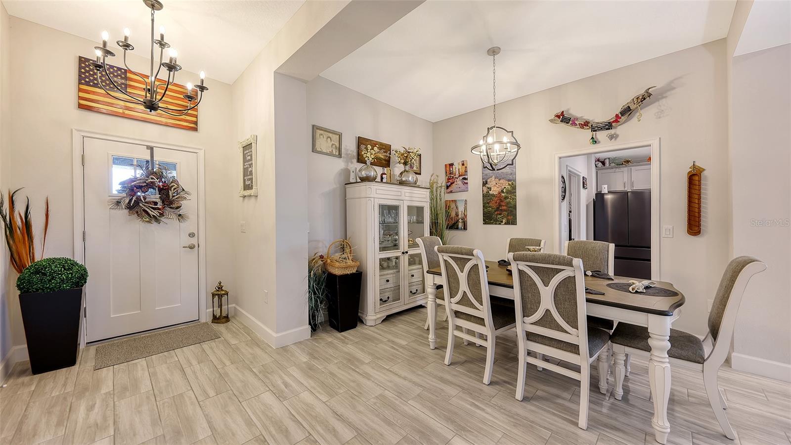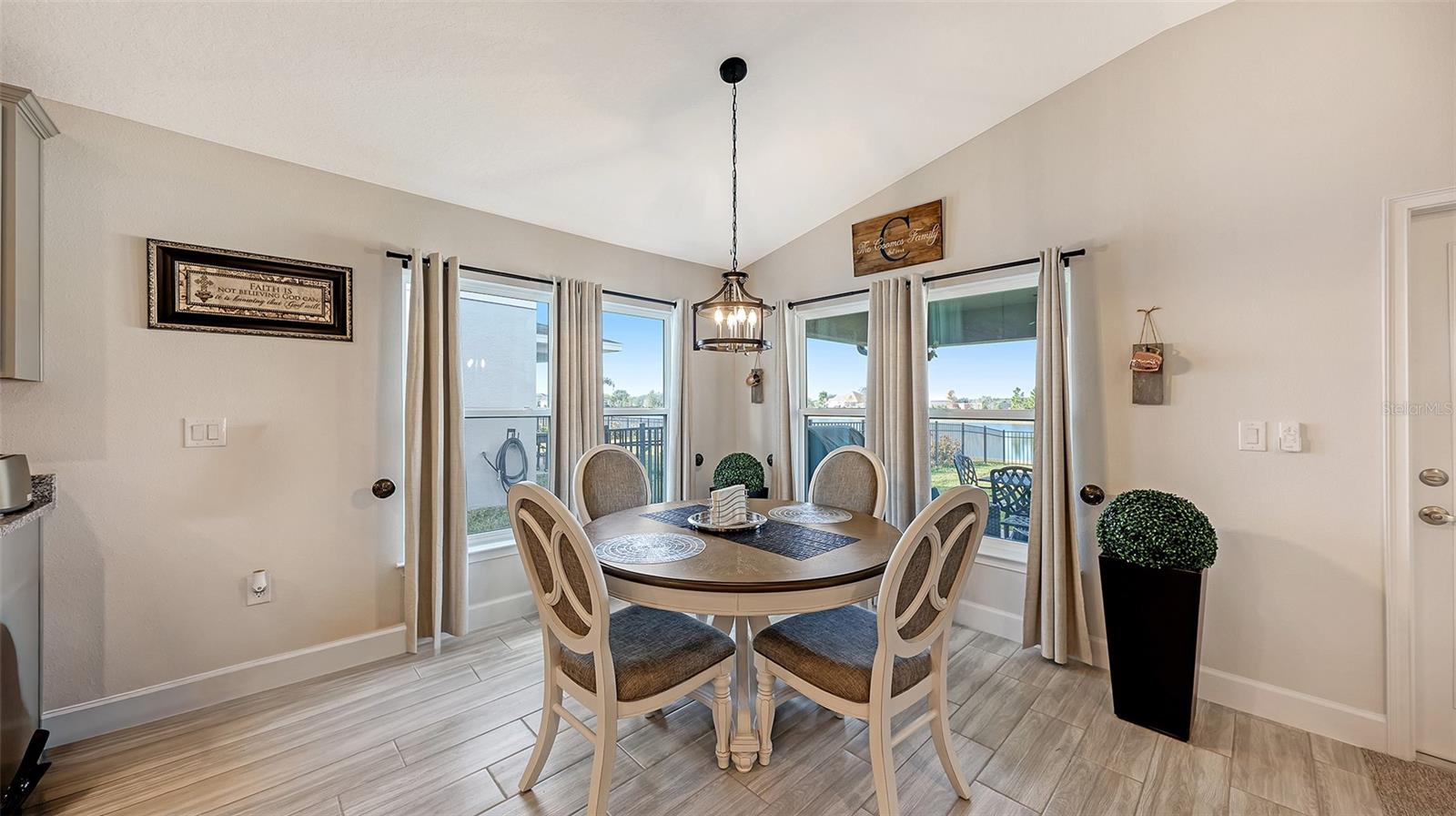 This thoughtfully upgraded home offers a bright, open layout with serene pond views and high-end finishes throughout. Wood-look tile flooring spans the main living areas, while the bedrooms are comfortably carpeted. Solid wood soft close cabinetry and granite countertops add durability and timeless appeal across the kitchen and bathrooms. The kitchen is both stylish and functional, featuring soft close wood cabinetry, granite countertops, and an upgraded Samsung Black Stainless Bespoke smart appliance package, including a french door refrigerator, air fry induction convection range, and top-control dishwasher. A formal dining room pairs nicely with a casual eat-in kitchen, making the home ideal for everyday living and entertaining. The spacious living room flows seamlessly into the dining area and kitchen, creating an inviting space for gatherings. Large windows throughout the home bring in abundant natural light and showcase peaceful pond views. The whole home, including lanai is decorated with remote ceiling fans. The primary suite is a true retreat, filled with sunlight and overlooking the water. The ensuite bathroom includes a dual-sink vanity with soft close wood shaker-style cabinetry, granite countertops, a soaking tub, and a large glass-enclosed walk-in shower and water closet, a separate huge walk-in closet features a custom "closet" design. Two additional guest bedrooms offer flexibility for family, visitors, or a home office. The guest bathroom features a standard bathtub, solid wood soft close shaker-style cabinetry, and granite countertops. Step outside to relax on the lanai while enjoying tranquil pond views. The backyard has a wrought iron fence with 2 access gates and sits next to a community-maintained preserve and walking path. This home is fully loaded with premium upgrades, including a leased full-house Tesla solar power system with a whole-home generator, gutters, updated landscaping, a RING doorbell, and an outdoor security system with cameras. The upgraded garage features epoxy-finished flooring, overhead shelving, built-in cabinetry and worktop, plus a refrigerator that conveys with the home. The laundry room is equipped with a smart upgraded LG washer, pedestal washer for handling two loads at once, a dryer with pedestal drawer for added storage, and updated cabinetry that can also function as pantry space. A SONOS surround sound system throughout the home, including the lanai and garage completes this exceptional property and enhances both daily living and entertaining.