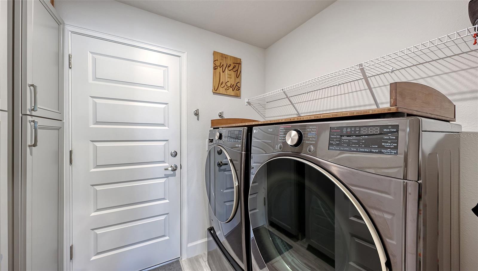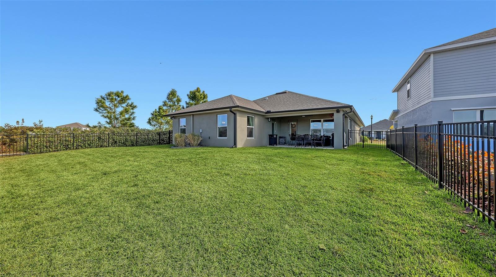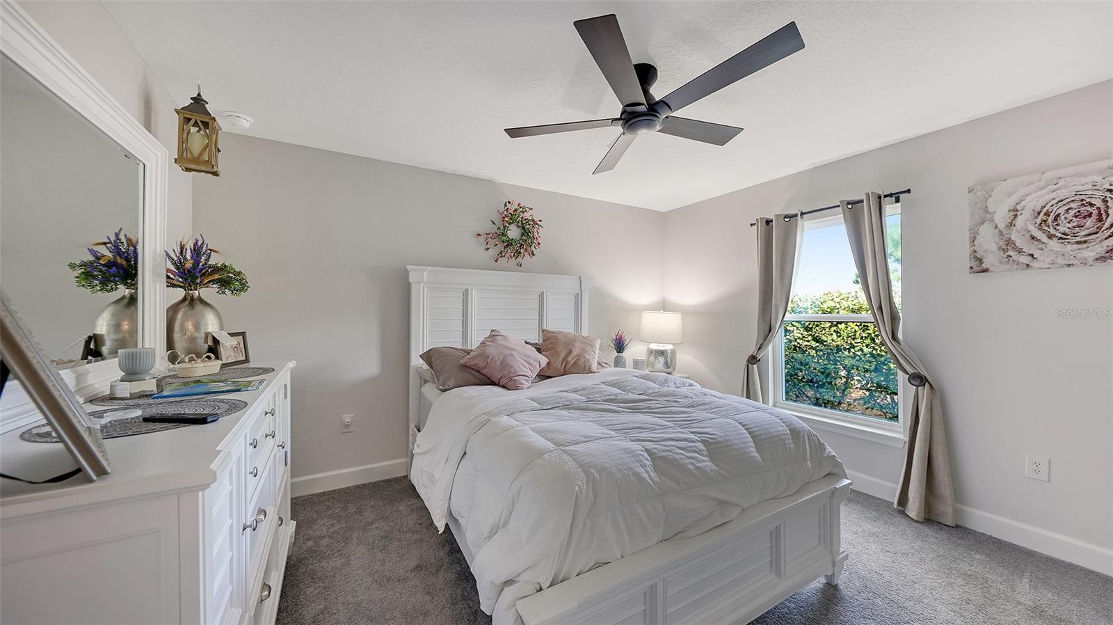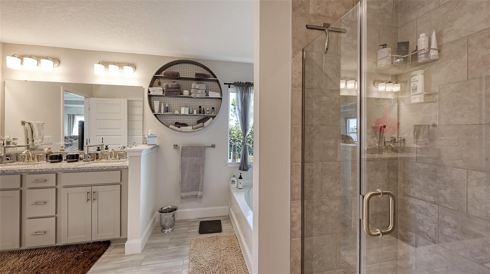 This thoughtfully upgraded home offers a bright, open layout with serene pond views and high-end finishes throughout. Wood-look tile flooring spans the main living areas, while the bedrooms are comfortably carpeted. Solid wood soft close cabinetry and granite countertops add durability and timeless appeal across the kitchen and bathrooms. The kitchen is both stylish and functional, featuring soft close wood cabinetry, granite countertops, and an upgraded Samsung Black Stainless Bespoke smart appliance package, including a french door refrigerator, air fry induction convection range, and top-control dishwasher. A formal dining room pairs nicely with a casual eat-in kitchen, making the home ideal for everyday living and entertaining. The spacious living room flows seamlessly into the dining area and kitchen, creating an inviting space for gatherings. Large windows throughout the home bring in abundant natural light and showcase peaceful pond views. The whole home, including lanai is decorated with remote ceiling fans. The primary suite is a true retreat, filled with sunlight and overlooking the water. The ensuite bathroom includes a dual-sink vanity with soft close wood shaker-style cabinetry, granite countertops, a soaking tub, and a large glass-enclosed walk-in shower and water closet, a separate huge walk-in closet features a custom "closet" design. Two additional guest bedrooms offer flexibility for family, visitors, or a home office. The guest bathroom features a standard bathtub, solid wood soft close shaker-style cabinetry, and granite countertops. Step outside to relax on the lanai while enjoying tranquil pond views. The backyard has a wrought iron fence with 2 access gates and sits next to a community-maintained preserve and walking path. This home is fully loaded with premium upgrades, including a leased full-house Tesla solar power system with a whole-home generator, gutters, updated landscaping, a RING doorbell, and an outdoor security system with cameras. The upgraded garage features epoxy-finished flooring, overhead shelving, built-in cabinetry and worktop, plus a refrigerator that conveys with the home. The laundry room is equipped with a smart upgraded LG washer, pedestal washer for handling two loads at once, a dryer with pedestal drawer for added storage, and updated cabinetry that can also function as pantry space. A SONOS surround sound system throughout the home, including the lanai and garage completes this exceptional property and enhances both daily living and entertaining.