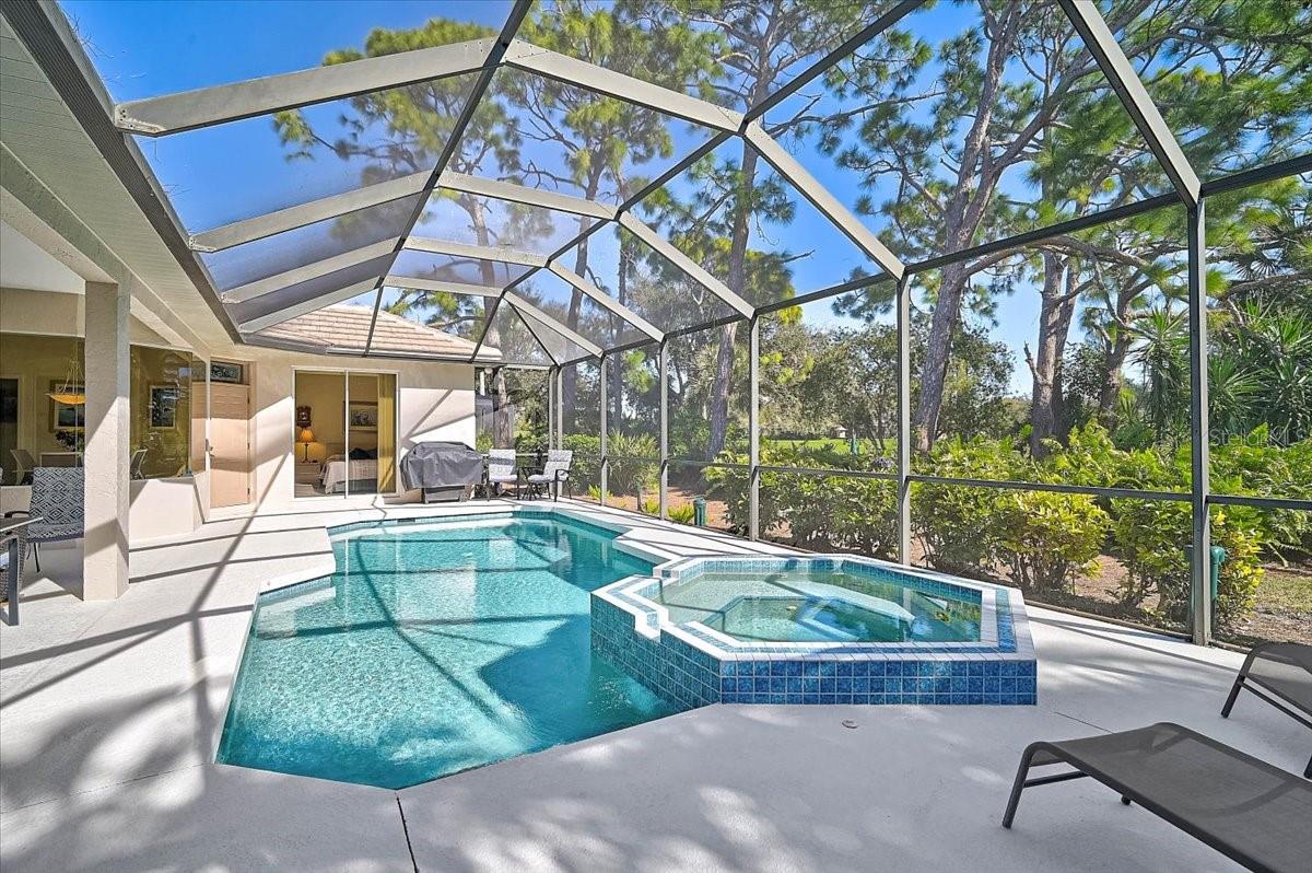 Gracefully set along the prestigious Calusa Lakes Golf Course, this impeccably maintained three-bedroom, two-bath coastal retreat offers sweeping views of the 11th fairway framed by lush, tropical greenery. Designed to embrace both luxury and tranquility, the home showcases a series of thoughtful enhancements, including a NEW ROOF in 2025, new gutters in 2021, and a freshly painted exterior completed in 2019. The light-filled kitchen has been elegantly refreshed with custom-refaced cabinetry and timeless granite countertops, creating a refined space ideal for both intimate mornings and effortless entertaining. The primary suite serves as a serene sanctuary, featuring dual walk-in closets and private access to the lanai--inviting seamless indoor-outdoor living and moments of relaxation in your private pool with NEW PUMP and the hot tub. Tile flooring throughout the main living areas is complemented by luxury vinyl in the bedrooms, offering a clean, modern aesthetic with effortless maintenance. The home's western exposure bathes the interiors in soft natural light, setting the perfect scene to savor morning coffee while gazing over your private pool and the manicured fairway beyond. This home is being offered TURNKEY FURNISHED less a few personal items to make your move even more convenient. Residents enjoy the convenience of a private community back gate, providing quick access to major highways and the new Sarasota Memorial Hospital. Ideally located just minutes from the white-sand beaches, upscale dining, and charming boutiques of Venice Island, this residence embodies refined coastal living at its finest. An exceptional opportunity to experience elegance, comfort, and the relaxed sophistication of Florida's Gulf Coast lifestyle. BE SURE TO VIEW THE 3-D TOUR!