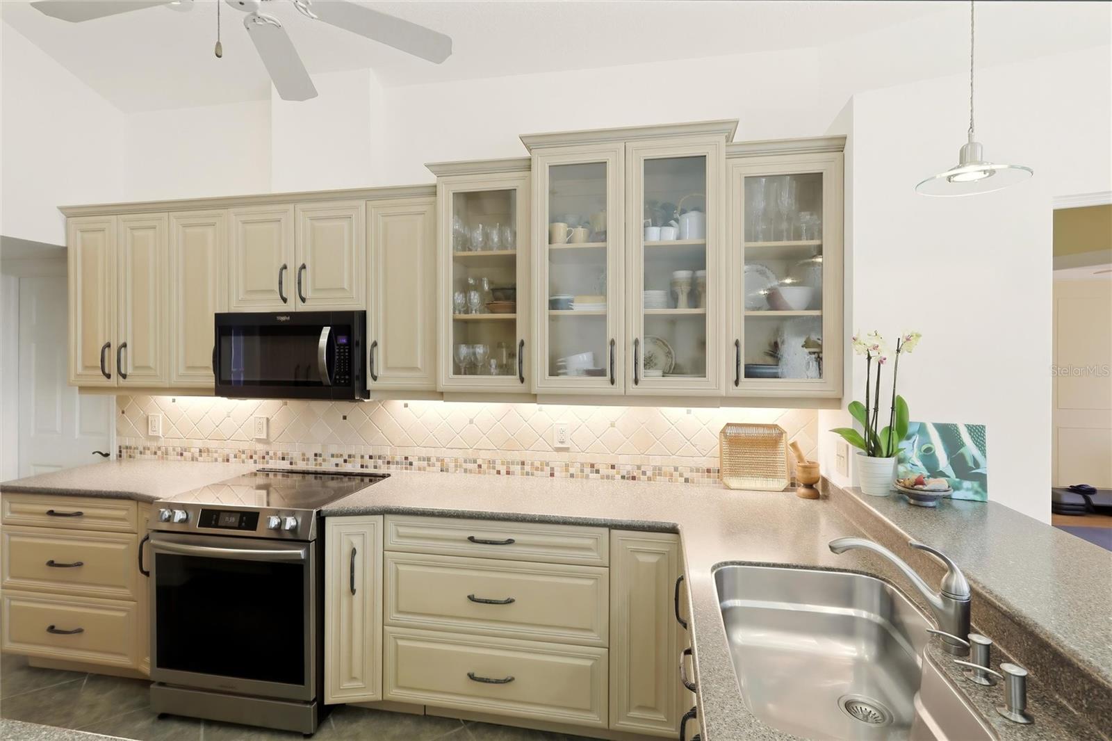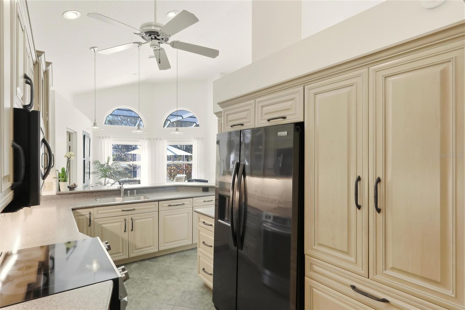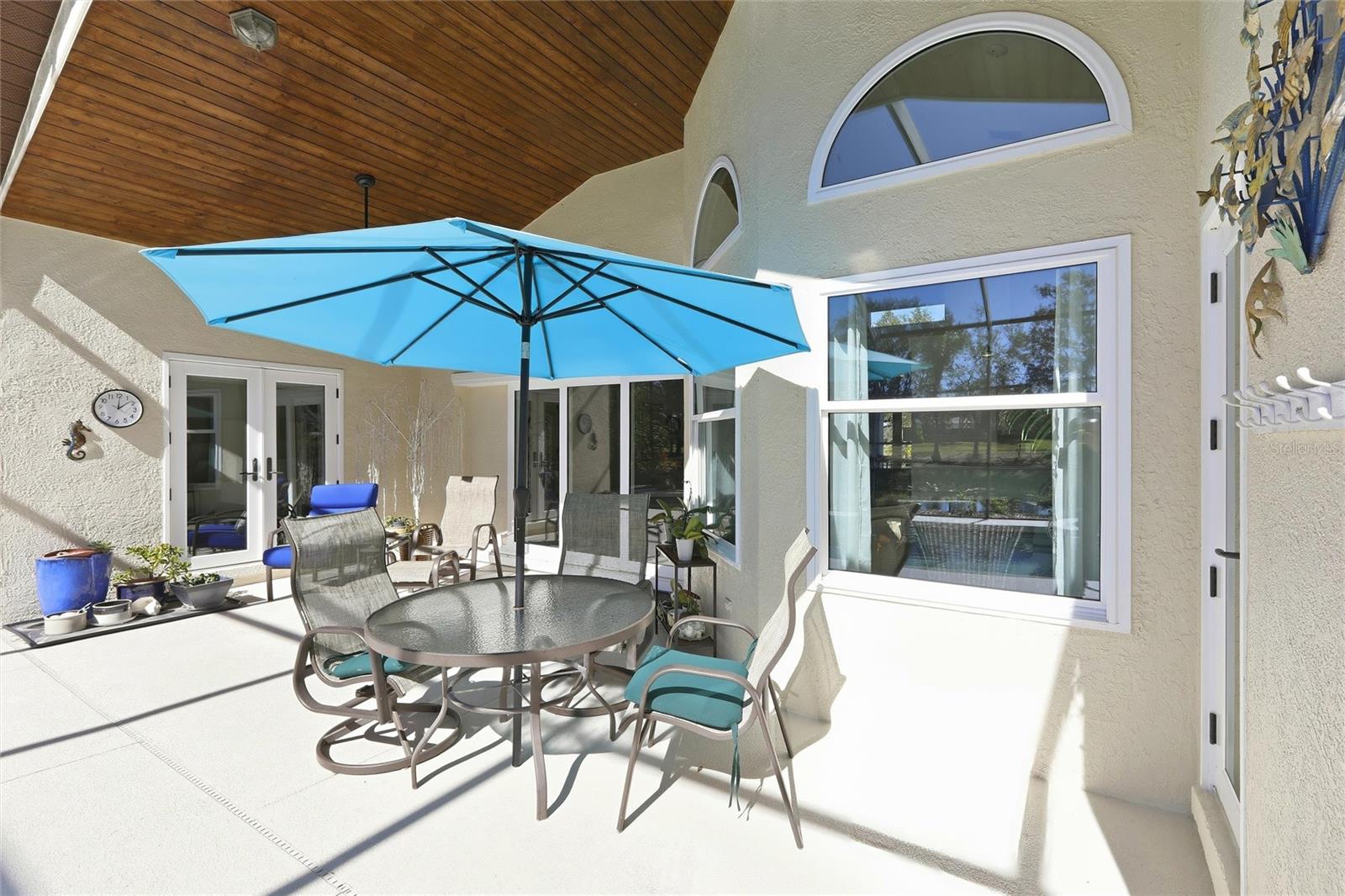 - Open Living Area: The great room features 13' vaulted ceilings, a wood-burning fireplace, and a media center with a 55-inch LG TV. Expansive 10' sliding glass doors offer views of the lanai and pool.- Hurricane Prepared: Features hurricane-rated windows and doors, including Lexan panels for the front door. These upgrades earned an 80% insurance discount with the wind mitigation study. Insurance declaration is available for review.- Custom Kitchen: Equipped with custom birch plywood cabinetry, hardwood doors, and Silestone countertops. Premium features include a Franke SS sink, Kohler faucets, a Bosch 800 series quiet dishwasher, and a large pantry with slide-out shelves.- Primary Suite: Includes a sloped ceiling, French doors to the lanai, and a remodeled bathroom. The bath features sapele mahogany wood, a 5' x 10' beach-entry shower with dual showerheads, and Kohler brushed brass fixtures.- Additional Bedrooms: Two guest rooms with bamboo flooring and a fourth bedroom/office with vaulted ceilings.- Outdoor Living: A 39' x 14' heated pool and 6-person hot tub with Wi-Fi-connected Pentair controls. The lanai features a stained cedar T&G ceiling and a pool cage designed for 140 mph winds.- Garage & Utilities: A three-car garage with finished floors, insulated hurricane-rated doors, and upgraded attic access. Includes a Rheem heat pump water heater, water softener, and whole-house carbon filter.- Security & Tech: Ring security system with three outdoor cameras, Kichler LED path lighting, and a Wi-Fi-accessible Rainbird irrigation controller for the landscaped lot.