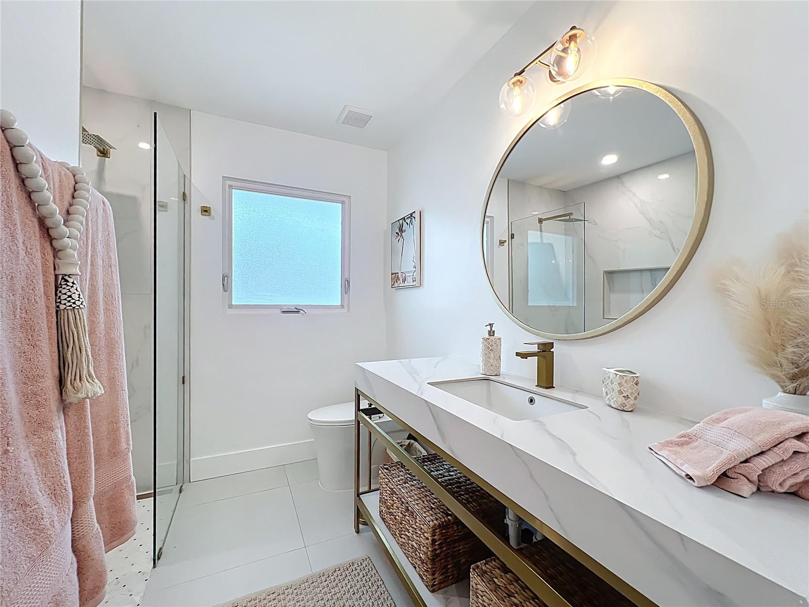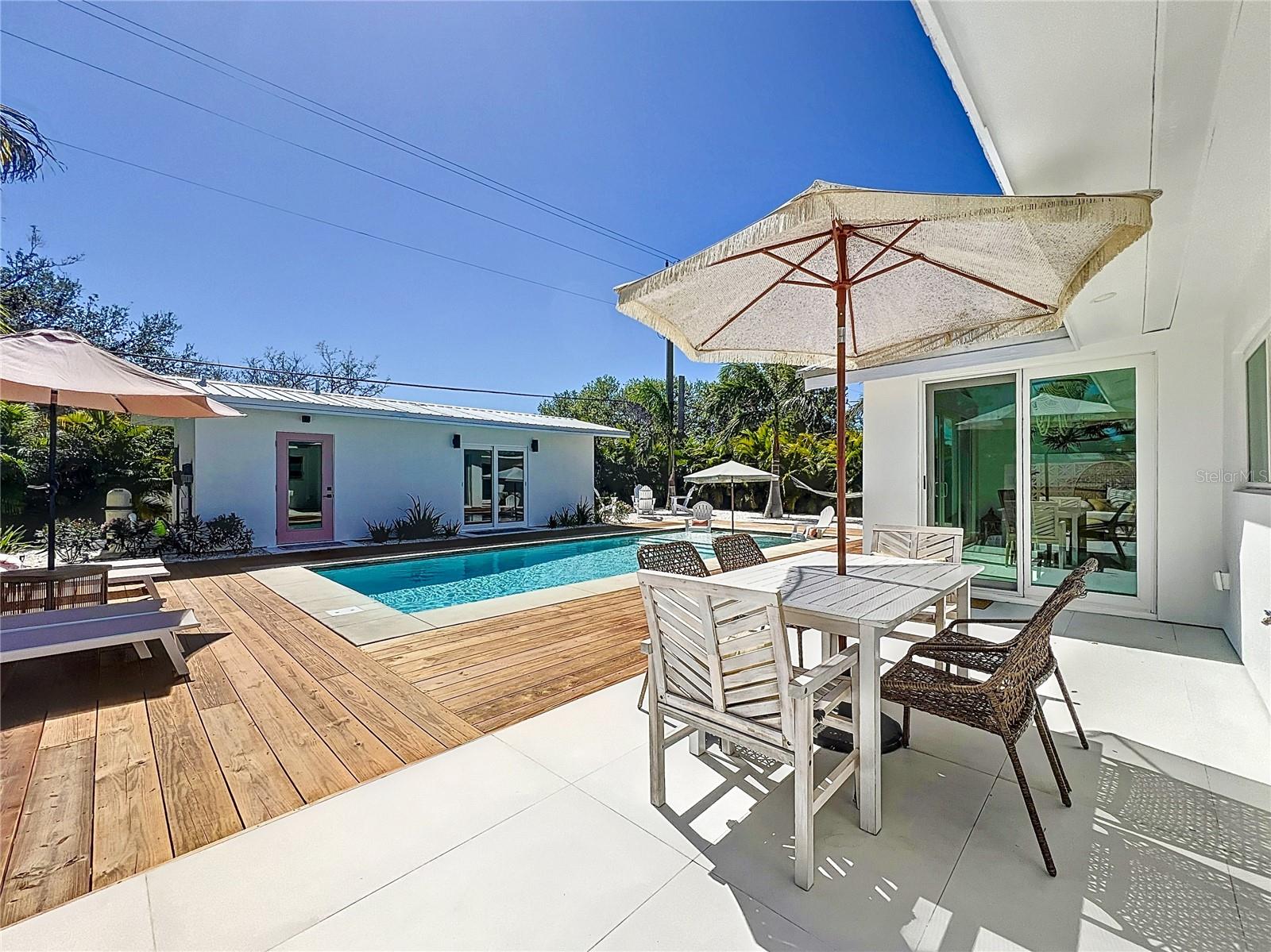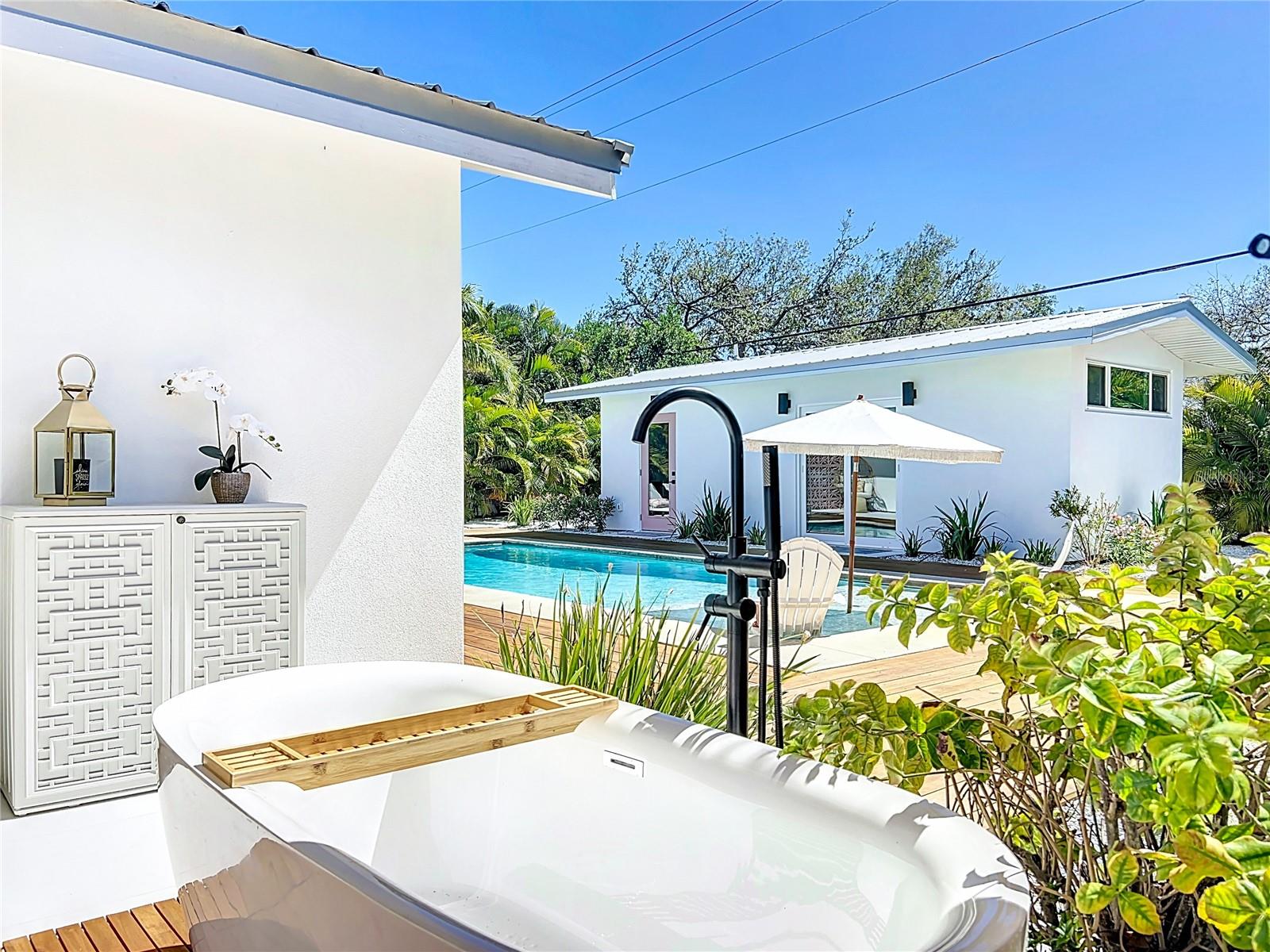 Guest House Home blends modern design with refined luxury, perfectly capturing Sarasota's vibrant work-and-play lifestyle. Located on a desirable South Gate street just minutes from downtown Sarasota and world-famous, top-ranked Siesta Beach, this 3-bedroom, 3.5-bath Modern Main house and Guest house with Studio bedroom , living combo with Full bath is rich in artistic detail and upscale finishes. This Fully Rebuilt home welcomes you with an open-concept floor plan featuring soaring Vaulted ceilings and sleek porcelain tile floors. Walls of glass frame views of the Pool and lushly landscaped backyard, creating seamless indoor-outdoor living. The private outdoor oasis includes a heated pool with LED color lighting and a salt chlorine generator, expansive entertaining space. The tropical backyard is finished with low-maintenance Fully Landscaped with Mature Tropical Plantings, irrigation and lighting. The gourmet kitchen is a showstopper, featuring stainless steel appliances, a dramatic waterfall quartz island, and contemporary custom cabinetry--perfect for entertaining or everyday living. The primary retreat offers a spacious walk-in custom closet and a spa-like ensuite bath. Step out through sliding glass doors onto your private outdoor Soaking tub overlooking the pool and enjoy the beautifully illuminated night scape. Recent Renovations down to the studs with additions and complete home replacement of impact-rated Window and sliders, New Plumbing fixtures and lines,Tankless Water heaters, All new electrical with panel, New framing, Dry wall , Split air systems, Stucco, Salt water pool& Heater , New Tropical Zero maintenance Landscaping, irrigation & Lighting, completed in 2024. Centrally located near A-rated schools, shopping, downtown Sarasota, and Siesta Key Beach, this exceptional home truly has it all. No Hurricane Damage and not in flood Zone. 4 Point inspection done pre sale for pice of mind!Don't miss this opportunity--schedule your private showing today.