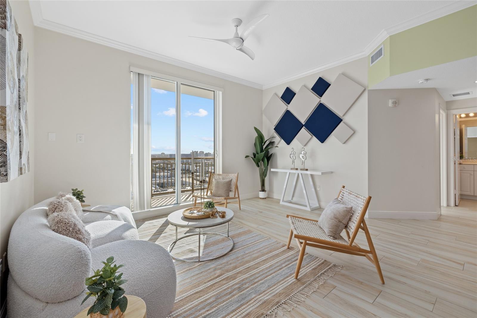 Discover luxury downtown Sarasota living in this impeccably renovated two-bedroom, two-bath high-rise condominium in the vibrant heart of downtown Sarasota. Offering refined coastal sophistication and modern design, this 15th-floor residence in the desirable south tower showcases breathtaking easterly city views and spectacular sunrises through expansive windows and soaring 11-foot ceilings. The open-concept layout is filled with natural light, blending elegance and functionality. Nearly every surface has been redesigned, creating a move-in-ready condominium defined by timeless finishes and comfort. A neutral palette enhances cohesion, while wood look porcelain tile flow throughout the entry into the kitchen, living and dining areas, high-end luxury vinyl plank flooring in bedrooms offers warmth of wood with durability ideal for Florida living. Detailed baseboards, designer paint, a statement bar tile wall, decorative lighting, ceiling fans and curated window treatments complete the interior. Extensive mechanical and smart-home upgrades include a new electric water heater, new air conditioner with dual ultraviolet filtration, Smart thermostat, Google Nest Pro Router, Moen Flo automatic water shutoff with leak detection, plus a new water pressure reduction valve, pressure gauge and expansion tank. The modern kitchen is designed for daily living and entertaining, featuring rich stone countertops, tile backsplash, solid cabinetry with new hardware, custom pullout shelving, an extra-deep cabinet above the refrigerator and an all new stainless-steel appliance package. A walk-in laundry room with built-in California Closets offers rare storage flexibility unique to this floor plan. The primary suite provides a private retreat with a walk-in closet and spa-inspired bath featuring a walk-in shower, garden tub and dual-sink vanity. The second bedroom, ideal as a den or office, is generously sized with two windows overlooking the cityscape, an attribute shared by every room. Alinari is an 18-story luxury high-rise offering refined plazas, fountains, a private recreational parcel and resort-style amenities. In 2025, enhancements were completed to the pool area, planters, movie theater, game room and catering kitchen. The building features key-card entry, a redesigned lobby, 24-hour security and full front-desk services. In Flood Zone X and outside the floodplain, Alinari was engineered with reinforced concrete and deep pilings, with lobby and guest parking elevated approximately 17 feet above sea level. This residence includes a climate-controlled storage unit and two garage parking spaces on the second and third levels. The association maintains strong reserves with no current assessments. Amenities include on-site management, secured parking, resort-style pool and spa, grilling area, club room, wine room, fitness center, saunas, business center, resident theater and guest suites. Positioned in Sarasota's cultural district, Alinari is moments from world-class arts, dining, waterfront promenades and evolving Sarasota Bay Park. Downtown Sarasota living meets effortless coastal convenience.
