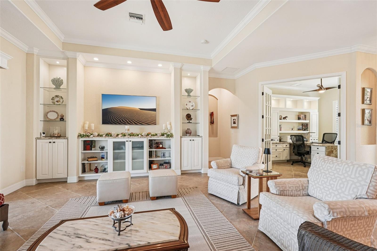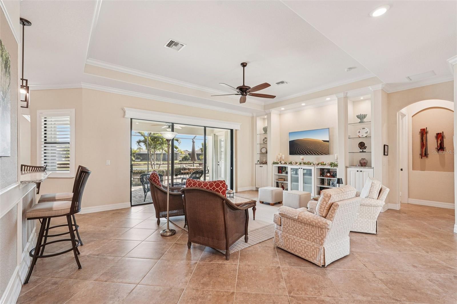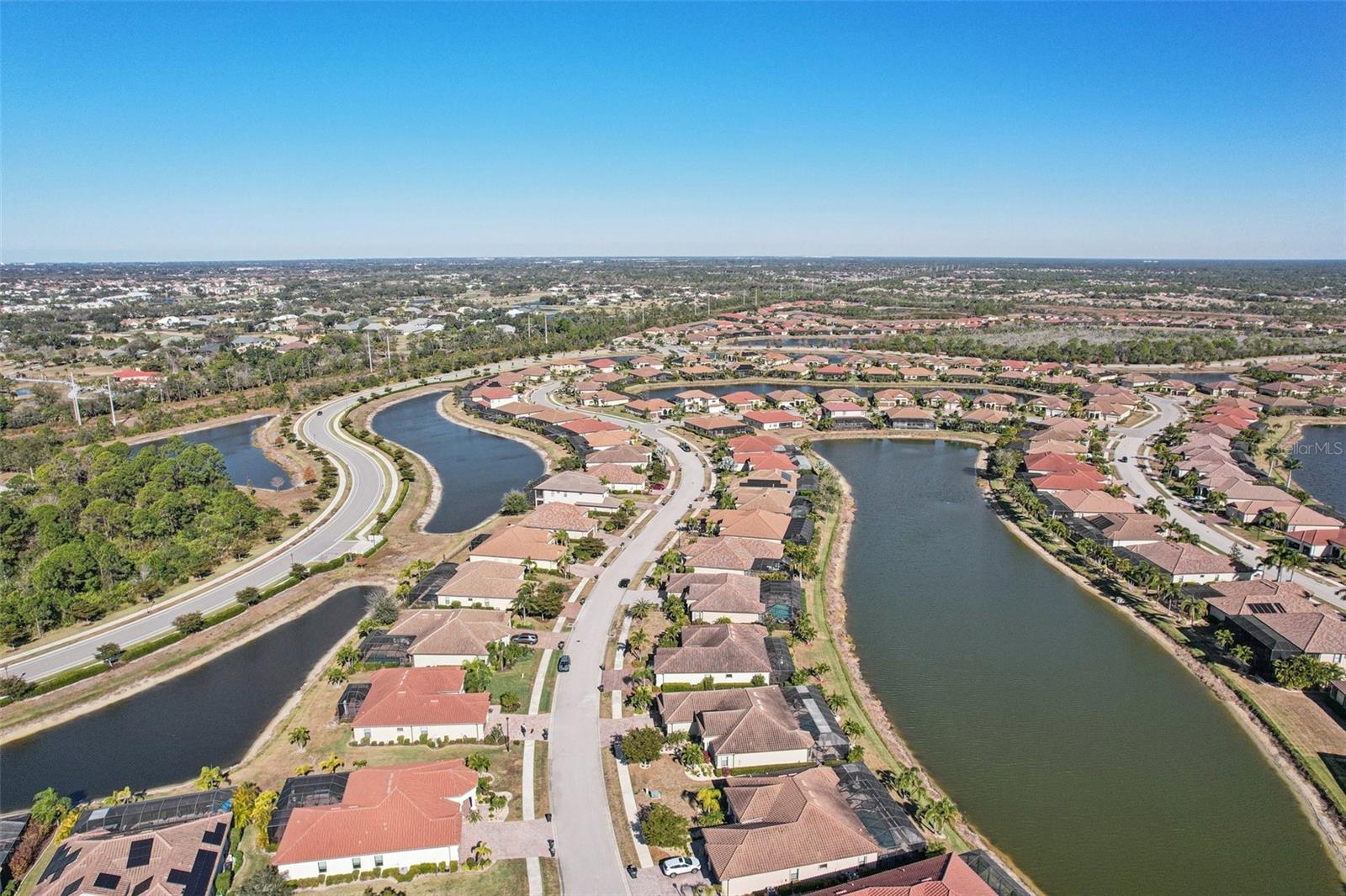 One or more photo(s) has been virtually staged. Elegant lake-front living in Wellen Park! This one owner 4 bedroom, 2.5 bath, 3-car garage Estate-series pool/spa Oakmont home is situated on a beautifully landscaped homesite with sweeping water views that will bring you hours of peace and tranquility. The owners have spared no expense in upgrading this magnificent residence. As you step into this beautiful home, you will love the open floor plan, abundance of natural light, soothing neutral color palette (recently custom painted inside and out!), high-end custom built-in cabinetry, crown molding, decorative moldings, tray ceilings, designer fixtures, Plantation shutters and exquisite tropical landscaping, including custom outdoor lighting and decorative curbing. Accordion hurricane shutters provide valuable peace of mind during storm season. The home features 10' ceilings and 8' doorways and a split layout that allows for privacy when family & friends come to visit. The flooring throughout your home is 20" porcelain tile on the diagonal (no carpet in the entire home!) The Chef's kitchen offers 42" wood cabinets, upgraded quartz countertops, custom backsplash, stainless-steel appliances, new Bosch dishwasher, built-in double ovens, pantry with a custom etched glass door and a breakfast area with a view. Enjoy your morning coffee at the breakfast bar, overlooking your spacious lanai and sparkling pool/spa, enjoying the serene lake view. Your Primary Bedroom Suite has a sitting area, access to the lanai & pool/spa, a large walk-in closet with luxurious custom built-ins and the En-Suite Master Bath offers dual vanities, a convenient walk-in shower and corner garden tub for relaxing baths. The adjacent wing of the home features 2 guest bedrooms that share a guest bath. There is another half-bath with pool access in your second guest bedroom. The 4th bedroom is utilized as a home office, complete with built-in cabinetry, granite countertops and waterfall desk, making it an ideal set-up for working at home. Your Great Room has a built-in wall unit with shelving and granite countertops (TV will stay!), another beautiful customization in this gorgeous residence. Step onto your lanai through the large sliding glass doors and enjoy Florida living with gentle breezes and chirping birds. The covered sitting area on your lanai is an Entertainer's paradise. Your generously sized pool and spa will provide many days and evenings of enjoyment. An oversized laundry room with utility sink and upgraded washer & dryer is just off of the 3-car garage. Your garage has been upgraded with insulated garage doors, attic access (pull-down aluminum stairs) and attic grid flooring. New water heater with circulating pump (instant hot water!). Gran Paradiso is an amenities-rich, maintenance-free community, situated in the master-planned Wellen Park area with restaurants, shopping, entertainment and the Atlanta Braves Spring Training stadium. Your new home is only 10 min away from the amazing Gulf beaches! Gran Paradiso residents enjoy a magnificent community pool, Tuscan-inspired Clubhouse, tennis, pickle ball, pool & card rooms, well-stocked library, state-of-the art fitness center, sauna/steam rooms, massage room & a myriad of activities, organized by a full-time Lifestyle Director. Gran Paradiso is golf-cart friendly and offers fabulous neighborhood events. This home is not in a flood zone and doesn't require flood insurance. Leave the cold Northern winters behind and enjoy life in paradise!