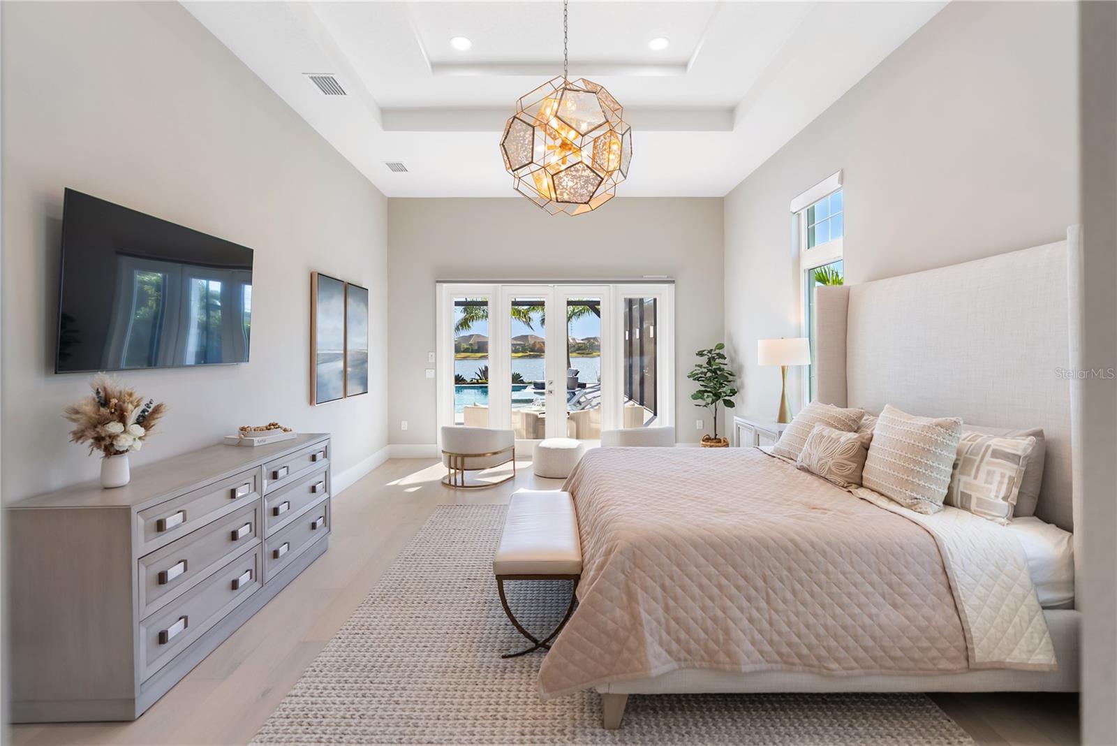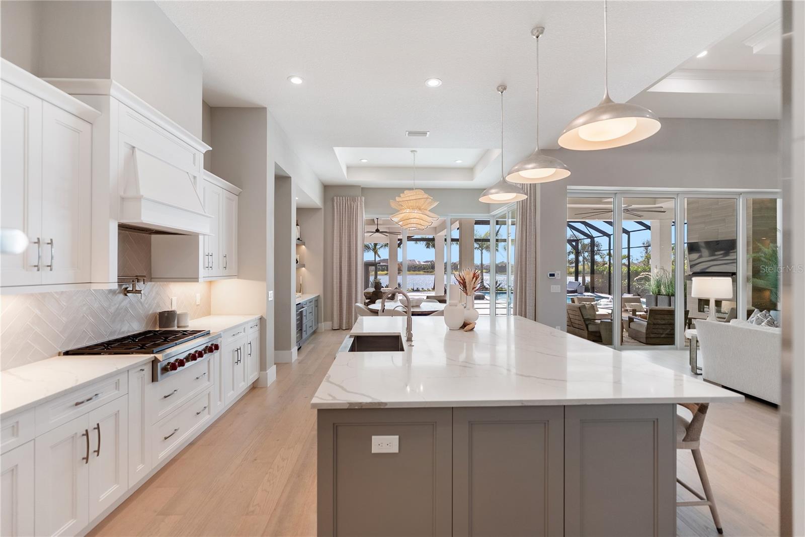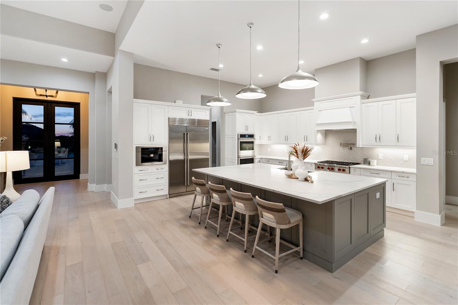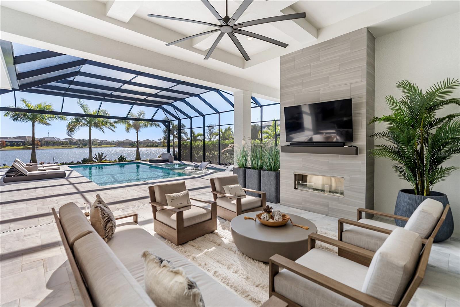 Welcome to an architecturally refined estate built in 2023 by the renowned Stock Luxury Homes, set on a nearly half-acre lakefront homesite in the prestigious The Lake Club. Professionally curated by Pizzazz Interiors, this single-story residence offers five bedrooms, five and a half baths, and an exceptional blend of luxury, technology, and indoor-outdoor living.From the moment you enter through grand 10-foot iron double doors, the home makes a striking impression. Engineered hardwood floors flow throughout, complemented by soaring ceilings with custom soffits and architectural detailing. Advanced smart-home features include motorized window shades, a full CAT5 hardwired system in every room, whole-home WiFi access points, integrated security cameras, and a six-zone SONOS sound system.The living area is anchored by a custom built-in media wall with accent lighting and expansive pocketing sliders that seamlessly connect the interior to the lanai. A dedicated office with French doors and designer wall treatments offers a refined workspace, while a versatile bonus room with an en-suite bath functions perfectly as a pool bath, guest suite, or flex space. The climate-controlled garage features epoxy flooring, and professionally designed landscaping creates a private tropical retreat.The chef's kitchen is designed for both everyday living and elevated entertaining, featuring an oversized quartz island with seating and storage, custom cabinetry, and elegant tile backsplash. A premium appliance suite includes JennAir appliances, an oversized Sub-Zero refrigerator, and a Wolf six-burner gas range. A walk-in pantry, plumbed Miele coffee maker, reverse-osmosis water system, and an elegant bar area with wine refrigerator complete the space.The primary suite is a private sanctuary with direct access to the lanai, a custom tray ceiling, and dual walk-in closets with bespoke built-ins. The spa-inspired bath features an oversized walk-in shower and refined finishes reminiscent of a luxury resort.Outdoor living is nothing short of exceptional. The marble-tile lanai showcases a gas fireplace, multi-color lighting, and a fully equipped outdoor kitchen with oversized grill, vent hood, sink, beverage refrigerator, and ice maker. A gas-heated saltwater pool and spa sit beneath a panoramic screened enclosure, perfectly positioned to capture tranquil lake views. A built-in mosquito misting system ensures year-round comfort.Adding rare flexibility is a detached private guest casita complete with kitchenette, refrigerator, and full bath--ideal for extended family, visiting guests, or a secluded retreat.*** An optional turnkey furnished package is available under a separate bill of sale, allowing for a seamless, move-in-ready lifestyle.***Residents of The Lake Club experience a resort-inspired lifestyle with multiple pools, a beautifully renovated clubhouse offering dining and bar service, comprehensive fitness and spa amenities, tennis and pickleball courts, a playground, dog park, and dedicated concierge services--all conveniently located near Lakewood Ranch's premier shopping and dining.This is more than a home--it is a statement of refined luxury and effortless Florida living at its finest.
