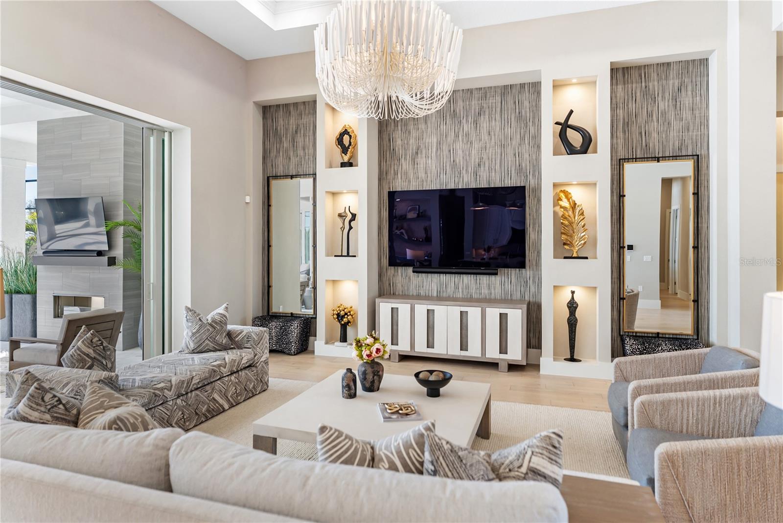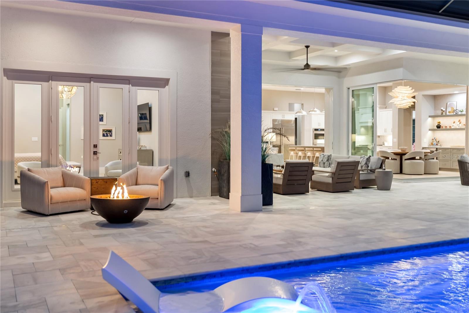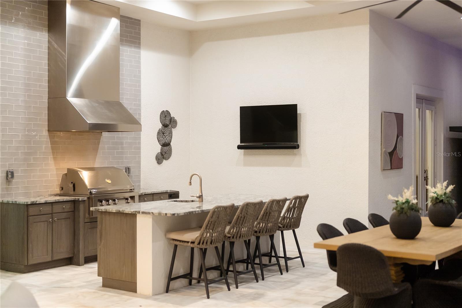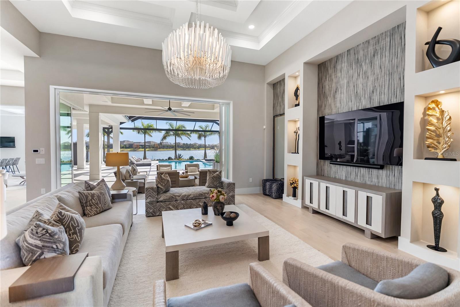 Welcome to an architecturally refined estate built in 2023 by the renowned Stock Luxury Homes, set on a nearly half-acre lakefront homesite in the prestigious The Lake Club. Professionally curated by Pizzazz Interiors, this single-story residence offers five bedrooms, five and a half baths, and an exceptional blend of luxury, technology, and indoor-outdoor living.From the moment you enter through grand 10-foot iron double doors, the home makes a striking impression. Engineered hardwood floors flow throughout, complemented by soaring ceilings with custom soffits and architectural detailing. Advanced smart-home features include motorized window shades, a full CAT5 hardwired system in every room, whole-home WiFi access points, integrated security cameras, and a six-zone SONOS sound system.The living area is anchored by a custom built-in media wall with accent lighting and expansive pocketing sliders that seamlessly connect the interior to the lanai. A dedicated office with French doors and designer wall treatments offers a refined workspace, while a versatile bonus room with an en-suite bath functions perfectly as a pool bath, guest suite, or flex space. The climate-controlled garage features epoxy flooring, and professionally designed landscaping creates a private tropical retreat.The chef's kitchen is designed for both everyday living and elevated entertaining, featuring an oversized quartz island with seating and storage, custom cabinetry, and elegant tile backsplash. A premium appliance suite includes JennAir appliances, an oversized Sub-Zero refrigerator, and a Wolf six-burner gas range. A walk-in pantry, plumbed Miele coffee maker, reverse-osmosis water system, and an elegant bar area with wine refrigerator complete the space.The primary suite is a private sanctuary with direct access to the lanai, a custom tray ceiling, and dual walk-in closets with bespoke built-ins. The spa-inspired bath features an oversized walk-in shower and refined finishes reminiscent of a luxury resort.Outdoor living is nothing short of exceptional. The marble-tile lanai showcases a gas fireplace, multi-color lighting, and a fully equipped outdoor kitchen with oversized grill, vent hood, sink, beverage refrigerator, and ice maker. A gas-heated saltwater pool and spa sit beneath a panoramic screened enclosure, perfectly positioned to capture tranquil lake views. A built-in mosquito misting system ensures year-round comfort.Adding rare flexibility is a detached private guest casita complete with kitchenette, refrigerator, and full bath--ideal for extended family, visiting guests, or a secluded retreat.*** An optional turnkey furnished package is available under a separate bill of sale, allowing for a seamless, move-in-ready lifestyle.***Residents of The Lake Club experience a resort-inspired lifestyle with multiple pools, a beautifully renovated clubhouse offering dining and bar service, comprehensive fitness and spa amenities, tennis and pickleball courts, a playground, dog park, and dedicated concierge services--all conveniently located near Lakewood Ranch's premier shopping and dining.This is more than a home--it is a statement of refined luxury and effortless Florida living at its finest.