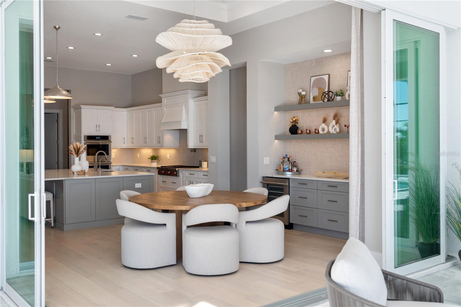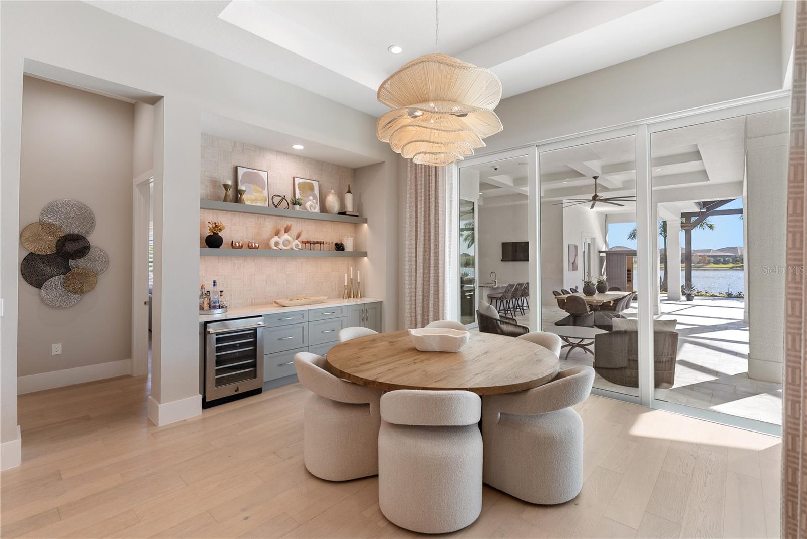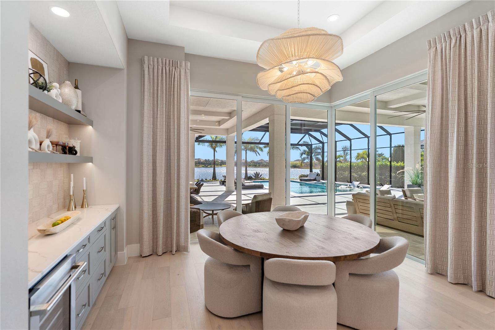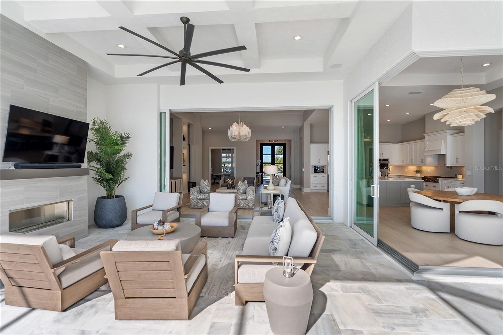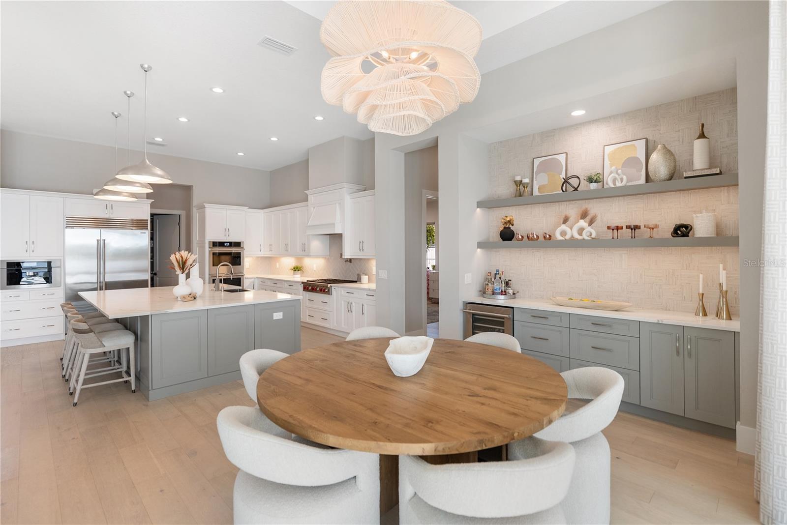 Welcome to an architecturally refined estate built in 2023 by the renowned Stock Luxury Homes, set on a nearly half-acre lakefront homesite in the prestigious The Lake Club. Professionally curated by Pizzazz Interiors, this single-story residence offers five bedrooms, five and a half baths, and an exceptional blend of luxury, technology, and indoor-outdoor living.From the moment you enter through grand 10-foot iron double doors, the home makes a striking impression. Engineered hardwood floors flow throughout, complemented by soaring ceilings with custom soffits and architectural detailing. Advanced smart-home features include motorized window shades, a full CAT5 hardwired system in every room, whole-home WiFi access points, integrated security cameras, and a six-zone SONOS sound system.The living area is anchored by a custom built-in media wall with accent lighting and expansive pocketing sliders that seamlessly connect the interior to the lanai. A dedicated office with French doors and designer wall treatments offers a refined workspace, while a versatile bonus room with an en-suite bath functions perfectly as a pool bath, guest suite, or flex space. The climate-controlled garage features epoxy flooring, and professionally designed landscaping creates a private tropical retreat.The chef's kitchen is designed for both everyday living and elevated entertaining, featuring an oversized quartz island with seating and storage, custom cabinetry, and elegant tile backsplash. A premium appliance suite includes JennAir appliances, an oversized Sub-Zero refrigerator, and a Wolf six-burner gas range. A walk-in pantry, plumbed Miele coffee maker, reverse-osmosis water system, and an elegant bar area with wine refrigerator complete the space.The primary suite is a private sanctuary with direct access to the lanai, a custom tray ceiling, and dual walk-in closets with bespoke built-ins. The spa-inspired bath features an oversized walk-in shower and refined finishes reminiscent of a luxury resort.Outdoor living is nothing short of exceptional. The marble-tile lanai showcases a gas fireplace, multi-color lighting, and a fully equipped outdoor kitchen with oversized grill, vent hood, sink, beverage refrigerator, and ice maker. A gas-heated saltwater pool and spa sit beneath a panoramic screened enclosure, perfectly positioned to capture tranquil lake views. A built-in mosquito misting system ensures year-round comfort.Adding rare flexibility is a detached private guest casita complete with kitchenette, refrigerator, and full bath--ideal for extended family, visiting guests, or a secluded retreat.*** An optional turnkey furnished package is available under a separate bill of sale, allowing for a seamless, move-in-ready lifestyle.***Residents of The Lake Club experience a resort-inspired lifestyle with multiple pools, a beautifully renovated clubhouse offering dining and bar service, comprehensive fitness and spa amenities, tennis and pickleball courts, a playground, dog park, and dedicated concierge services--all conveniently located near Lakewood Ranch's premier shopping and dining.This is more than a home--it is a statement of refined luxury and effortless Florida living at its finest.