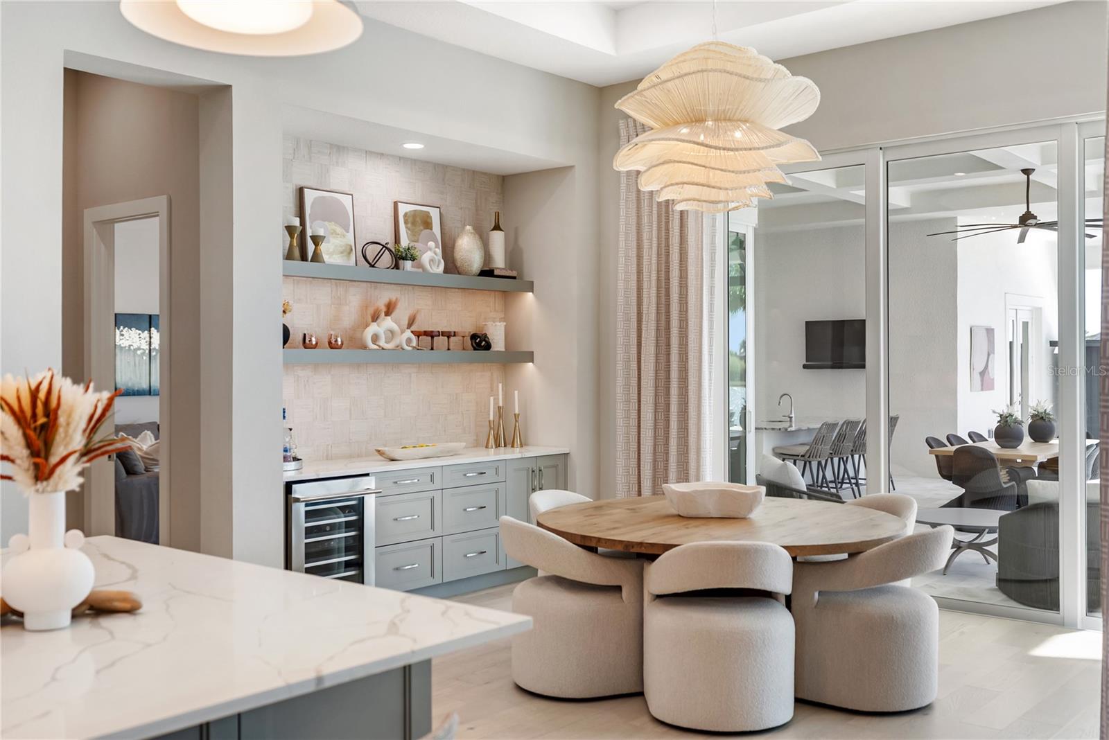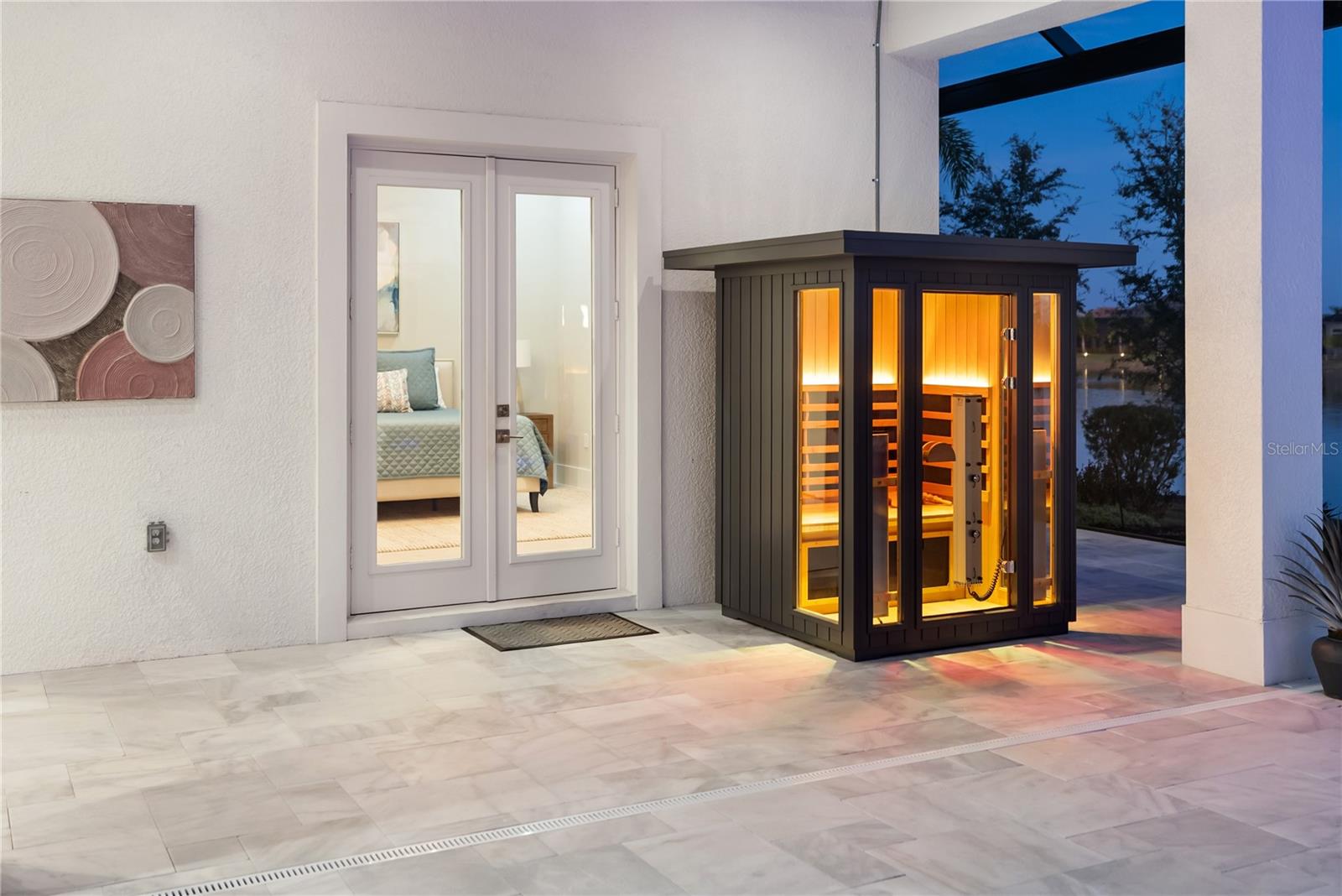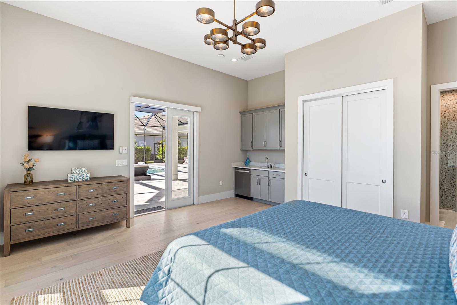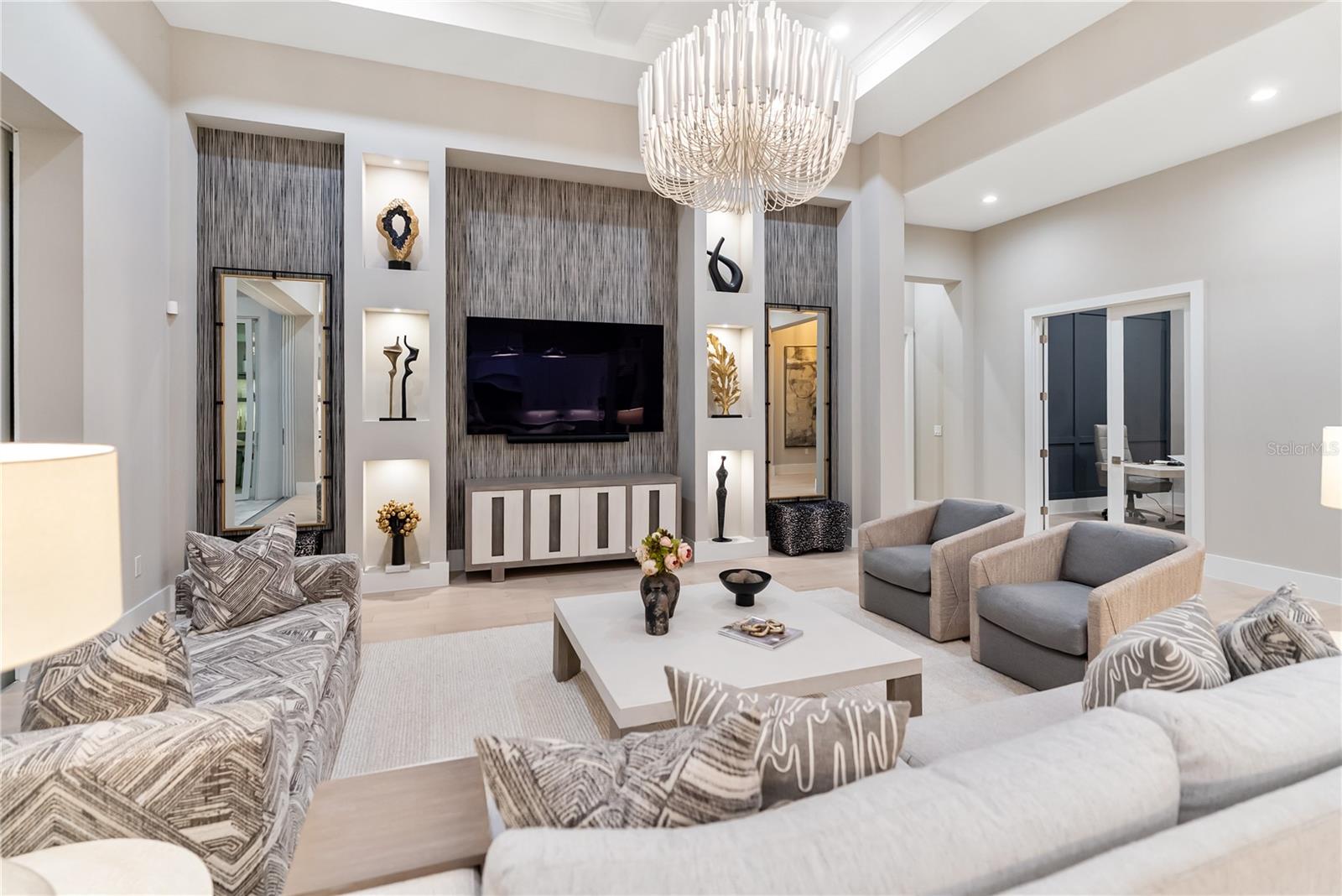 Welcome to an architecturally refined estate built in 2023 by the renowned Stock Luxury Homes, set on a nearly half-acre lakefront homesite in the prestigious The Lake Club. Professionally curated by Pizzazz Interiors, this single-story residence offers five bedrooms, five and a half baths, and an exceptional blend of luxury, technology, and indoor-outdoor living.From the moment you enter through grand 10-foot iron double doors, the home makes a striking impression. Engineered hardwood floors flow throughout, complemented by soaring ceilings with custom soffits and architectural detailing. Advanced smart-home features include motorized window shades, a full CAT5 hardwired system in every room, whole-home WiFi access points, integrated security cameras, and a six-zone SONOS sound system.The living area is anchored by a custom built-in media wall with accent lighting and expansive pocketing sliders that seamlessly connect the interior to the lanai. A dedicated office with French doors and designer wall treatments offers a refined workspace, while a versatile bonus room with an en-suite bath functions perfectly as a pool bath, guest suite, or flex space. The climate-controlled garage features epoxy flooring, and professionally designed landscaping creates a private tropical retreat.The chef's kitchen is designed for both everyday living and elevated entertaining, featuring an oversized quartz island with seating and storage, custom cabinetry, and elegant tile backsplash. A premium appliance suite includes JennAir appliances, an oversized Sub-Zero refrigerator, and a Wolf six-burner gas range. A walk-in pantry, plumbed Miele coffee maker, reverse-osmosis water system, and an elegant bar area with wine refrigerator complete the space.The primary suite is a private sanctuary with direct access to the lanai, a custom tray ceiling, and dual walk-in closets with bespoke built-ins. The spa-inspired bath features an oversized walk-in shower and refined finishes reminiscent of a luxury resort.Outdoor living is nothing short of exceptional. The marble-tile lanai showcases a gas fireplace, multi-color lighting, and a fully equipped outdoor kitchen with oversized grill, vent hood, sink, beverage refrigerator, and ice maker. A gas-heated saltwater pool and spa sit beneath a panoramic screened enclosure, perfectly positioned to capture tranquil lake views. A built-in mosquito misting system ensures year-round comfort.Adding rare flexibility is a detached private guest casita complete with kitchenette, refrigerator, and full bath--ideal for extended family, visiting guests, or a secluded retreat.*** An optional turnkey furnished package is available under a separate bill of sale, allowing for a seamless, move-in-ready lifestyle.***Residents of The Lake Club experience a resort-inspired lifestyle with multiple pools, a beautifully renovated clubhouse offering dining and bar service, comprehensive fitness and spa amenities, tennis and pickleball courts, a playground, dog park, and dedicated concierge services--all conveniently located near Lakewood Ranch's premier shopping and dining.This is more than a home--it is a statement of refined luxury and effortless Florida living at its finest.