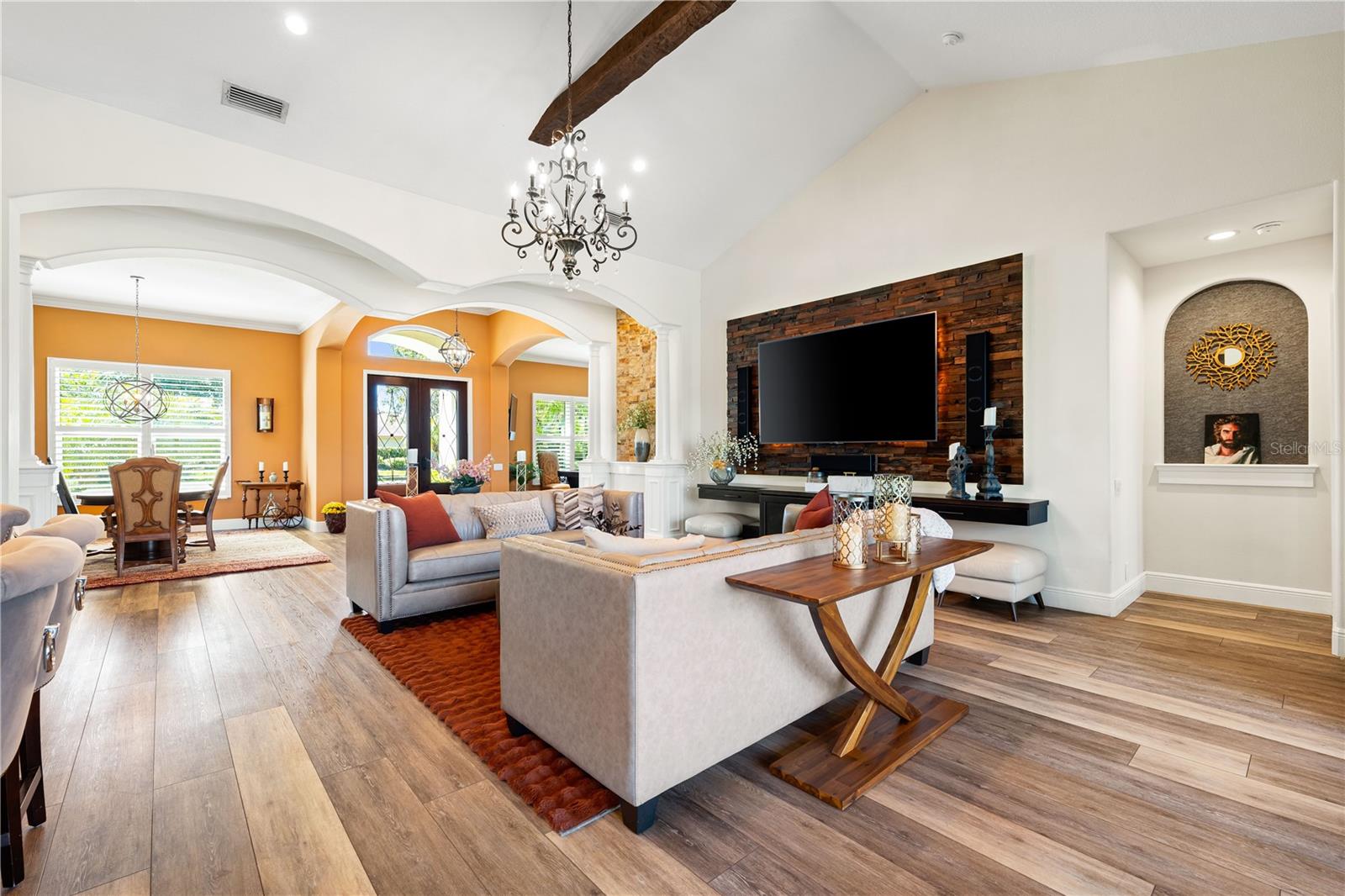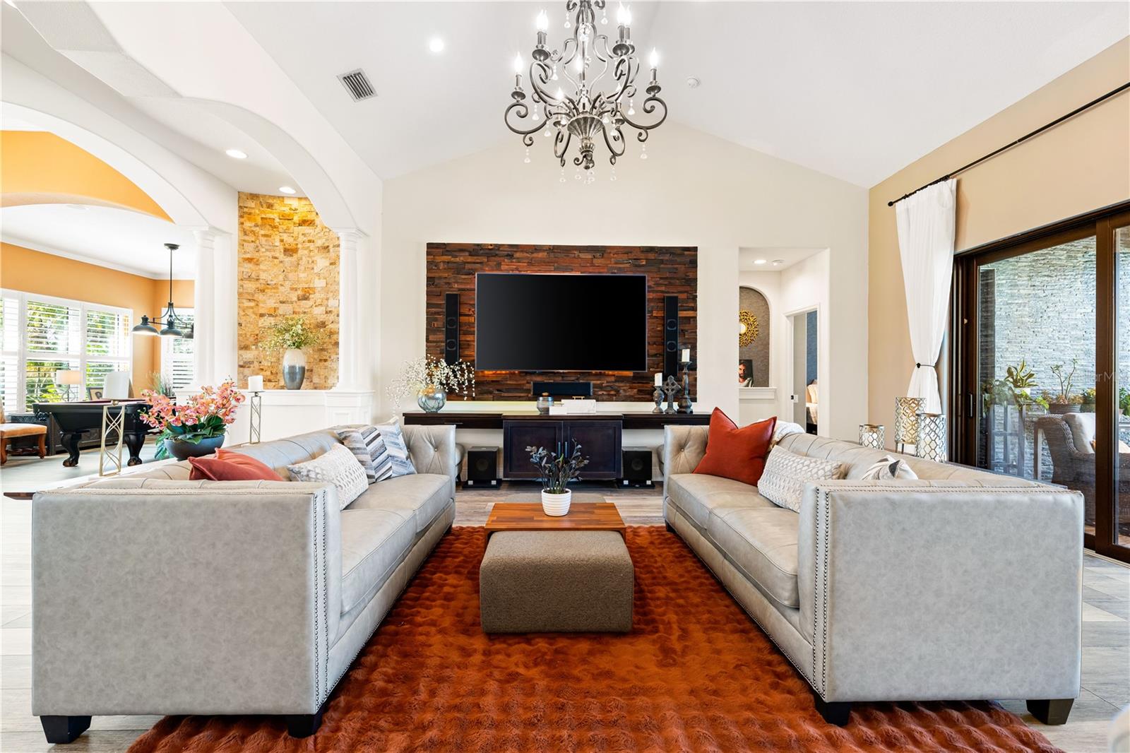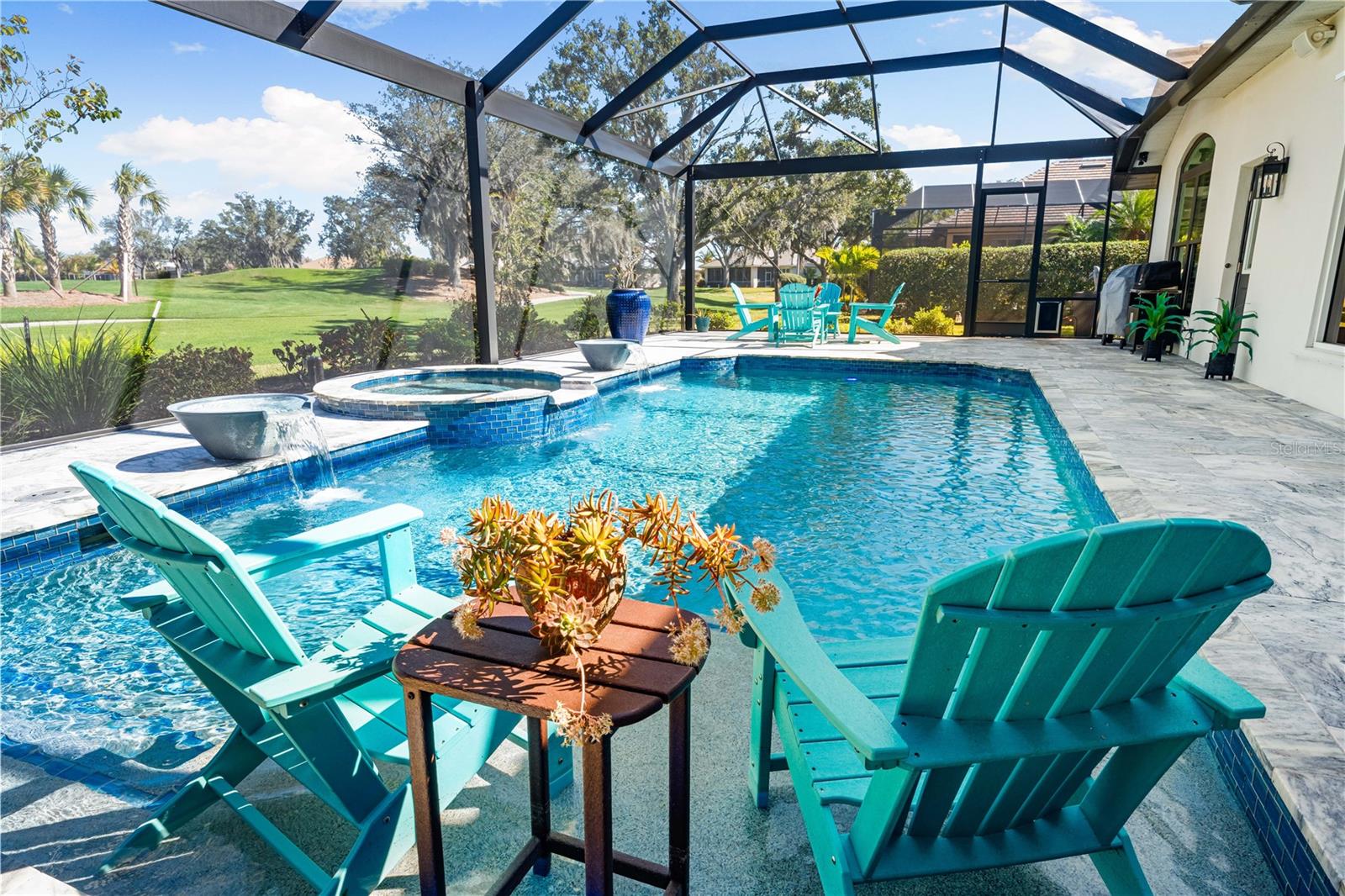 Welcome to this exceptional custom Arthur Rutenberg residence, thoughtfully updated with luxurious finishes throughout. This rare offering blends timeless architectural design, quality craftsmanship, privacy, and breathtaking golf course views--creating a serene setting for elevated Florida living. Perfectly positioned along the 8th hole of the Jones Golf Course, the home offers a tranquil backdrop for everyday living and entertaining. A dramatic arrival begins with a complete landscape redesign, professional lighting for privacy and evening ambiance, a pavered driveway and walkways, and modernized entry pillars. Enter through grand African mahogany doors into a striking interior featuring rich luxury wood flooring, wood beam accents, and an open flowing floor plan. A dramatic stone accent wall and custom niches define the main hallway, while redesigned living spaces throughout offer both elegance and versatility. The formal dining room showcases a dedicated wine cellar accented by a distinctive antique door. The game room provides flexibility and can also serve as a formal living room. The chef's kitchen is the heart of the home, featuring custom Magnolia cabinetry with quartz counters, a striking custom copper hood, an oversized six-burner gas range with double ovens and griddle, and two expansive islands with both main and prep sinks. High-end built-in appliances complete this incredible kitchen and include an integrated refrigerator, refrigerator drawers, warming drawer, two Bosch dishwashers, and an under-counter microwave drawer. The adjacent living area features a custom wood entertainment wall designed to accommodate a large television--ideal for hosting gatherings. The spacious primary suite offers a peaceful retreat with his-and-hers walk-in closets and a generously sized bath with dual vanities ready for personal customization. Two additional guest bedrooms are equally well-appointed plus a 4th bedroom currently being used as a den providing ideal living for family or guests. All guest bathrooms plus powder room have been completely updated with designer tile and custom vanities. Step outside to the stunning outdoor living area, where the pool and lanai were completely remodeled in 2023. Updated pool/lanai highlights include marble decking, a sun shelf, pool water features, a clear-view pool cage enclosure and a saltwater pool system including new equipment/gas heater. A decorative tile accent wall and wood-paneled ceiling complete this outdoor private oasis, offering unmatched tranquility with panoramic golf course views. Additional upgrades of this stunning home include hurricane-impact windows (2022), plantation shutters throughout, a new slate tile roof (2022), new AC (2024), hot water heater (2025), interior and exterior paint (2025), and a whole-house Kinetico water treatment system. Residents of Laurel Oak Estates enjoy the option to join the Laurel Oak Country Club, featuring two 18-hole championship golf courses, 12 Har-Tru tennis courts, six pickleball courts, a junior Olympic-size heated pool, a beautifully updated clubhouse, and an active social calendar. Reciprocal privileges with Bird Key Yacht Club, along with close proximity to I-75, downtown Sarasota, UTC Mall, medical facilities, dining, entertainment, and world-famous Siesta Key Beach, complete this lifestyle. This is resort-style living at its finest--offering privacy, serenity, and an unparalleled setting within one of Sarasota's premier gated communities.