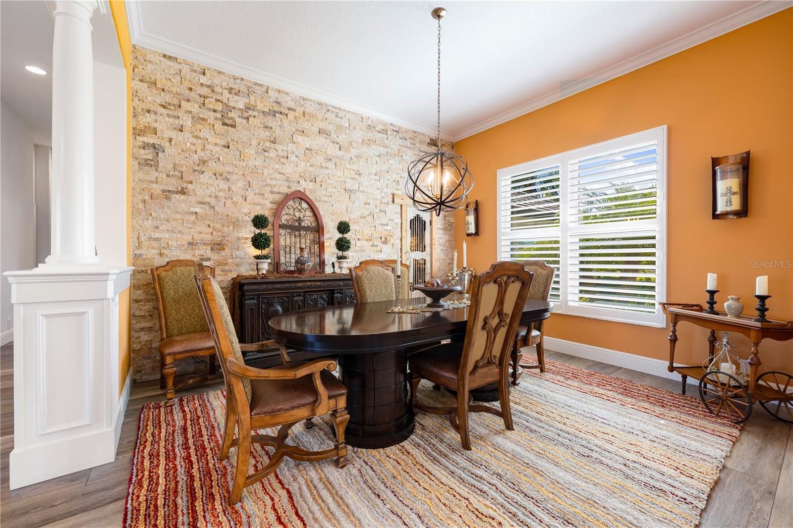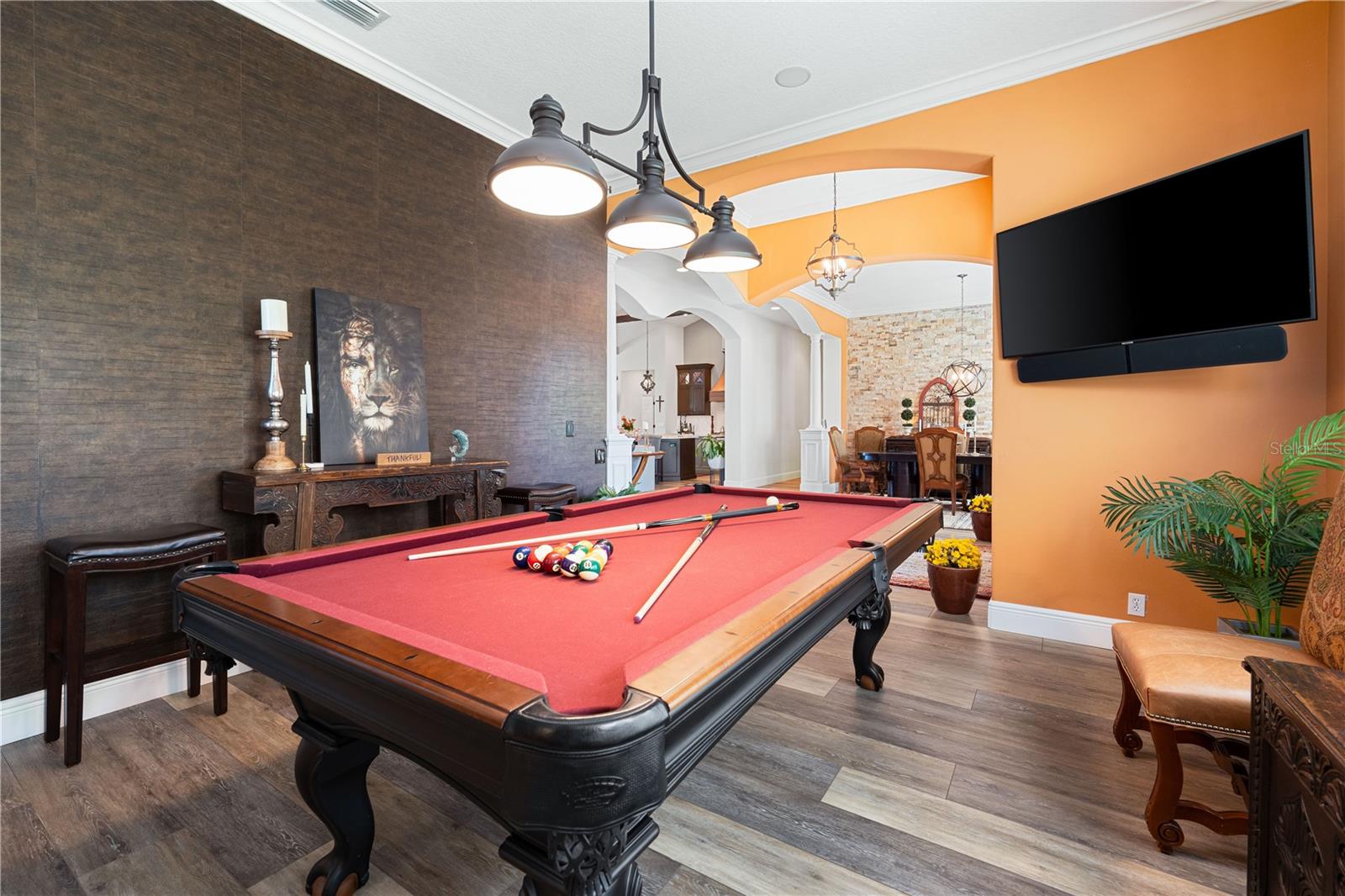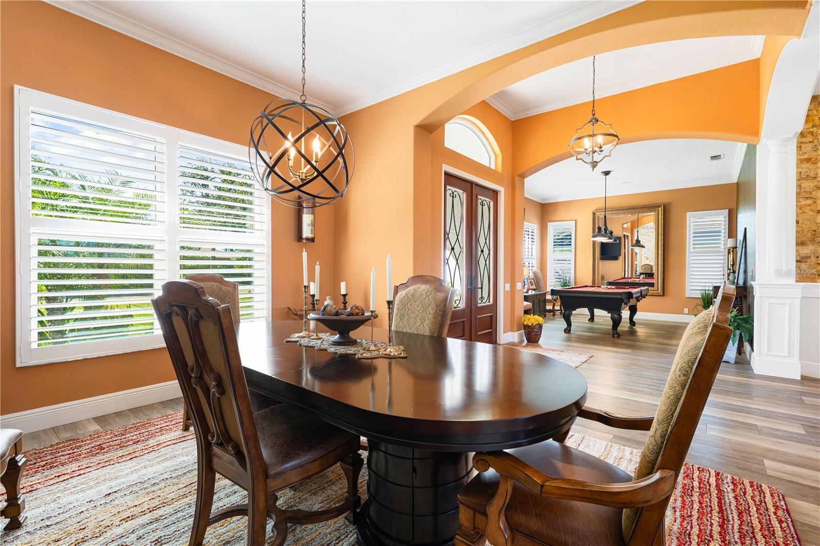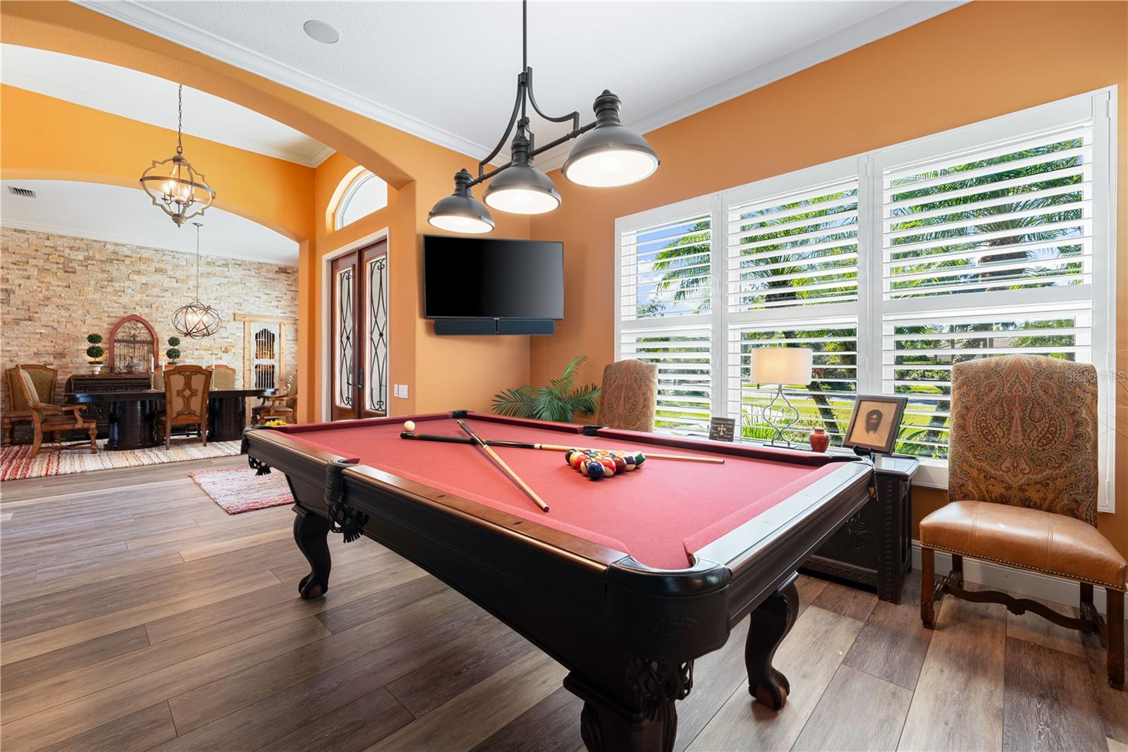 Welcome to this exceptional custom Arthur Rutenberg residence, thoughtfully updated with luxurious finishes throughout. This rare offering blends timeless architectural design, quality craftsmanship, privacy, and breathtaking golf course views--creating a serene setting for elevated Florida living. Perfectly positioned along the 8th hole of the Jones Golf Course, the home offers a tranquil backdrop for everyday living and entertaining. A dramatic arrival begins with a complete landscape redesign, professional lighting for privacy and evening ambiance, a pavered driveway and walkways, and modernized entry pillars. Enter through grand African mahogany doors into a striking interior featuring rich luxury wood flooring, wood beam accents, and an open flowing floor plan. A dramatic stone accent wall and custom niches define the main hallway, while redesigned living spaces throughout offer both elegance and versatility. The formal dining room showcases a dedicated wine cellar accented by a distinctive antique door. The game room provides flexibility and can also serve as a formal living room. The chef's kitchen is the heart of the home, featuring custom Magnolia cabinetry with quartz counters, a striking custom copper hood, an oversized six-burner gas range with double ovens and griddle, and two expansive islands with both main and prep sinks. High-end built-in appliances complete this incredible kitchen and include an integrated refrigerator, refrigerator drawers, warming drawer, two Bosch dishwashers, and an under-counter microwave drawer. The adjacent living area features a custom wood entertainment wall designed to accommodate a large television--ideal for hosting gatherings. The spacious primary suite offers a peaceful retreat with his-and-hers walk-in closets and a generously sized bath with dual vanities ready for personal customization. Two additional guest bedrooms are equally well-appointed plus a 4th bedroom currently being used as a den providing ideal living for family or guests. All guest bathrooms plus powder room have been completely updated with designer tile and custom vanities. Step outside to the stunning outdoor living area, where the pool and lanai were completely remodeled in 2023. Updated pool/lanai highlights include marble decking, a sun shelf, pool water features, a clear-view pool cage enclosure and a saltwater pool system including new equipment/gas heater. A decorative tile accent wall and wood-paneled ceiling complete this outdoor private oasis, offering unmatched tranquility with panoramic golf course views. Additional upgrades of this stunning home include hurricane-impact windows (2022), plantation shutters throughout, a new slate tile roof (2022), new AC (2024), hot water heater (2025), interior and exterior paint (2025), and a whole-house Kinetico water treatment system. Residents of Laurel Oak Estates enjoy the option to join the Laurel Oak Country Club, featuring two 18-hole championship golf courses, 12 Har-Tru tennis courts, six pickleball courts, a junior Olympic-size heated pool, a beautifully updated clubhouse, and an active social calendar. Reciprocal privileges with Bird Key Yacht Club, along with close proximity to I-75, downtown Sarasota, UTC Mall, medical facilities, dining, entertainment, and world-famous Siesta Key Beach, complete this lifestyle. This is resort-style living at its finest--offering privacy, serenity, and an unparalleled setting within one of Sarasota's premier gated communities.