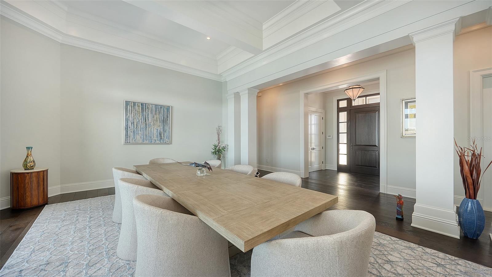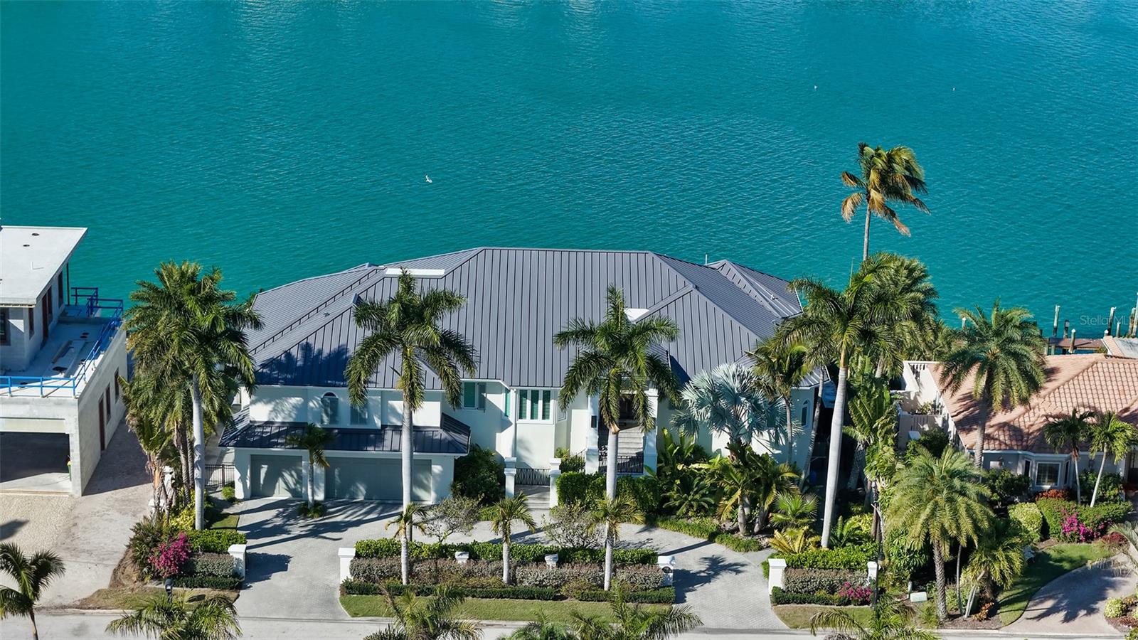 Perfectly poised on the coveted Bird Key, this custom-designed home graces a prime stretch of Sarasota Bay, where vibrant sunsets paint the sky each evening. Every element of its intelligent floor plan has been meticulously crafted for both grandeur and comfort, offering expansive bedroom suites, a dedicated office, and soaring ceilings that imbue every room with light and airiness. Walls of glass--with sweeping windows and sliding doors--uninterrupted vistas of the tranquil bay waters, inviting the beauty of nature indoors.The home's culinary centerpiece is a vast gourmet kitchen, ideal for entertaining, flowing into a casual yet refined living and dining space. The split floor plan ensures a private sanctuary for the primary suite, which includes its own office, a spa-like bath, and a generous walk-in closet. Outside, the meticulously landscaped grounds feature brick pavers and elegant double gates, leading to a rare six-car garage. Additional luxuries include an elevator and a private exercise room, ensuring every comfort is met.Beyond your doorstep, a swift drive over the iconic Ringling Bridge brings you to the cultural delights of downtown Sarasota. Or head west, just minutes to St. Armands Circle, pristine Gulf beaches, or the Longboat Key Club for world-class golf, tennis, and fine dining. At home, indulge in your private oasis: a large pool, hot tub, and a brand-new high-end dock for boating and water adventures, from kayaks to yachts. Anticipate even more refinement with the upcoming Bird Key Yacht Club in 2026, complete with tennis courts, a modern fitness center, and a waterfront restaurant, elevating the lifestyle to unmatched heights. This is more than a home; it's a premier sanctuary, waiting to be yours.