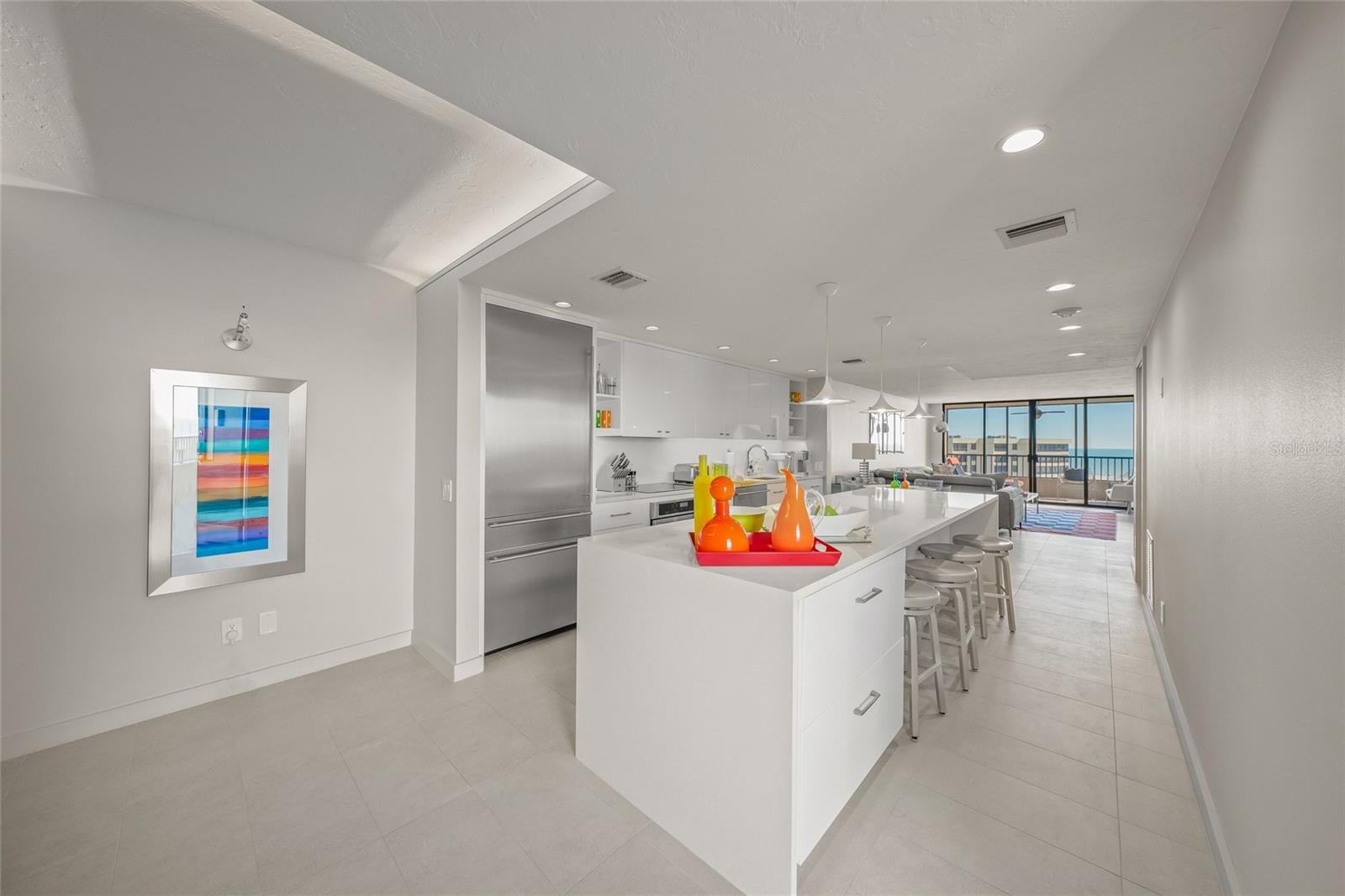 Poised above the world-famous quartz sands of Siesta Key, this penthouse-level residence delivers a front-row seat to the Gulf of Mexico--where breathtaking beach views, refined modern design, and resort-style living come together in one extraordinary coastal retreat.Welcome to 5750 Midnight Pass Road, Unit #704, a top-floor, move-in-ready condominium located within the prestigious Gulf & Bay Club. From the moment you enter, sweeping Gulf and shoreline vistas draw you through the open living space and out to the private balcony--an idyllic setting for morning coffee, sunset cocktails, and endless coastal breezes.The interior has been thoughtfully and completely remodeled to reflect today's most sought-after contemporary coastal aesthetic. Sleek Durastone porcelain tile flooring, solid core doors, plantation shutters, and crisp architectural lines create a polished, sophisticated atmosphere throughout. The chef-inspired kitchen is both stylish and functional, featuring white cabinetry, quartz countertops, built-in GE Monogram stainless appliances, recessed lighting, and statement pendants illuminating an oversized island with seating--perfect for entertaining against a backdrop of turquoise Gulf waters.The open-concept living and dining areas are flooded with natural light and designed to maximize the penthouse perspective. A versatile entry-side closet with a window offers flexibility as a potential workspace or owner's storage, enhancing the home's livability. Both bedrooms are generously sized to accommodate king beds, while the spa-inspired bathrooms showcase walk-in showers with floor-to-ceiling tile and refined modern finishes. A dedicated laundry room with full-size washer and dryer and custom storage completes the residence.Beyond the walls of this elegant retreat lies one of Siesta Key's most celebrated amenity collections. Set on 32 acres with 800 feet of private beach, Gulf & Bay Club offers an unmatched resort lifestyle with three swimming pools, six tennis courts, six pickleball courts, racquetball, basketball, shuffleboard, fitness center, saunas, indoor spa, multiple BBQ areas, and two clubhouses. Additional conveniences include EV charging stations, a car wash area, owner-only guest suite, 24-hour security, and Wi-Fi throughout the property--all within a beautifully maintained, gated setting.Perfectly located on iconic Siesta Key Beach and just minutes from dining, shopping, and entertainment, this penthouse residence offers a rare opportunity to own a luxury beachfront condo with panoramic views and modern upgrades!Unit #704 at Gulf & Bay Club isn't just a home--it's a lifestyle reserved for those who demand the very best of coastal living.
