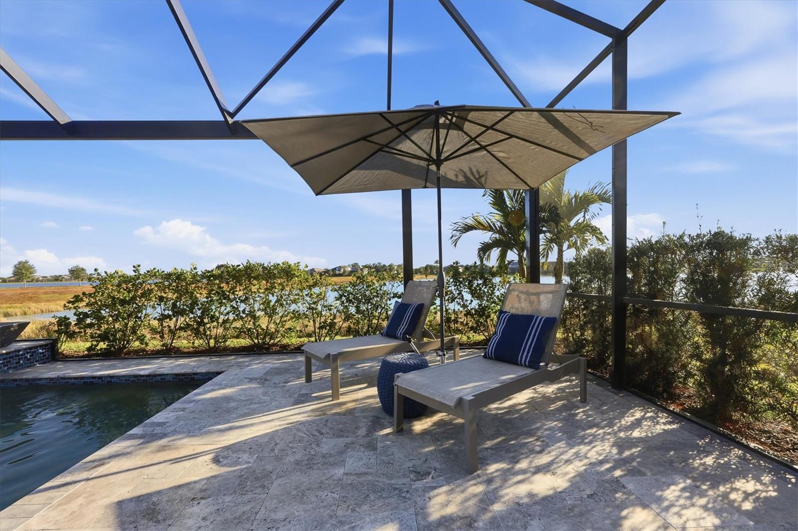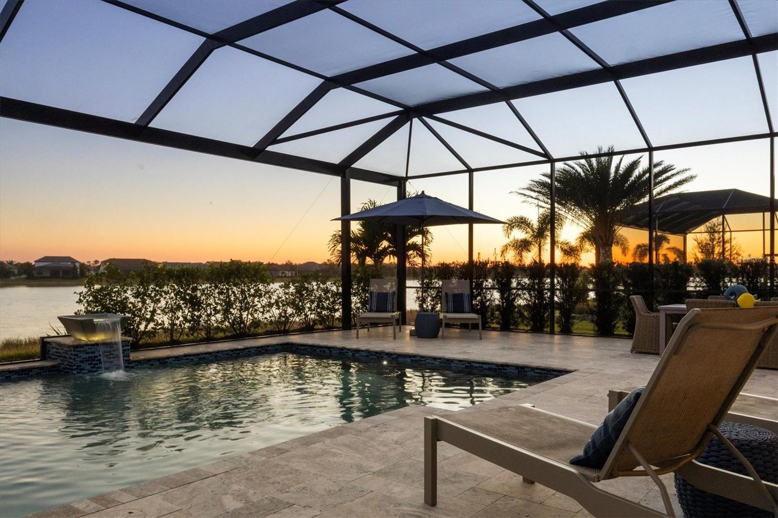 This beautifully appointed three-bedroom, three-bath plus den custom Pulte Pinnacle model showcases refined design, thoughtful upgrades, designer touches, and serene waterfront living in the highly desirable Shoreview community of Waterside. From the moment you arrive, the striking stone front faade, manicured landscaping and elegant glass entry door create a sophisticated first impression. Inside, tile flooring flows seamlessly throughout the home, complemented by modern designer lighting, stylish ceiling fans, tray ceilings, crown molding and curated architectural accents that elevate every space. The open-concept floor plan is designed for effortless entertaining and comfortable everyday living. The spacious great room features tray ceilings and pocketing sliding glass doors that fully open to the oversized lanai, blending indoor and outdoor living while framing stunning lake views. The adjacent dining area is positioned to enjoy natural light and water vistas, while the chef's kitchen serves as the heart of the home with KitchenAid and Whirlpool appliances, sleek cabinetry, and a large eat-at bar ideal for gatherings and casual dining. Go outside to your private Florida retreat where an expansive screened lanai overlooks tranquil water views. The heated saltwater pool and spa are set against a panoramic screen enclosure, creating a breathtaking backdrop of shimmering lake views. An outdoor kitchen enhances the space, making it ideal for alfresco dining and entertaining year-round. The primary suite is a peaceful sanctuary featuring a tray ceiling, large picture window overlooking the pool and lake, and a beautifully appointed spa-inspired bath with a spacious walk-in shower and refined finishes. One guest bedroom with stunning window-filled bump-out offers its en-suite bath, while the second guest bedroom is serviced by a dedicated full bath, providing privacy and comfort for family or visitors. The private den, accessed through double doors, features a tray ceiling and built-in designer cabinetry, ideal for a home office, library or creative space. Additional highlights include hurricane-rated windows for peace of mind, a spacious three-car garage with ample storage and meticulous landscaping that enhances the home's curb appeal. In Shoreview at Waterside, residents enjoy a resort-inspired lifestyle with access to a stunning clubhouse, state-of-the-art fitness center, resort-style pool and spa, tennis and pickleball courts, dog parks, playground and scenic walking trails along Kingfisher Lake. Waterside offers charming waterfront dining, boutique shopping, vibrant community events and picturesque views throughout the area, creating a dynamic yet peaceful setting. This exceptional residence offers a blend of luxury, comfort and community in one of Lakewood Ranch's sought-after neighborhoods.
