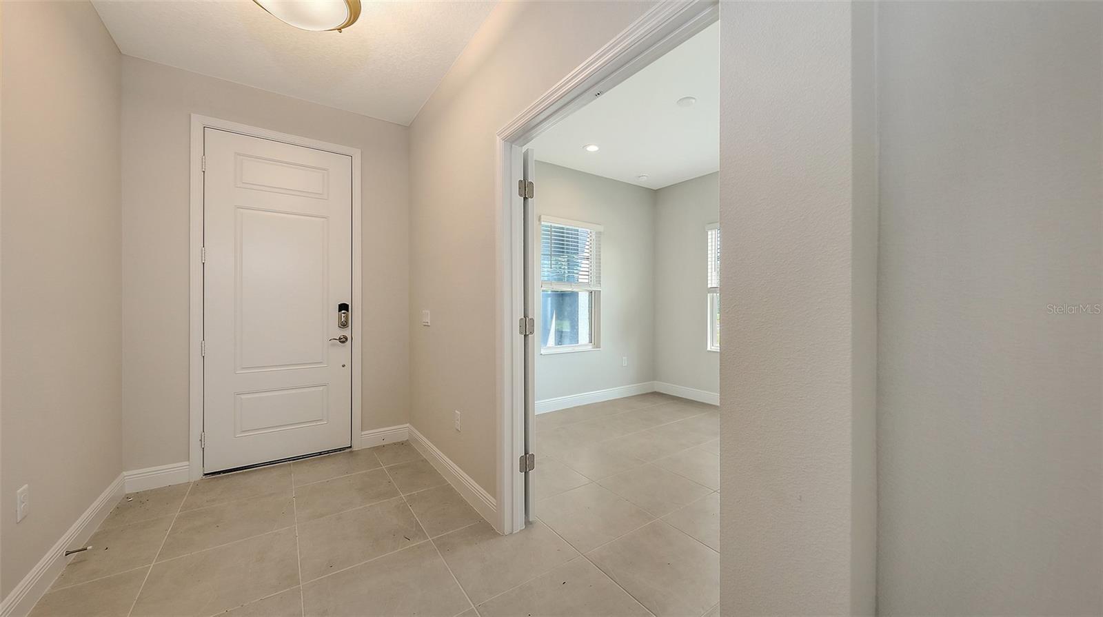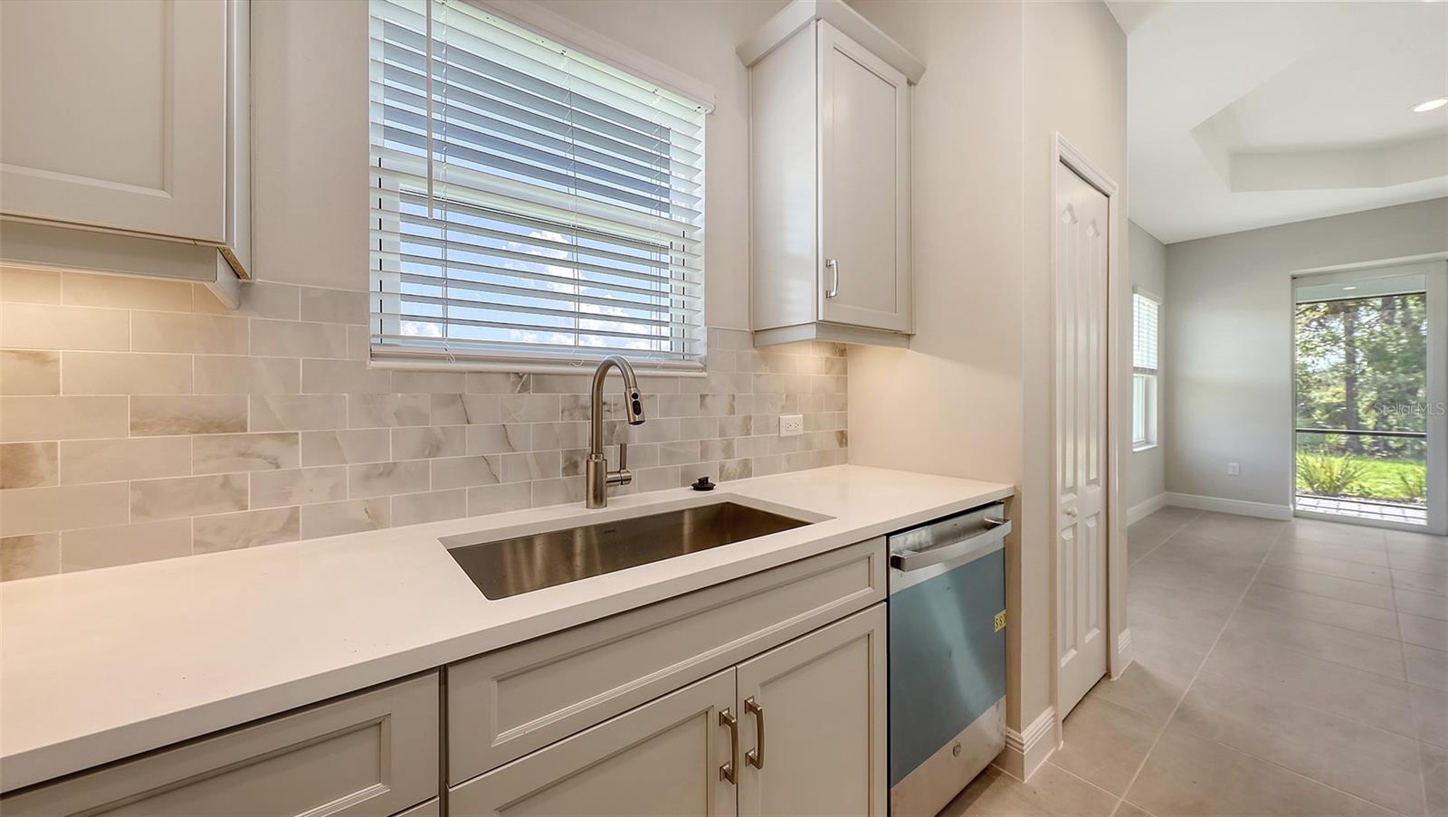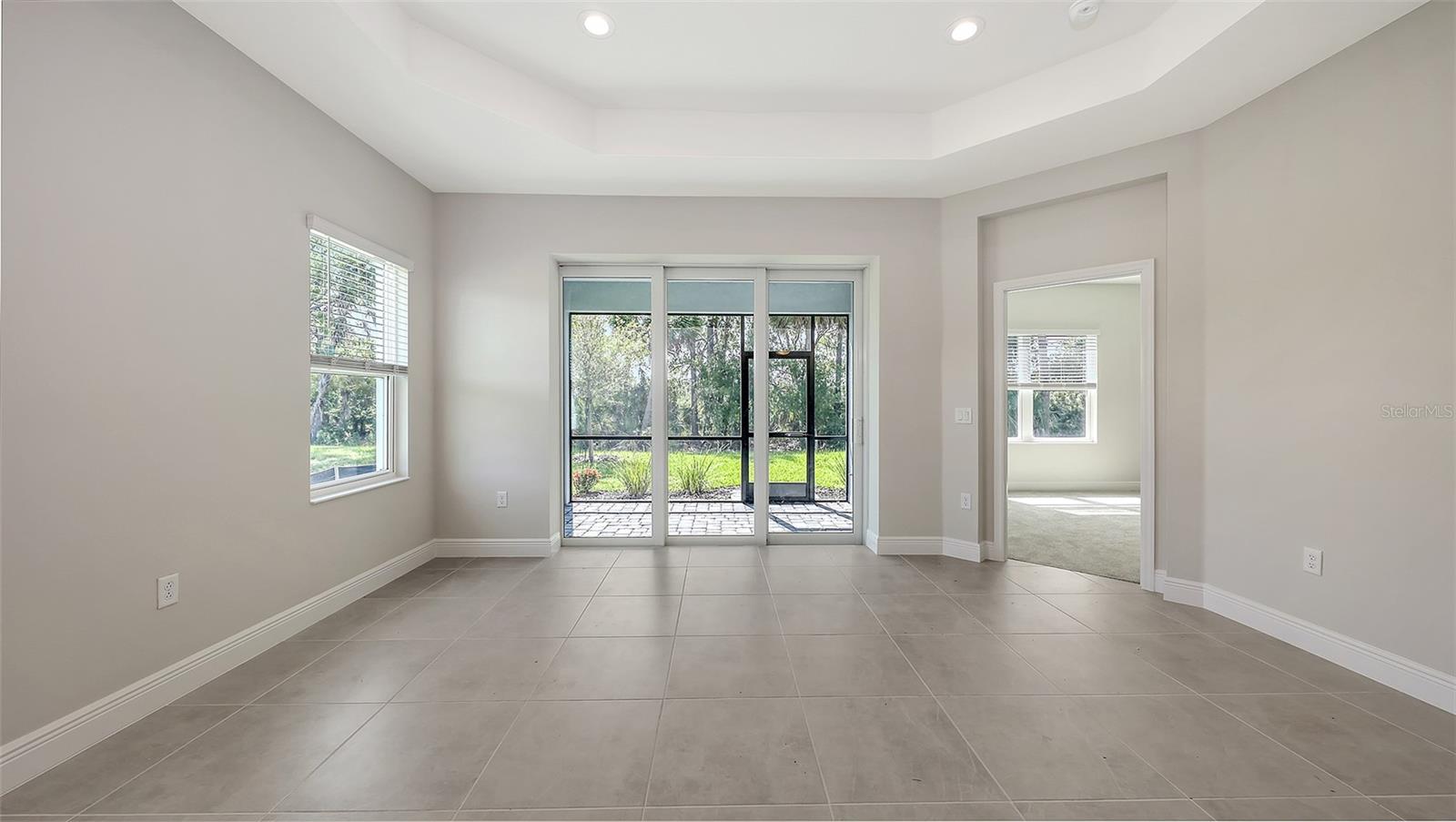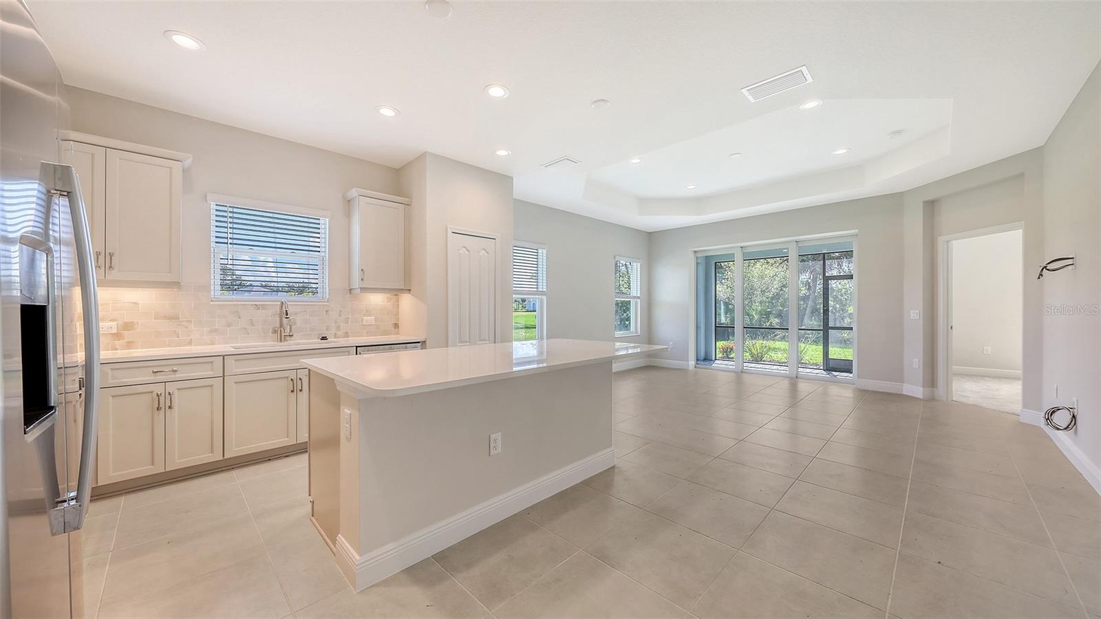 Airy and open, this Crystal Sand 2 paired villa offers 1,433 square feet of thoughtfully designed living space featuring two bedrooms, two bathrooms, a den, and a two-car garage. The open-concept great room and kitchen flow seamlessly to the screened lanai through pocket sliding glass doors, creating an ideal setting for indoor-outdoor living. A formal dining area provides a dedicated space for meals and entertaining.The primary suite features a bedroom window overlooking the lanai and includes two closets, one of which is a walk-in. The en-suite bath offers dual vanities, a walk-in shower, and a private water closet. This home provides a comfortable retreat well-suited for a small household or a seasonal residence.