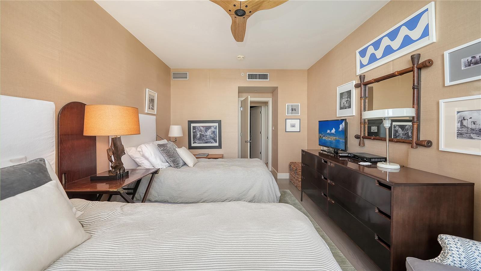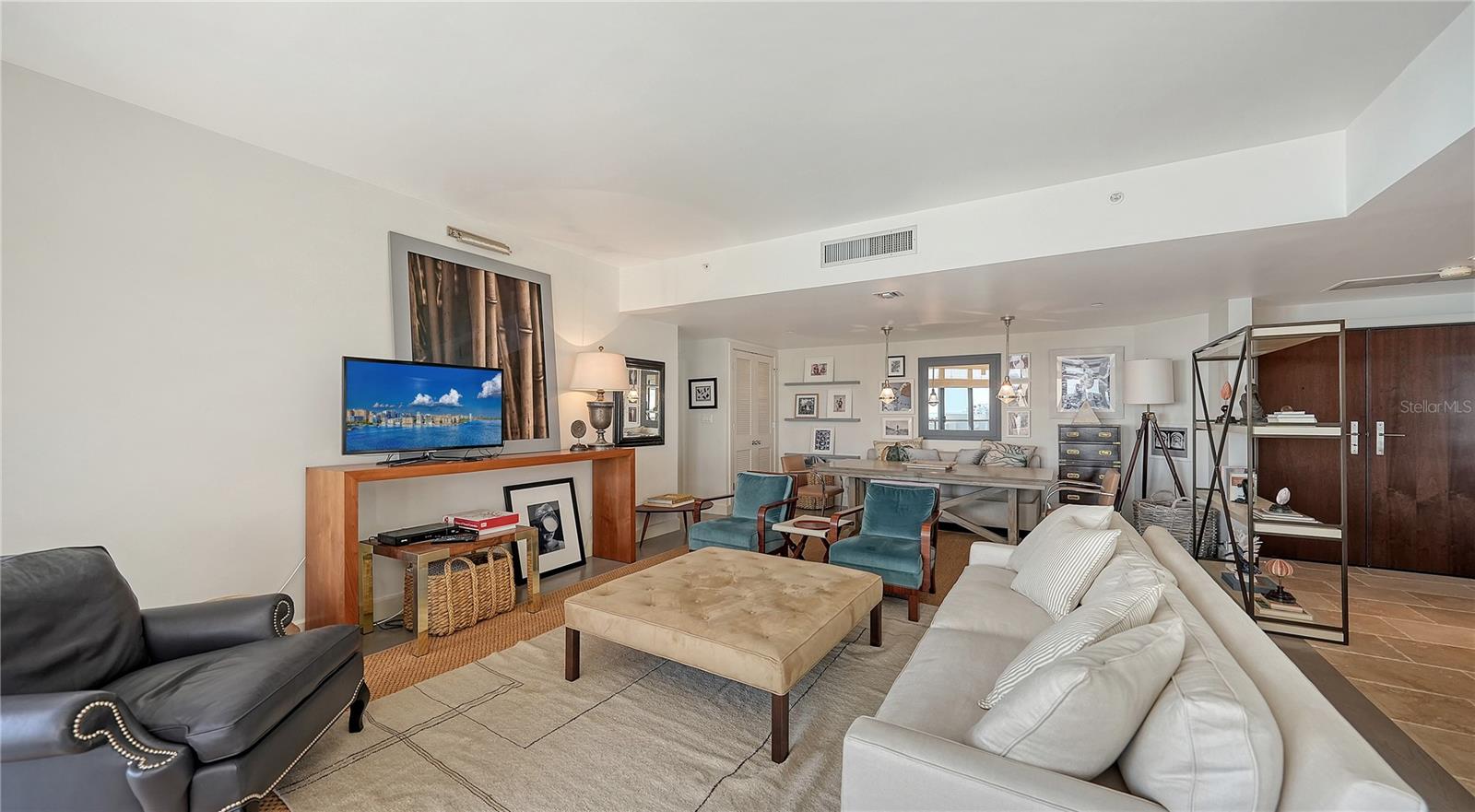 Positioned on the south side and sixth floor of The Promenade on Longboat Key, Residence #610 delivers a true move-in-ready coastal retreat with sweeping Gulf-to-bay views that unfold the moment you enter. From sunrises over Sarasota Bay to sparkling views across the Gulf of Mexico, nearly every room captures water vistas that define the island lifestyle.Offered fully furnished, this updated residence showcases a refined blend of travertine and rich wood flooring, crisp architectural lines, and an abundance of natural light pouring through expansive glass sliders. The open living and dining areas are framed by walls of glass that lead to the private terrace--an ideal vantage point for morning coffee overlooking the Gulf or evening relaxation with the shimmer of bay and downtown skyline vistas in the distance.The contemporary kitchen is thoughtfully designed with sleek surfaces, ample cabinetry, and generous counter space, flowing seamlessly into the main living areas for effortless entertaining. The bright ambiance continues into the bedrooms, where large windows highlight panoramic water and skyline views while maintaining a sense of privacy and comfort. The split-bedroom floor plan ensures privacy, with a spacious primary suite offering dual walk-in closets, terrace access, and an en-suite bath with dual sinks, soaking tub, separate shower, and private water closet. The guest suite includes a walk-in closet and its own en-suite bath, ideal for visitors or seasonal stays. Every detail reflects a residence that has been meticulously maintained and is ready for immediate enjoyment--whether as a full-time home or seasonal escape.The Promenade is a gated, Gulf-front community known for its exceptional amenities and attentive service. Residents enjoy a 24-hour manned guard gate, concierge services, on-site management, secure lobby, health club facilities for men and women, social rooms, four Har-Tru tennis courts, a Gulfside sundeck, and an oversized heated swimming pool and spa. A private boardwalk leads directly to the beach that elevate everyday coastal living.Situated on the south end of Longboat Key, The Promenade offers convenient access to the Longboat Key Club's golf and marina facilities (access is available with separate memberships), waterfront dining, and nearby shopping. St. Armands Circle and downtown Sarasota are just minutes away, where boutiques, theaters, art galleries, and renowned restaurants define the Cultural Coast lifestyle.Promenade #610 presents a rare opportunity to enjoy turnkey beachfront living with panoramic water views, resort-style amenities, and proximity to everything that makes Longboat Key and Sarasota so desirable.